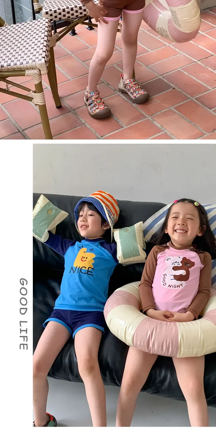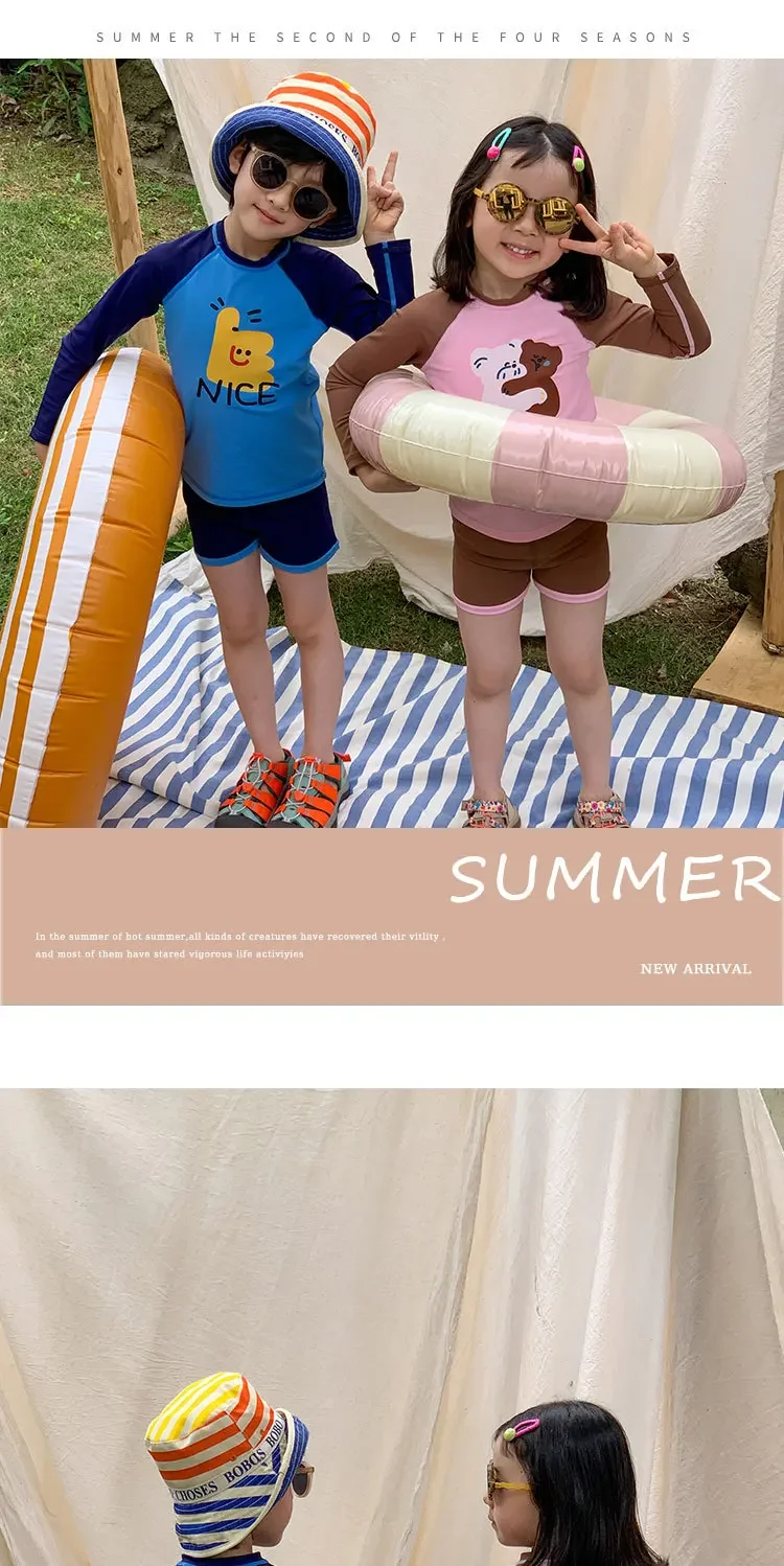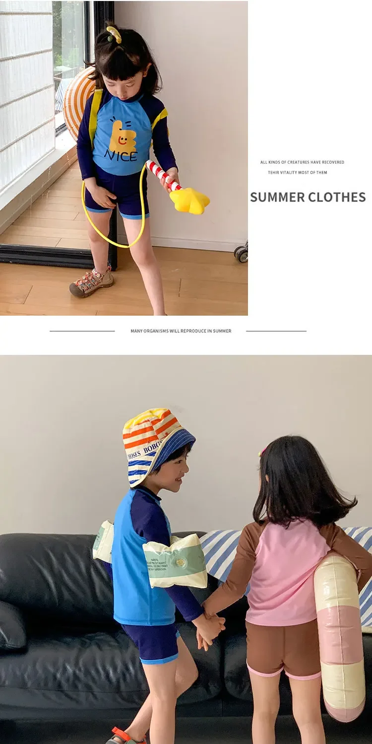 夏の水辺のレジャーにぴったりの、ユニセックス水着 プリント長袖トップスとショートパンツのスイムウェアセットです。可愛らしいカラーブロックとプリントデザインが特徴で、男の子も女の子も着こなせるおしゃれな一枚。
