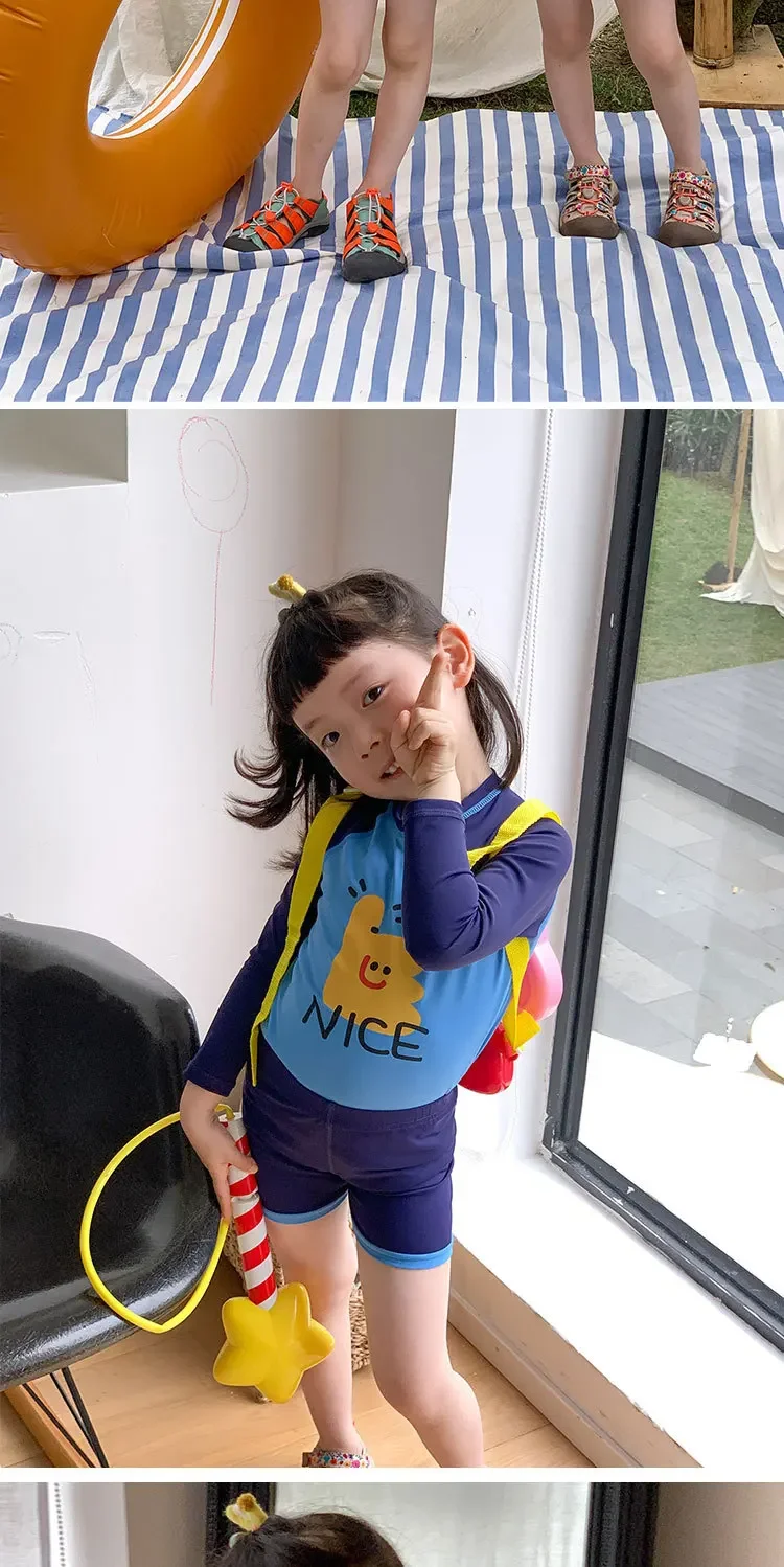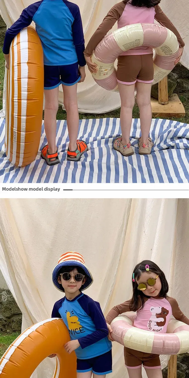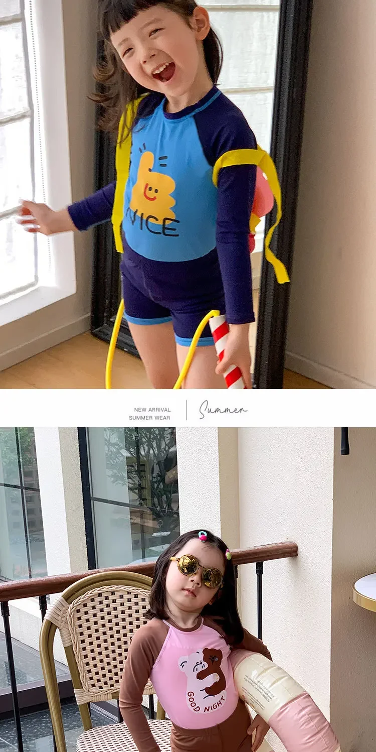 夏の水辺のレジャーにぴったりの、ユニセックス水着 プリント長袖トップスとショートパンツのスイムウェアセットです。可愛らしいカラーブロックとプリントデザインが特徴で、男の子も女の子も着こなせるおしゃれな一枚。