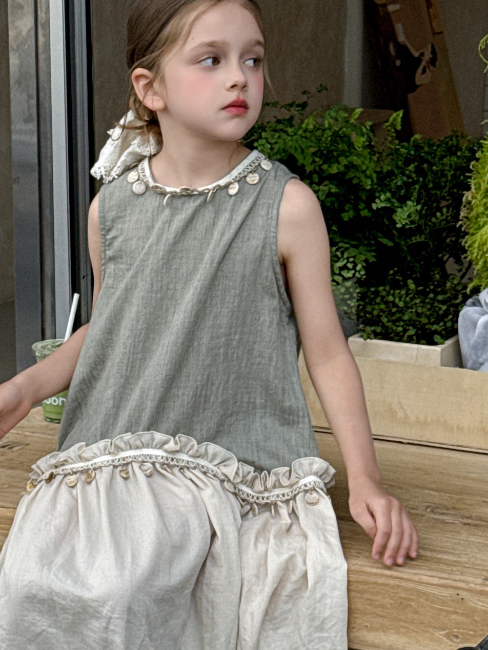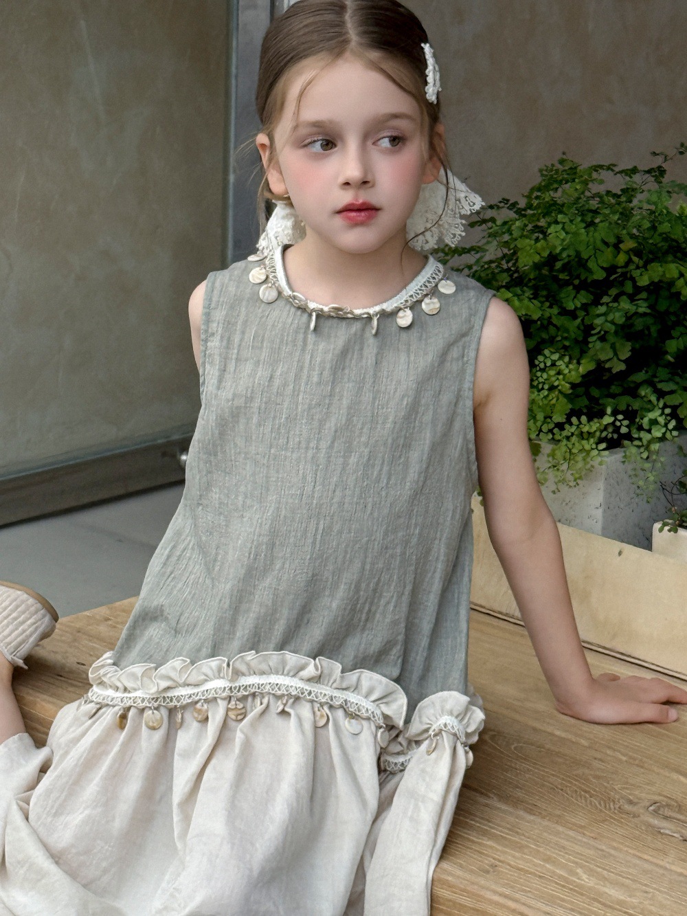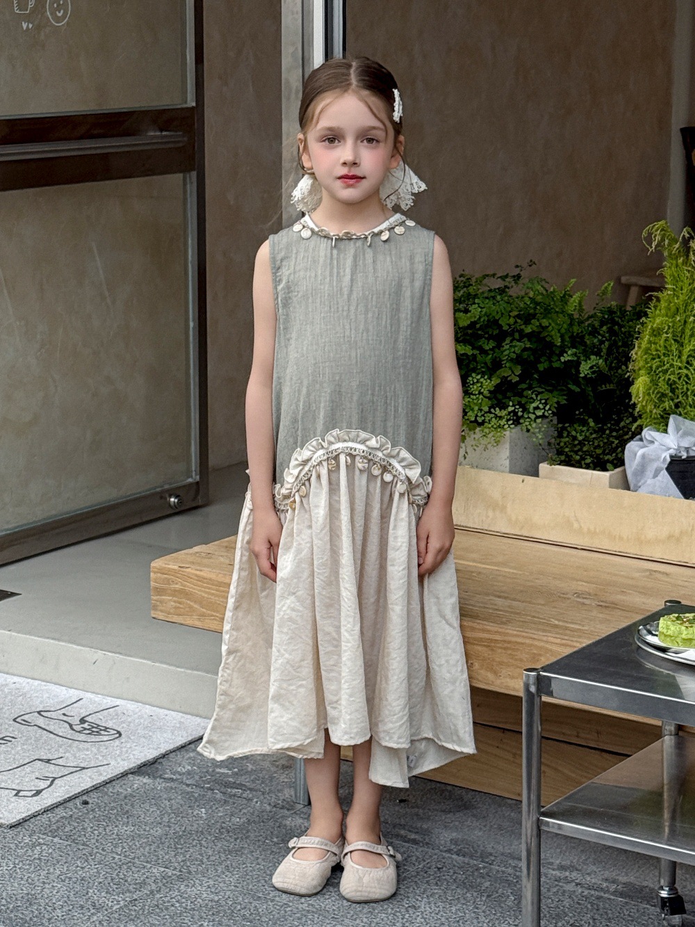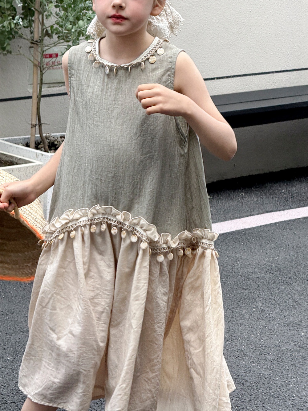 涼しげなノースリーブデザインで、暑い日でもお子さんは快適に過ごせます。最大の特徴は、胸元や裾にあしらわれたタッセルとフリル。コントラストカラーの組み合わせが、おしゃれで個性的な印象を与えます。ゆったりとしたシルエットで動きやすく、普段使いはもちろん、ビーチや旅行など、リゾートシーンにも活躍するでしょう。