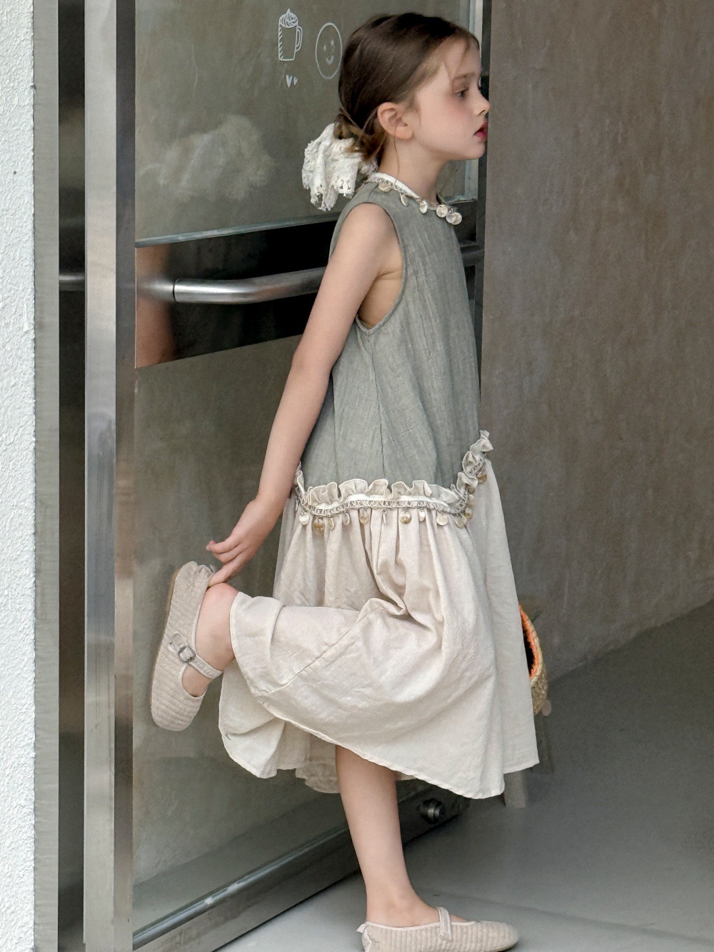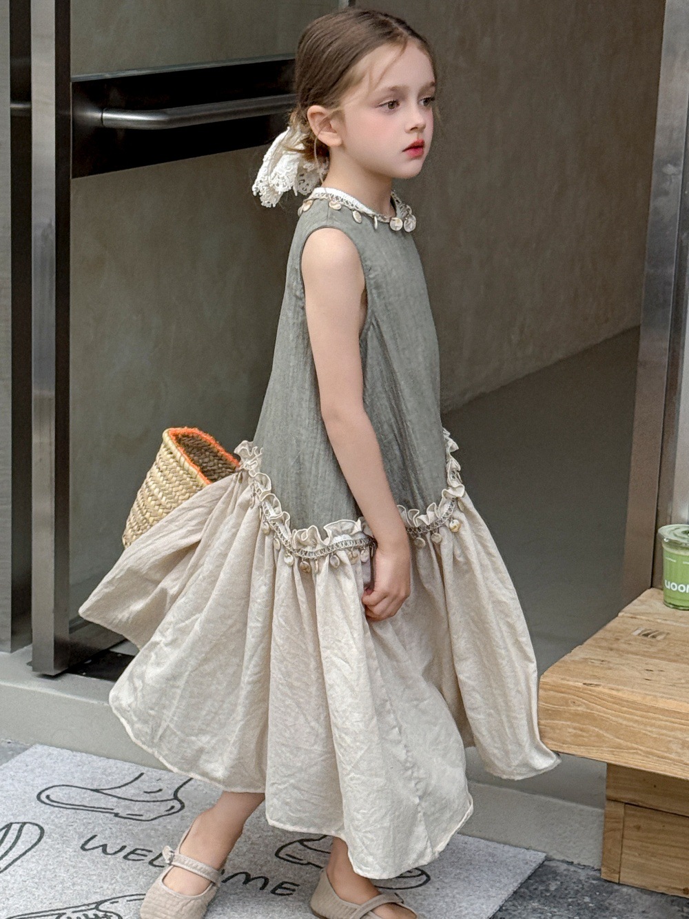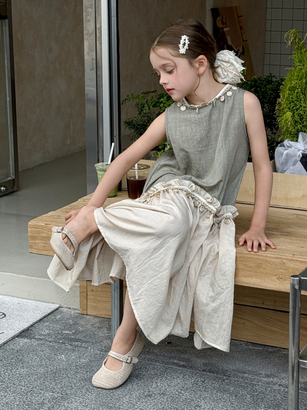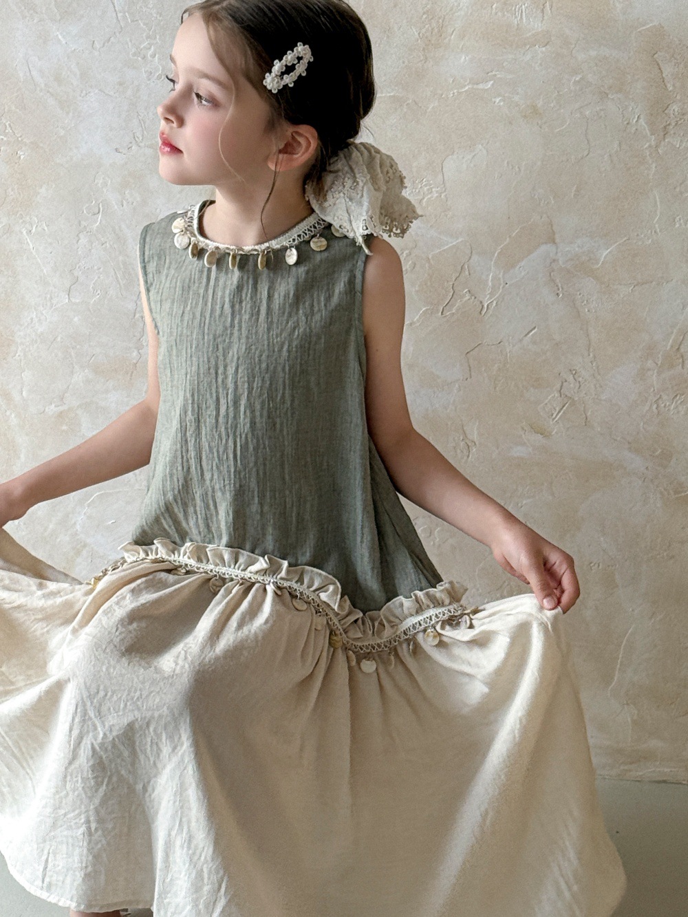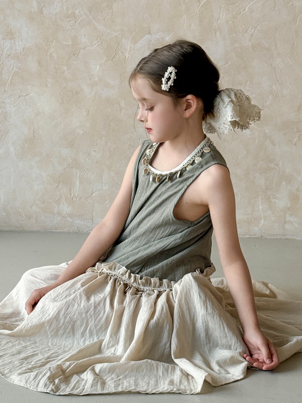 涼しげなノースリーブデザインで、暑い日でもお子さんは快適に過ごせます。最大の特徴は、胸元や裾にあしらわれたタッセルとフリル。コントラストカラーの組み合わせが、おしゃれで個性的な印象を与えます。ゆったりとしたシルエットで動きやすく、普段使いはもちろん、ビーチや旅行など、リゾートシーンにも活躍するでしょう。
