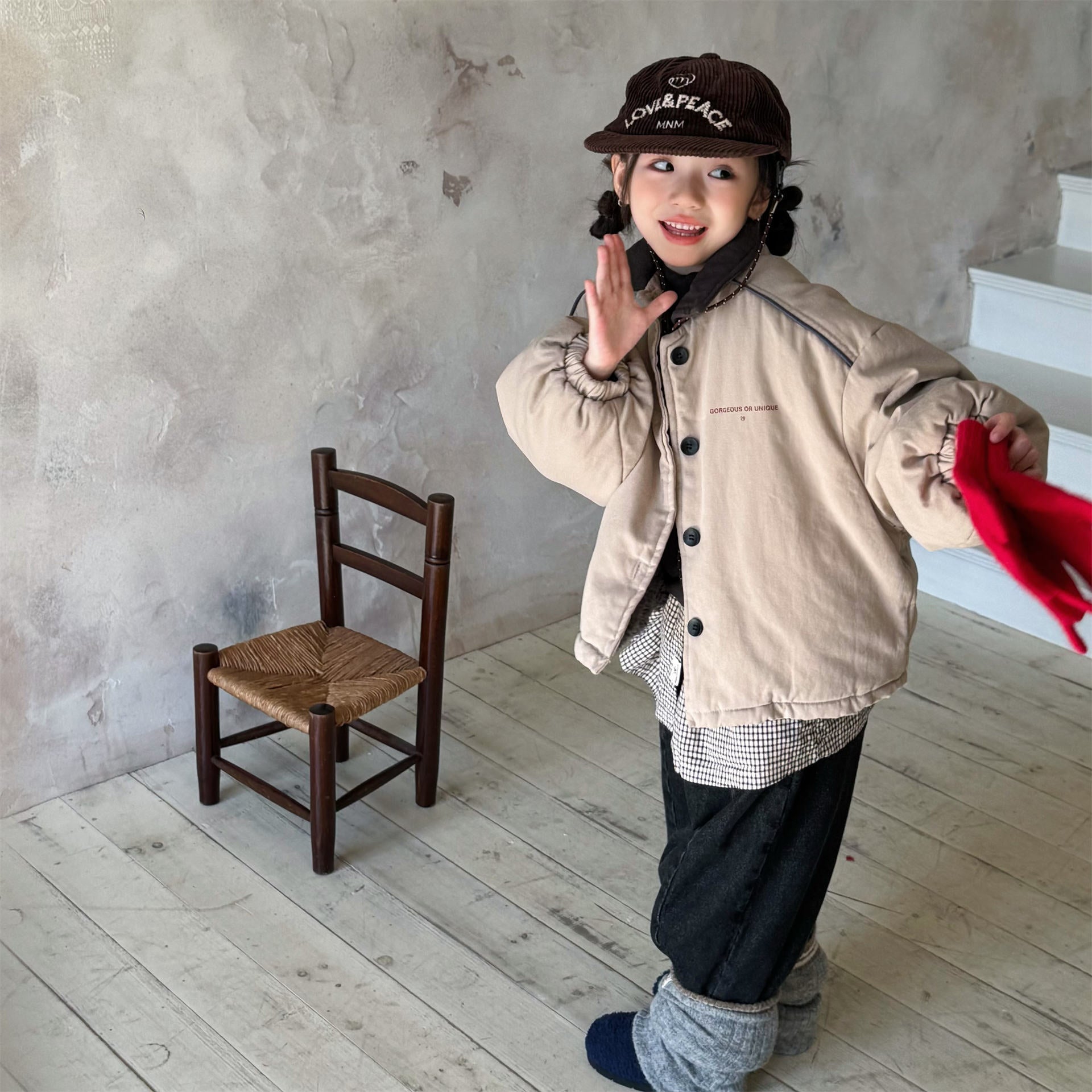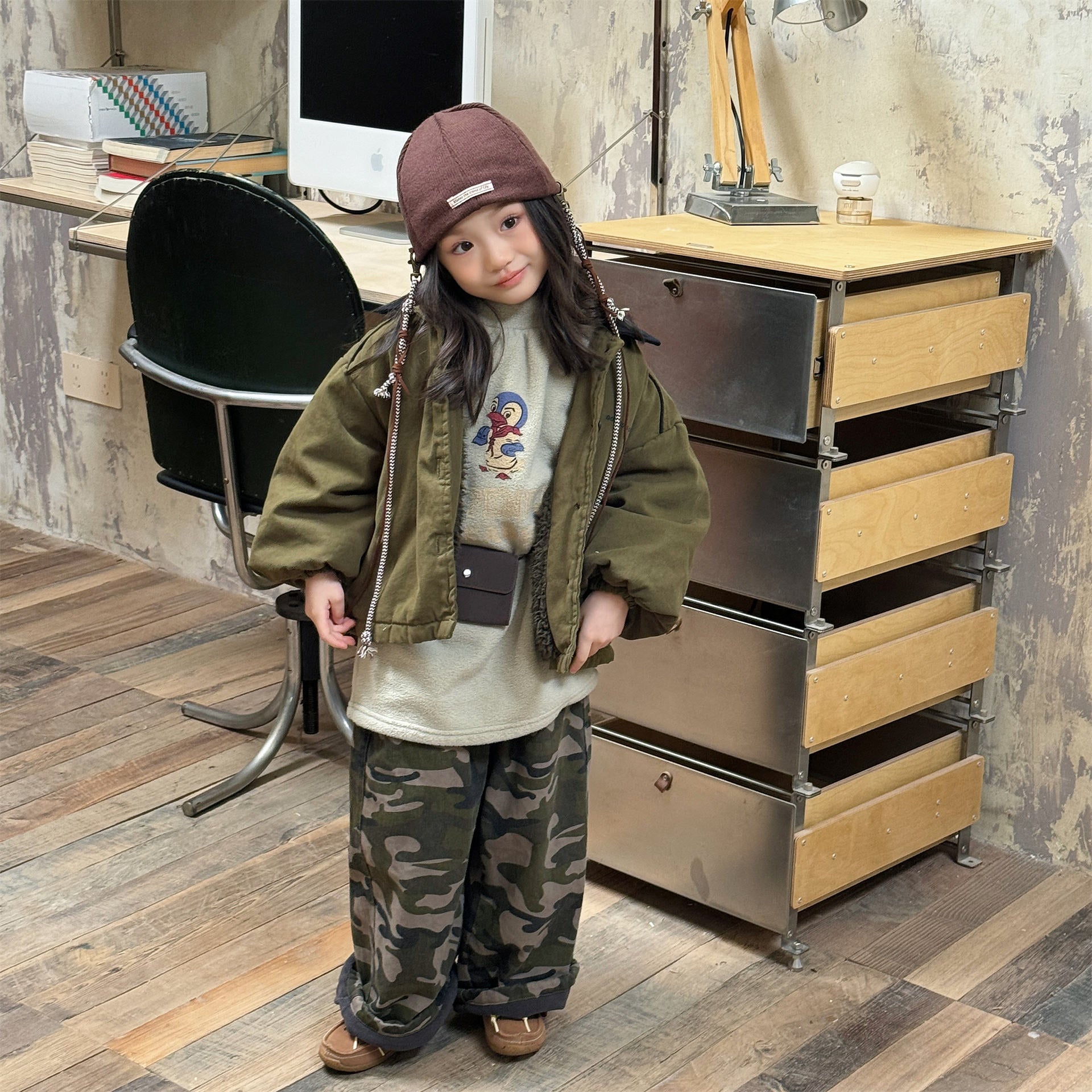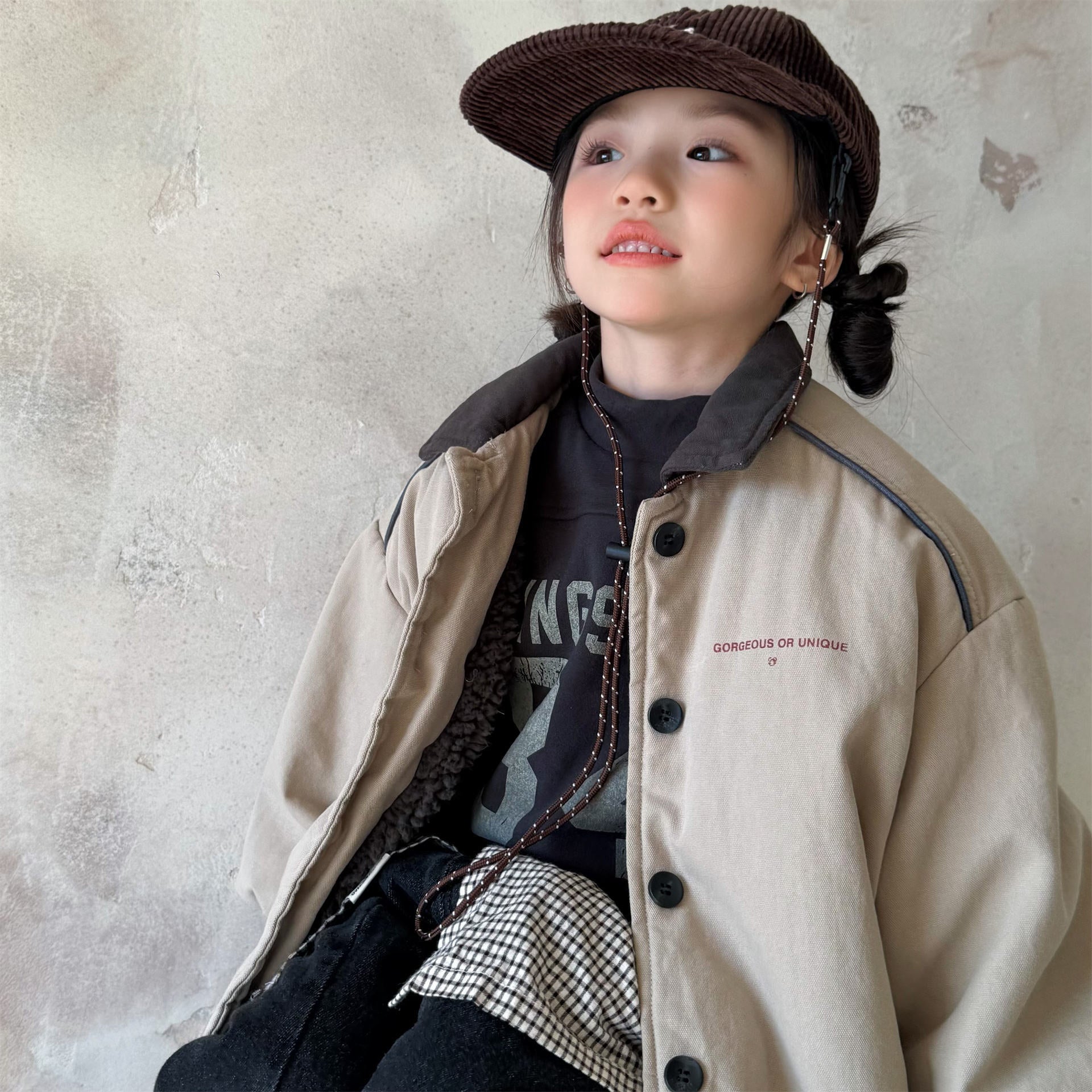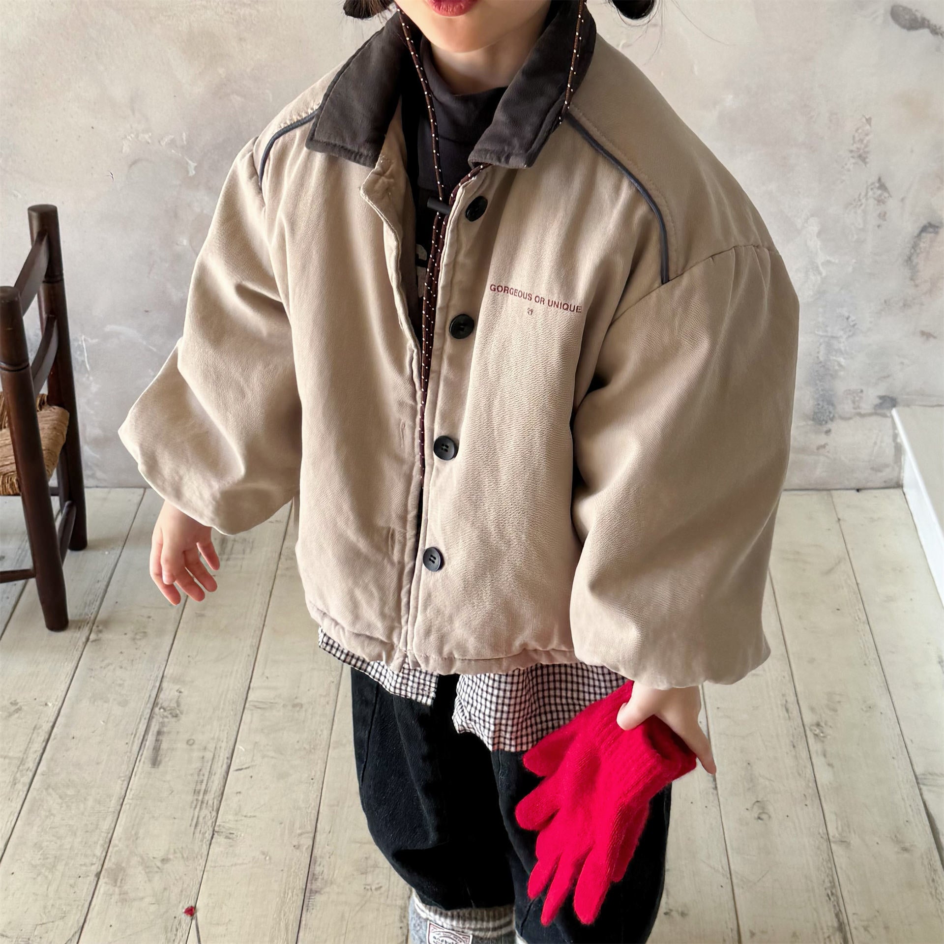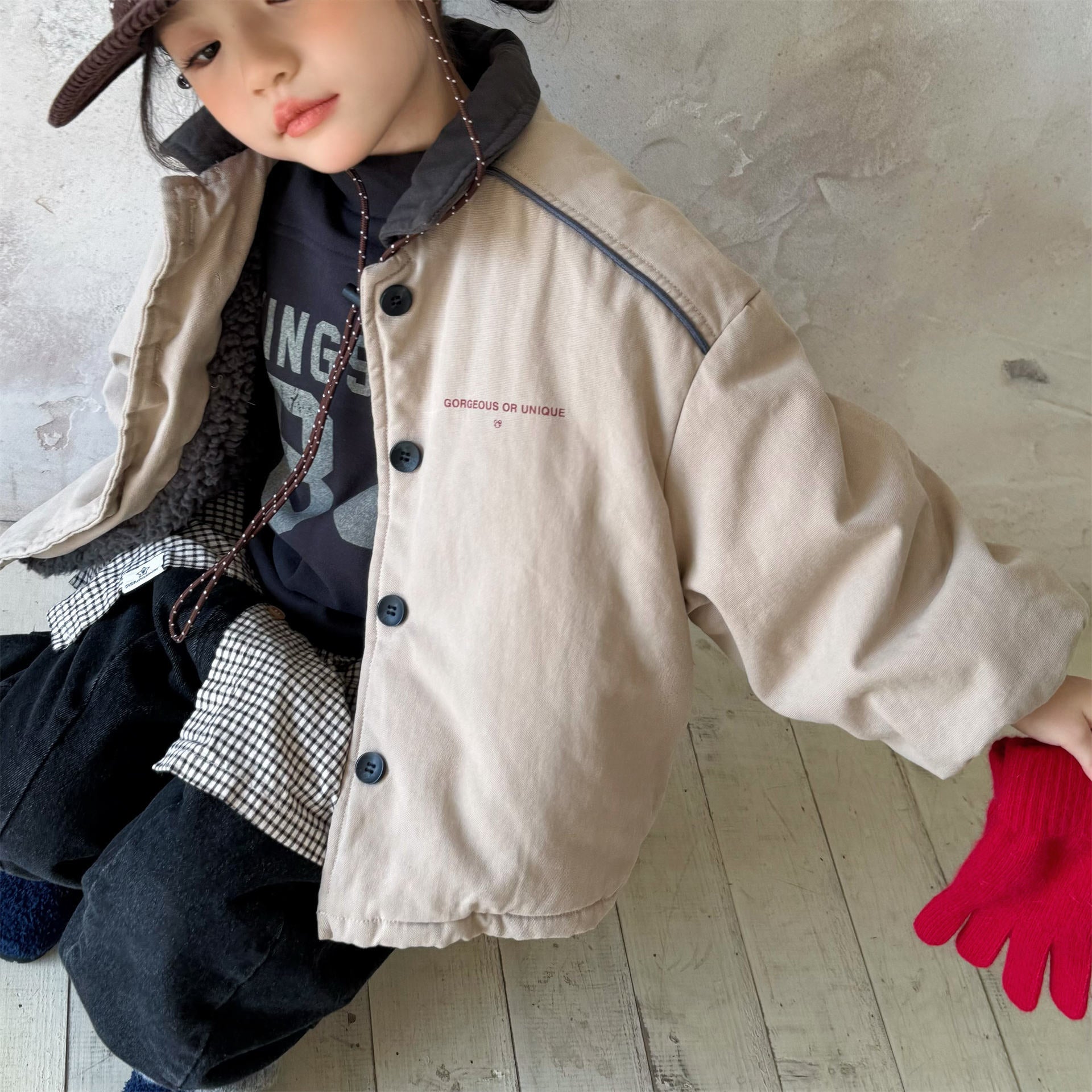 タフなワークテイストを取り入れたデザインが目を引く、ストリートカジュアルな中綿ジャケットです。内側は暖かなボア裏地で仕上げられ、おしゃれを楽しみながらベビーや子どもたちを寒さから守る機能的なアウターです。立体感のあるカーゴポケットや丸みを帯びたシルエットが、着るだけで洗練されたおしゃれな雰囲気を演出します。