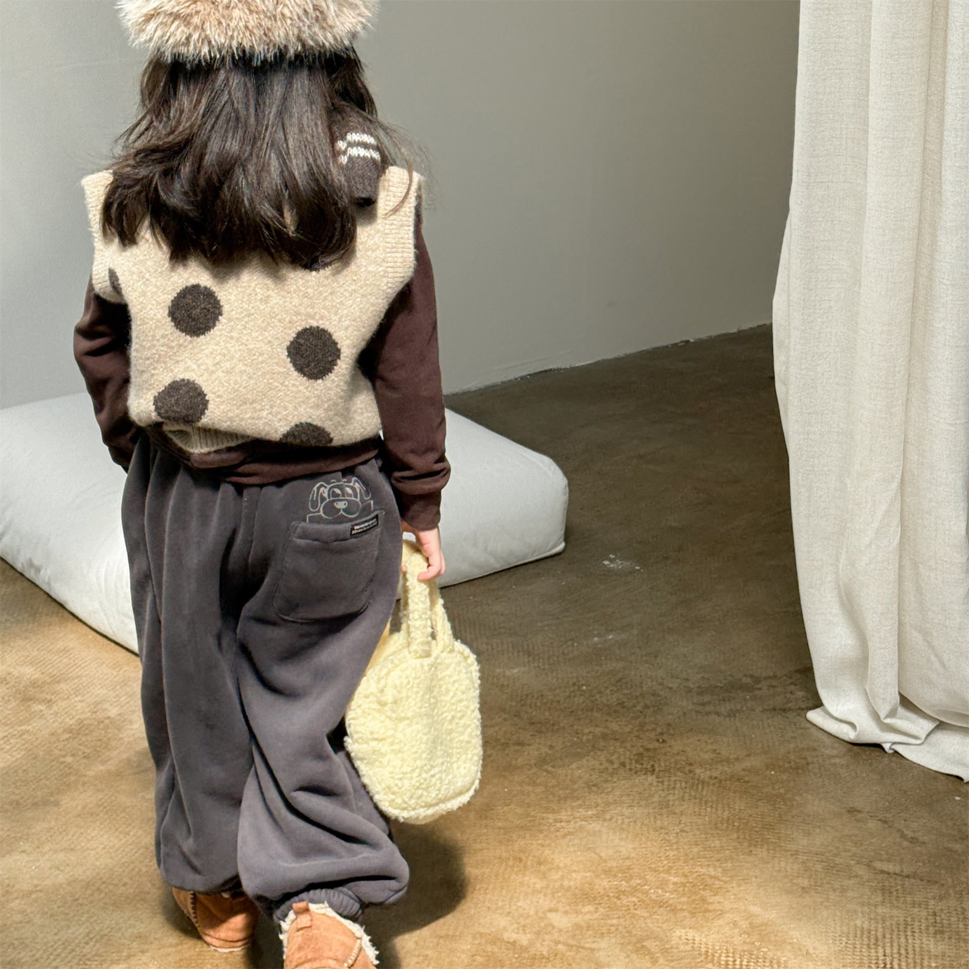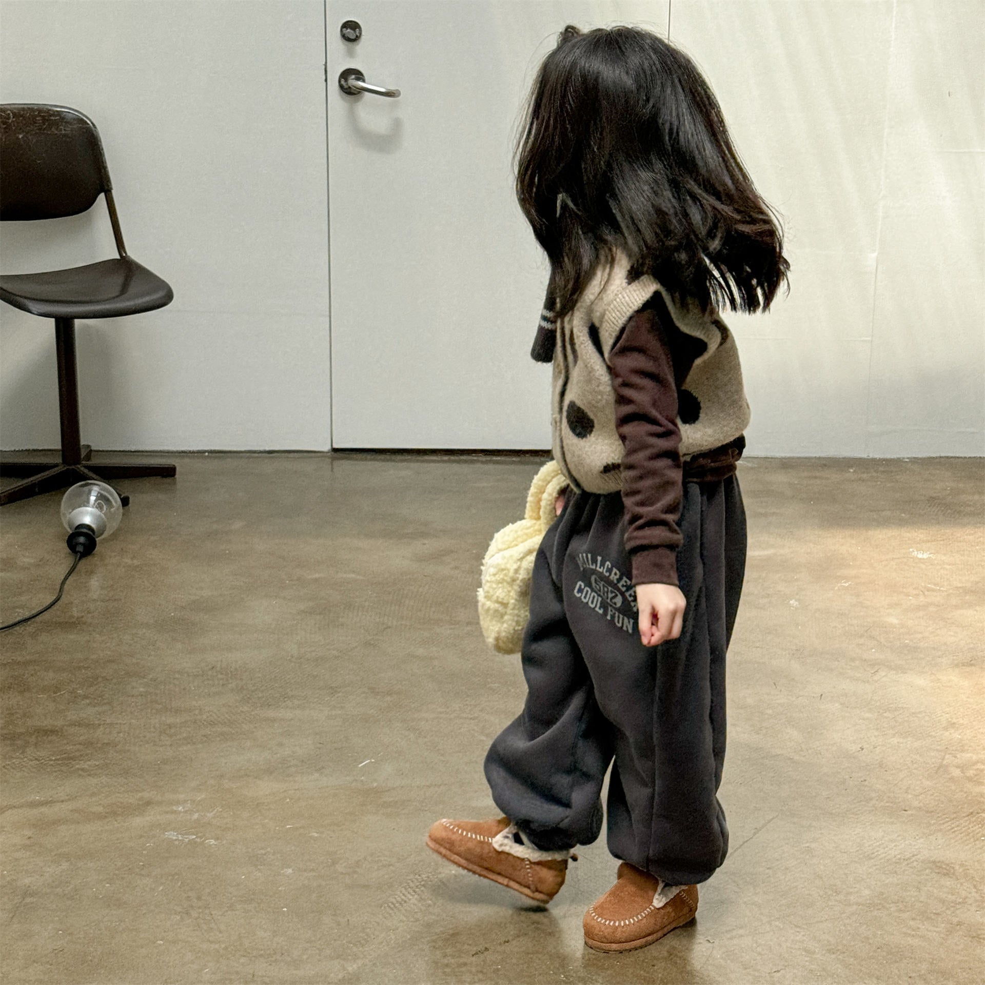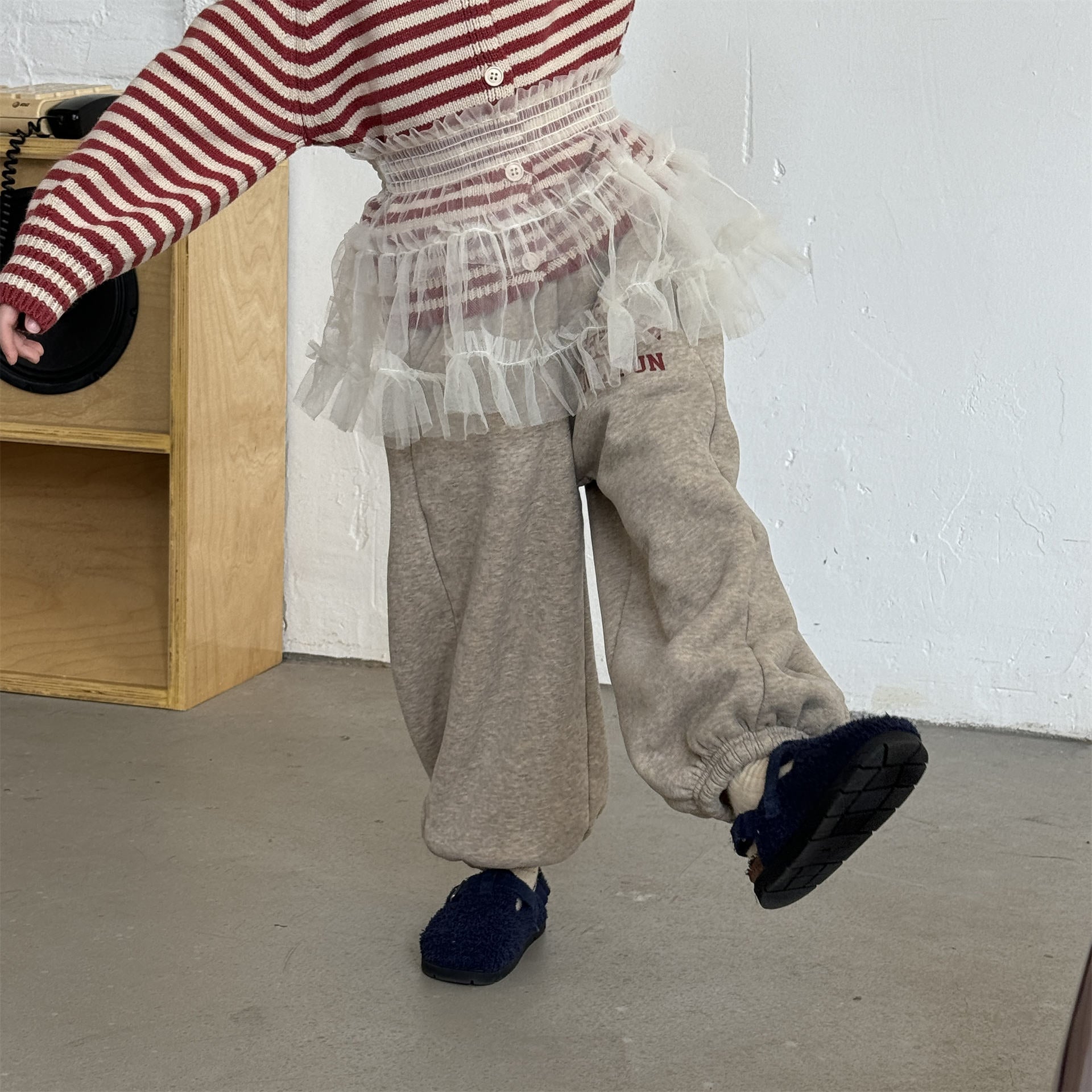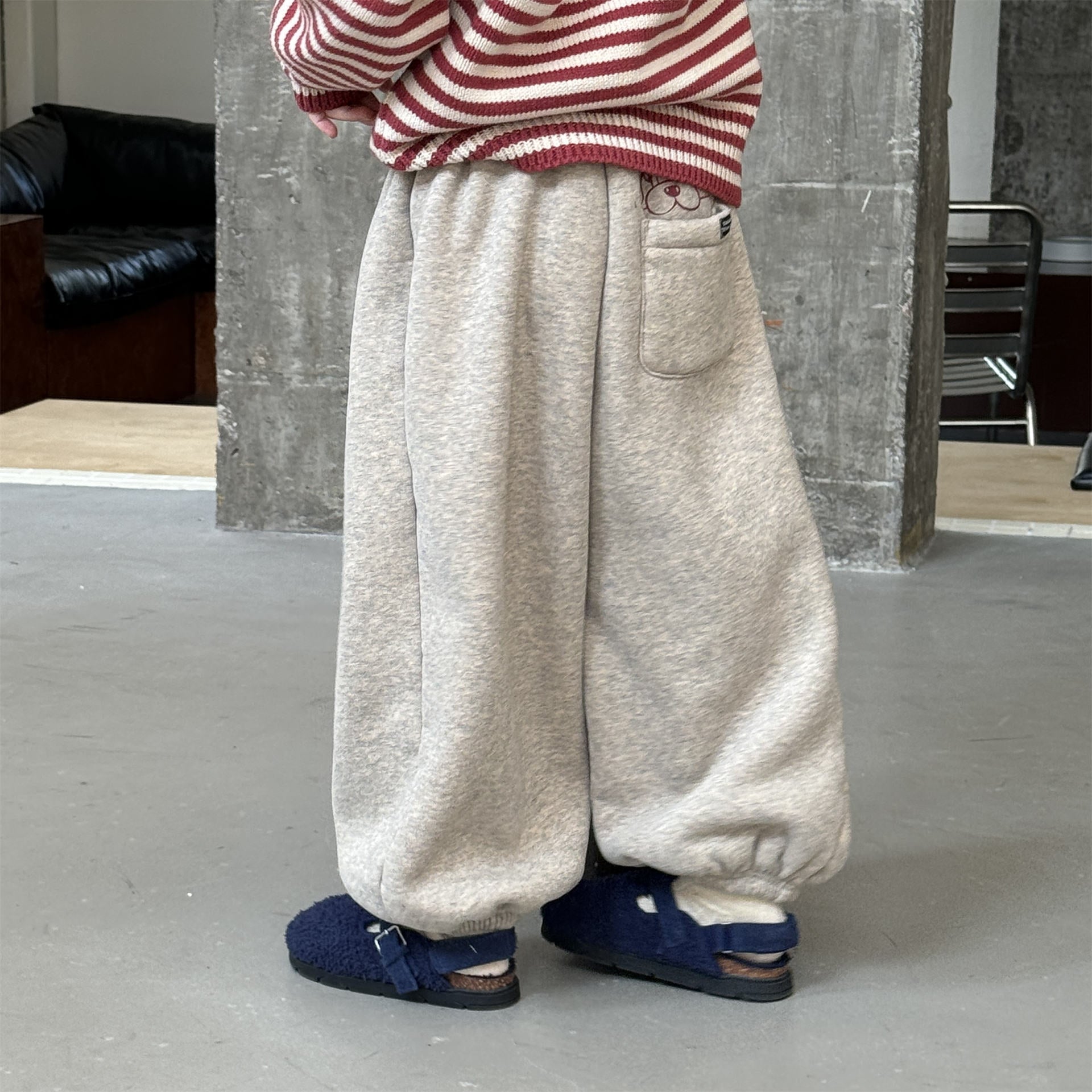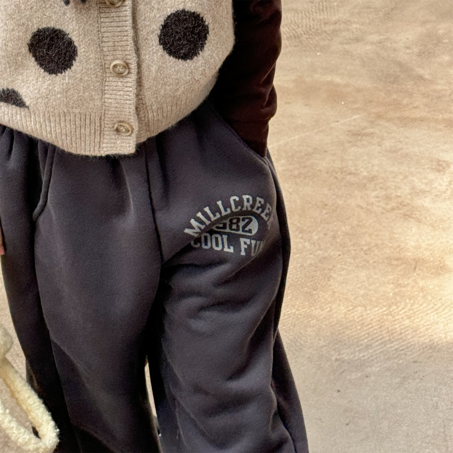暖かな裏ボア素材で仕上げられた、ロゴ刺繍入りのスウェットパンツです。ゆったりとしたジョガーシルエットが、リラックス感とおしゃれな雰囲気を両立し、アクティブな子どもたちの動きを妨げません。シンプルなデザインながら、さりげない刺繍がアクセントとなり、カジュアルなボトムスながらも洗練された子ども服の着こなしを完成させます。