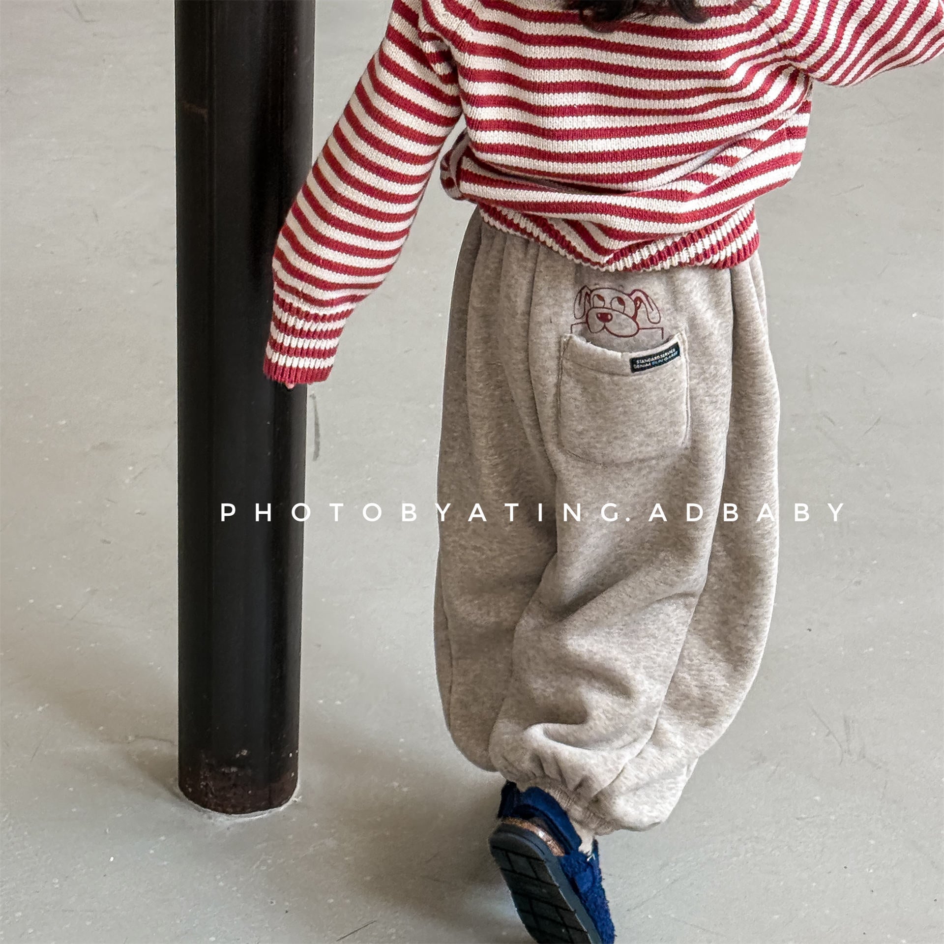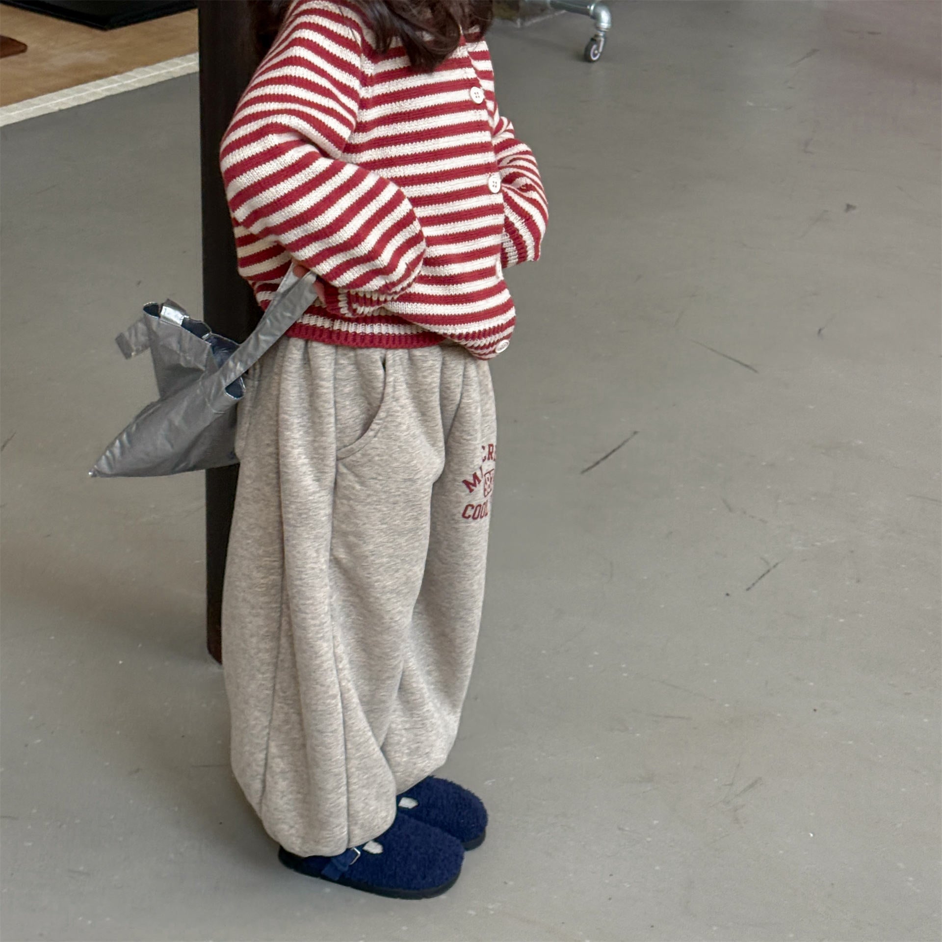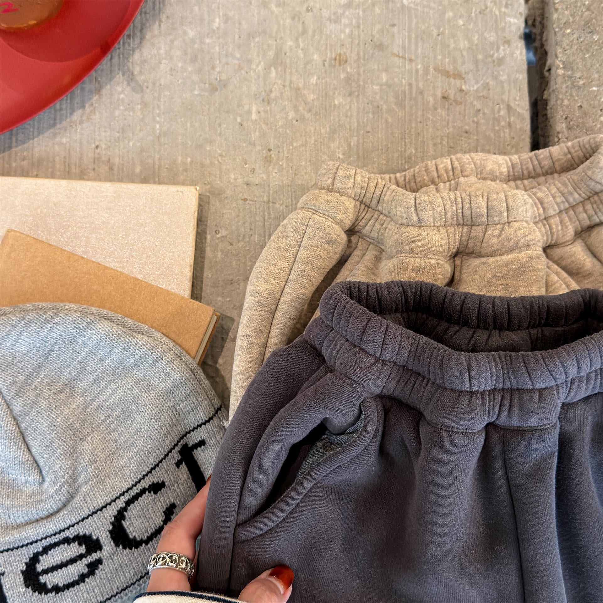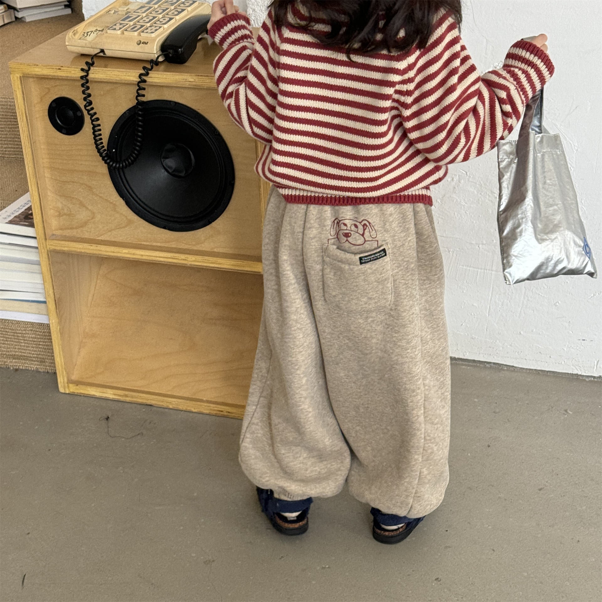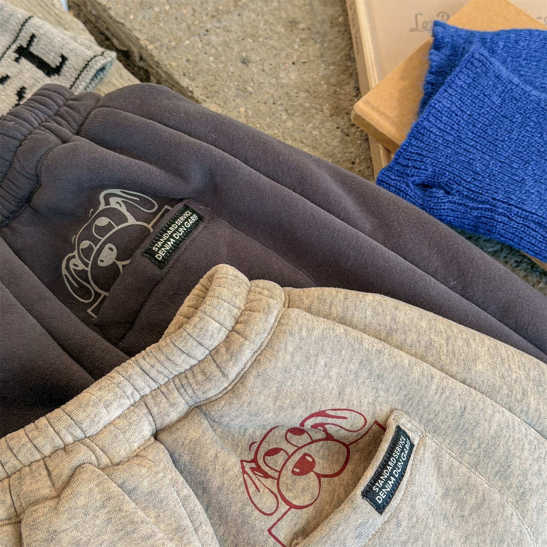 暖かな裏ボア素材で仕上げられた、ロゴ刺繍入りのスウェットパンツです。ゆったりとしたジョガーシルエットが、リラックス感とおしゃれな雰囲気を両立し、アクティブな子どもたちの動きを妨げません。シンプルなデザインながら、さりげない刺繍がアクセントとなり、カジュアルなボトムスながらも洗練された子ども服の着こなしを完成させます。