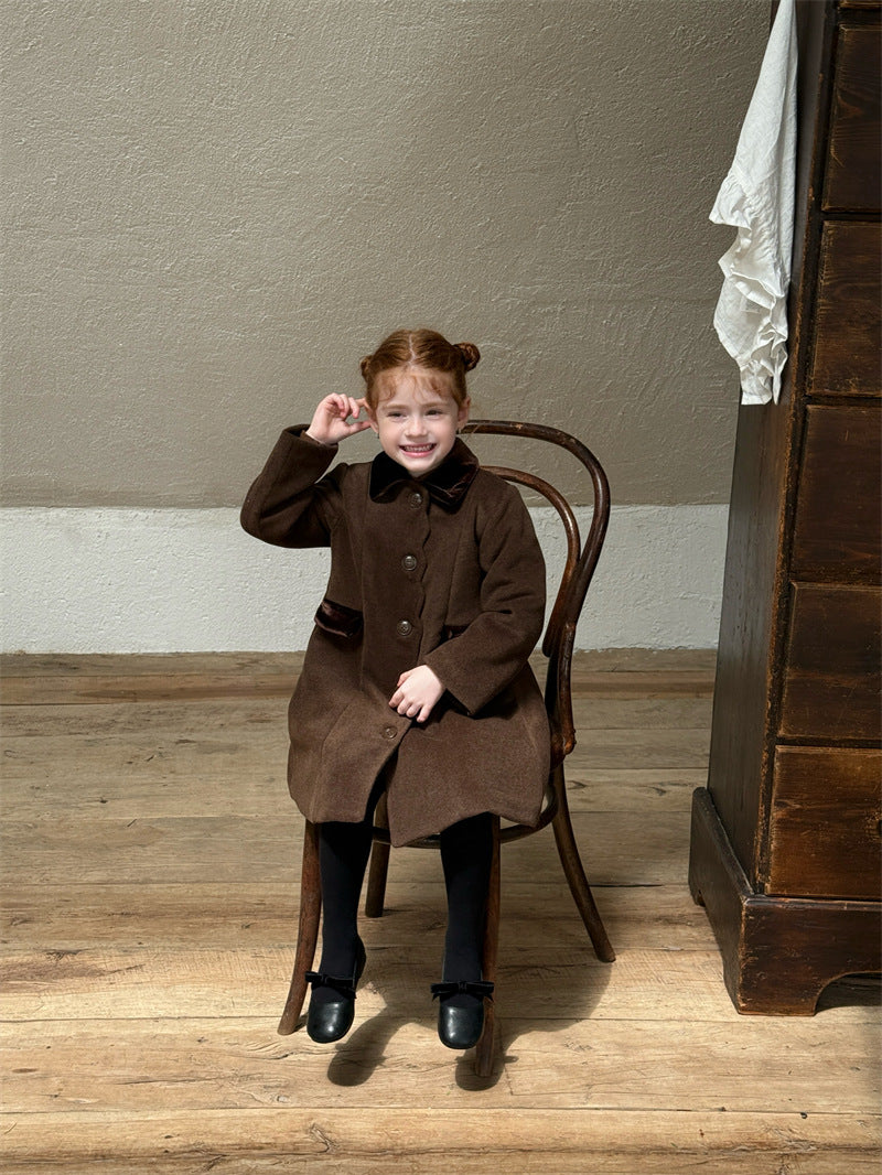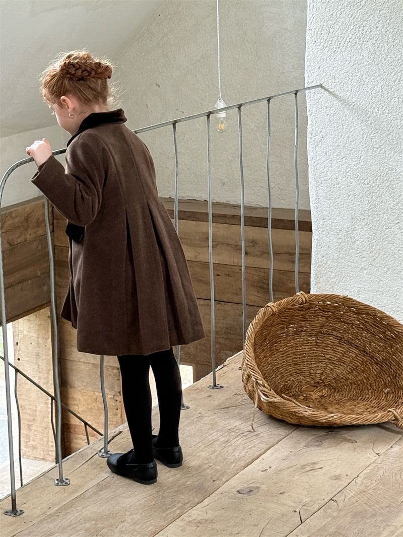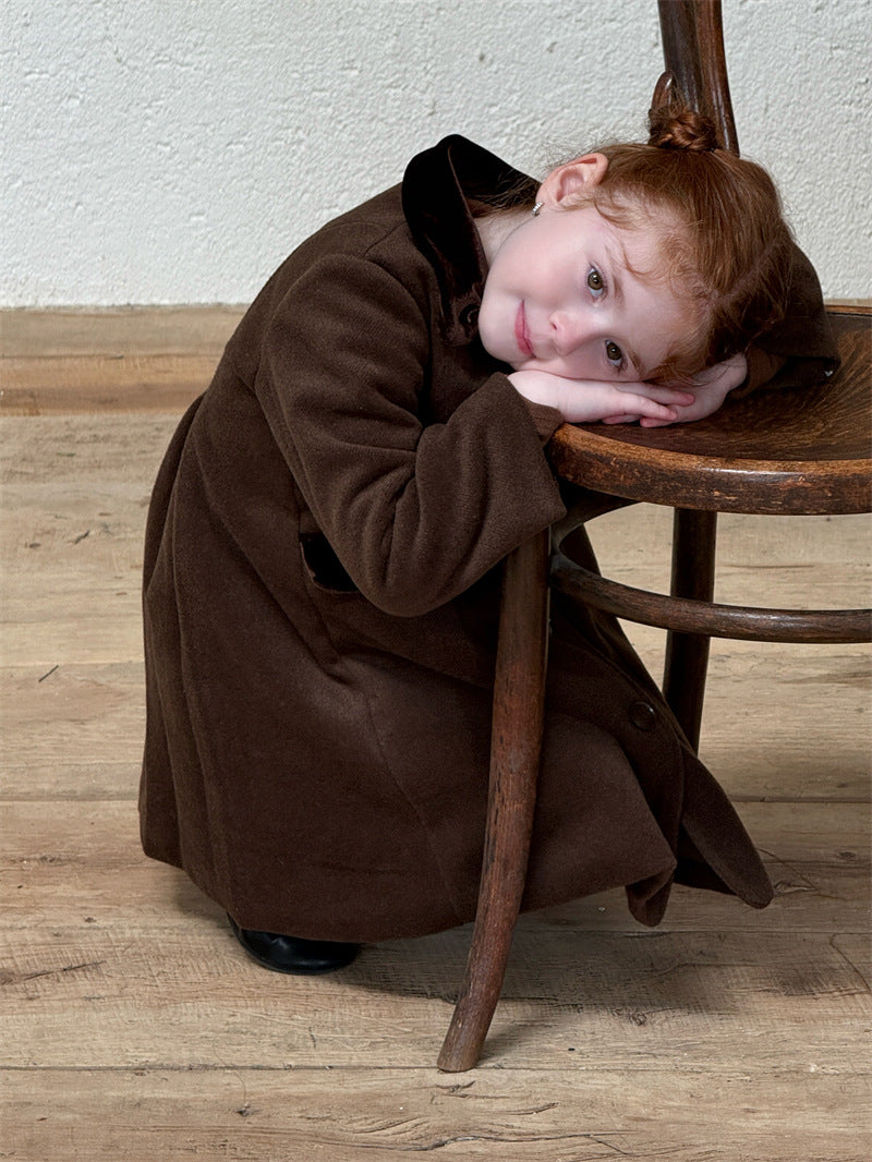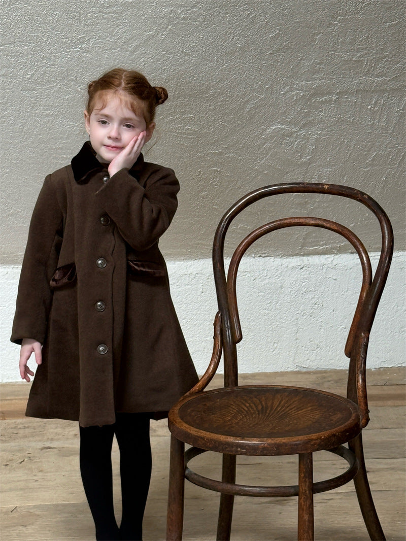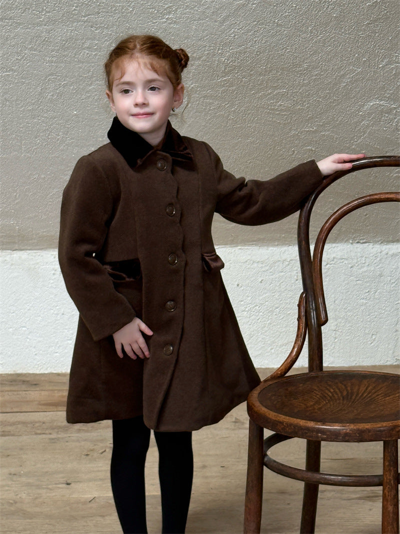 上品なカラーブロックデザインが目を引く、洗練されたムードを纏う襟付きのミディ丈コート。ふんわりと広がるAラインシルエットが愛らしい印象を与えつつ、中綿入りで寒い時季のお出かけを暖かくサポートします。エレガントさと機能性を両立させたこの子ども服のアウターは、羽織るだけでお出かけスタイルを格上げし、特別なシーンにも映える一着です。