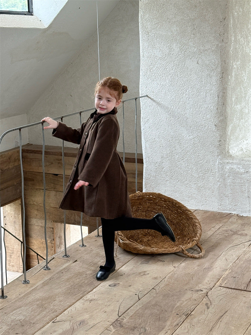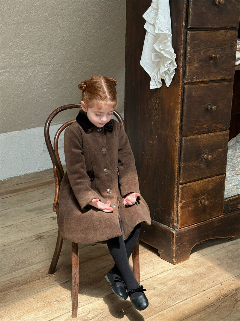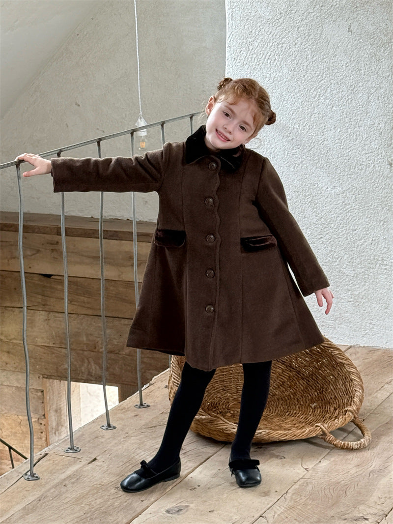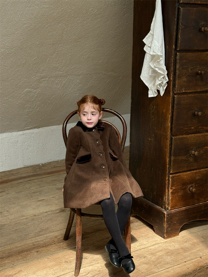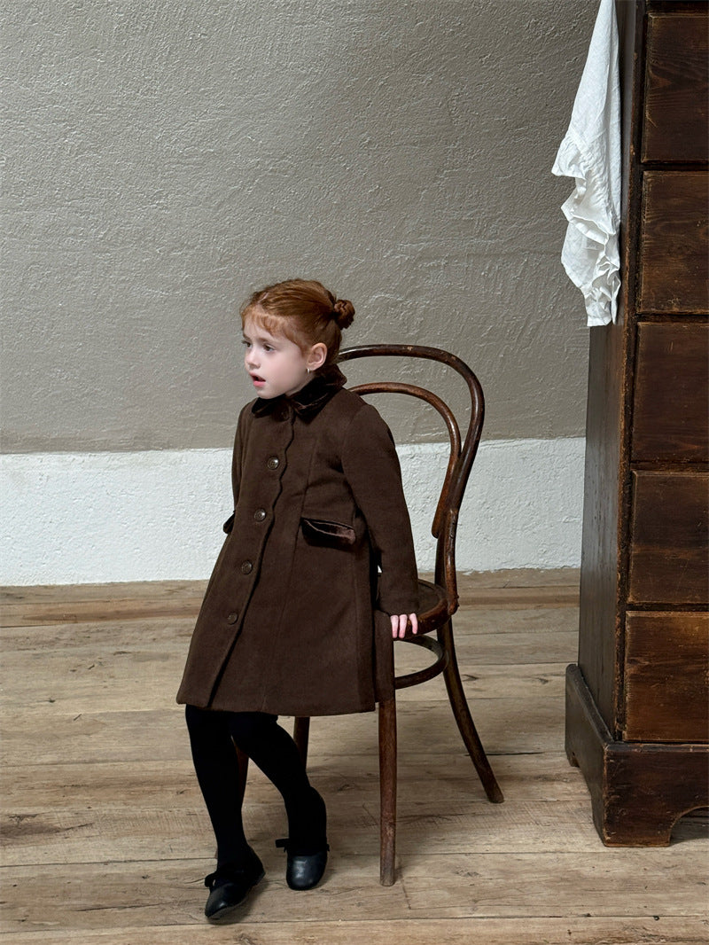 上品なカラーブロックデザインが目を引く、洗練されたムードを纏う襟付きのミディ丈コート。ふんわりと広がるAラインシルエットが愛らしい印象を与えつつ、中綿入りで寒い時季のお出かけを暖かくサポートします。エレガントさと機能性を両立させたこの子ども服のアウターは、羽織るだけでお出かけスタイルを格上げし、特別なシーンにも映える一着です。