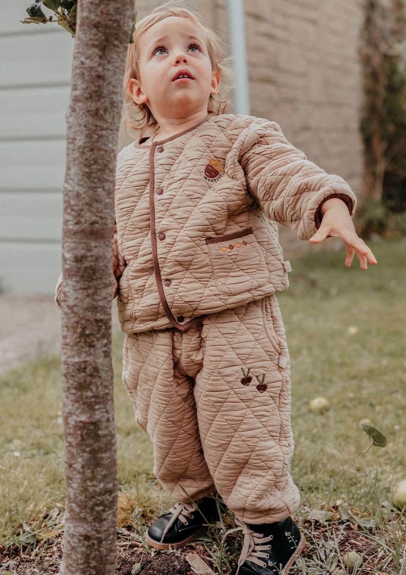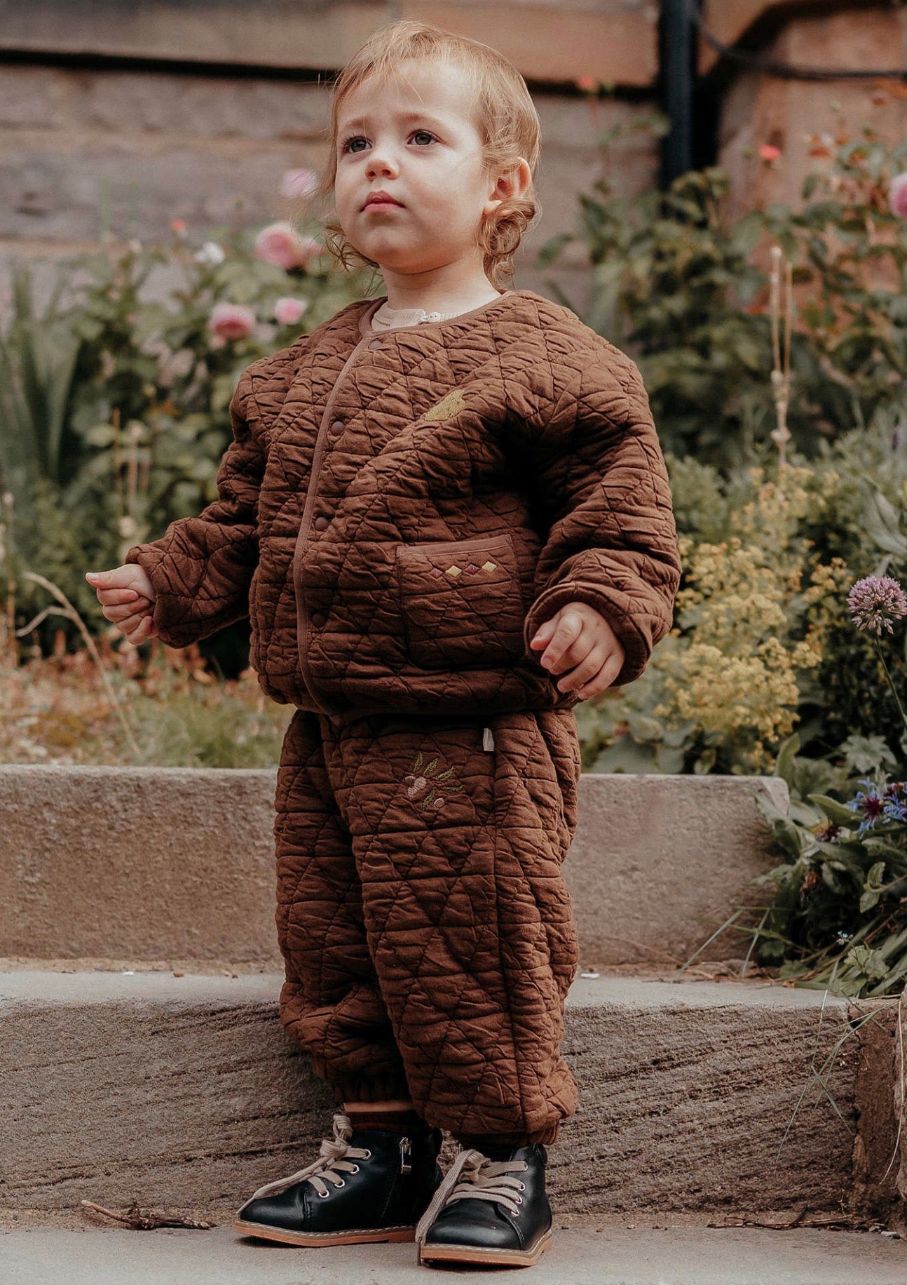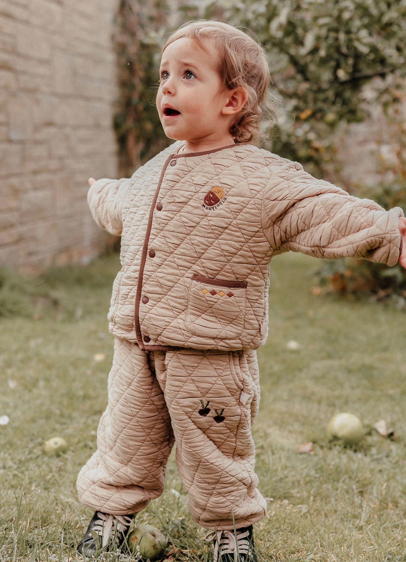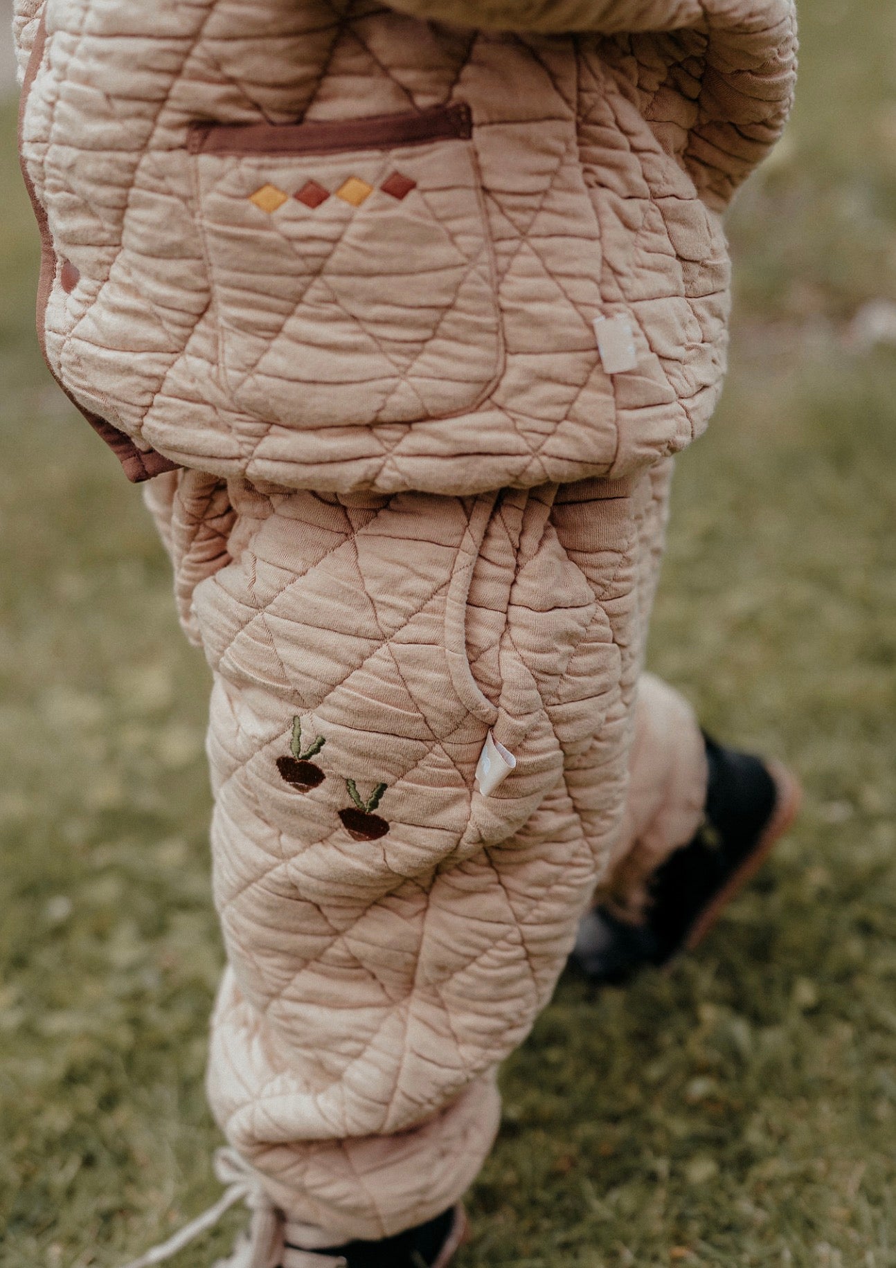 刺繍のモチーフを控えめにあしらったキルティングのジョガーパンツは、デイリーユースにぴったりのベビー服です。ふわふわとした心地よい裏フリース素材が、アクティブなお子さまの足元を優しく包み込みます。ユニセックスで楽しめるシンプルなデザインなので、どんなトップスやアウターとも馴染みやすく、カジュアルなコーディネートを格上げする一本として活躍します。