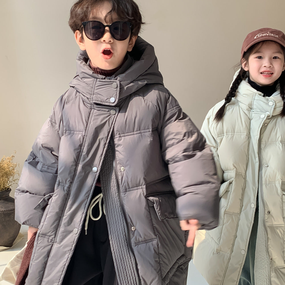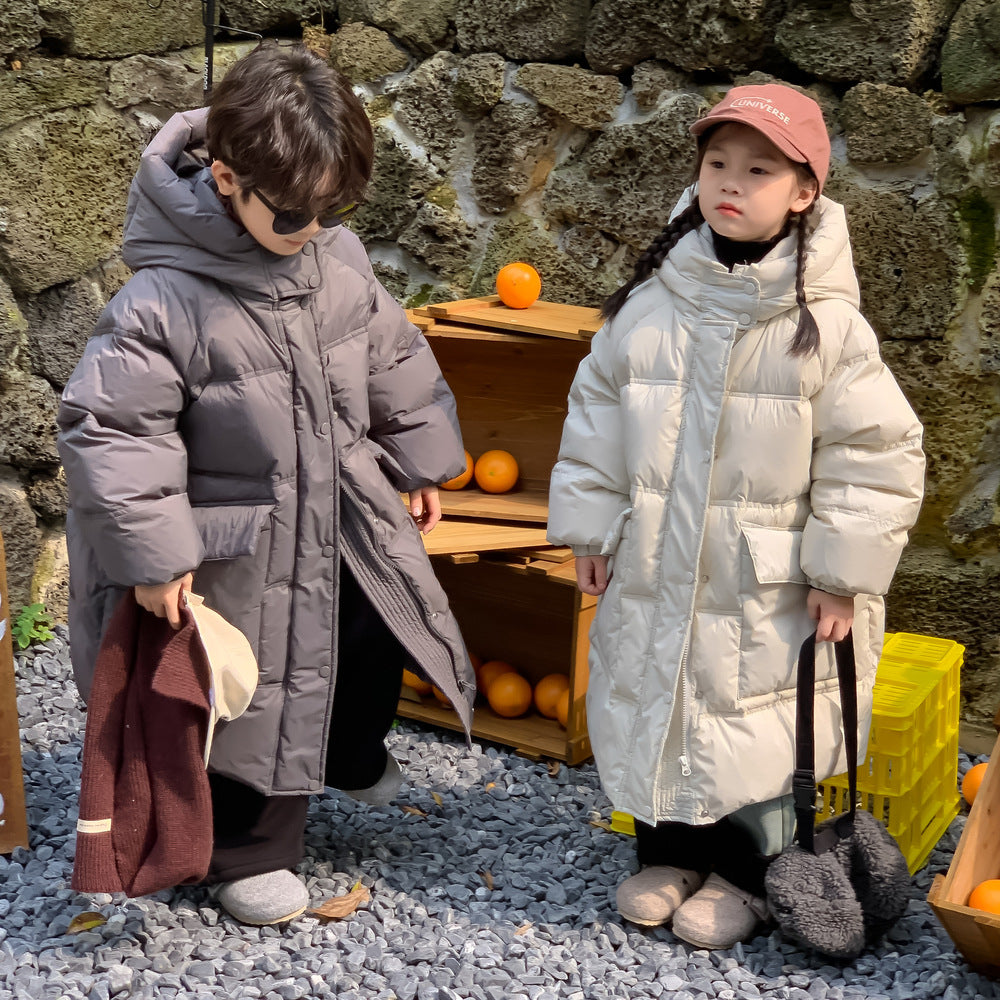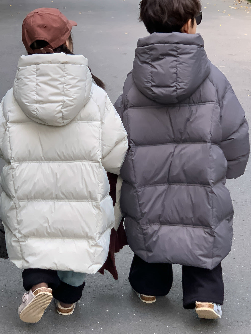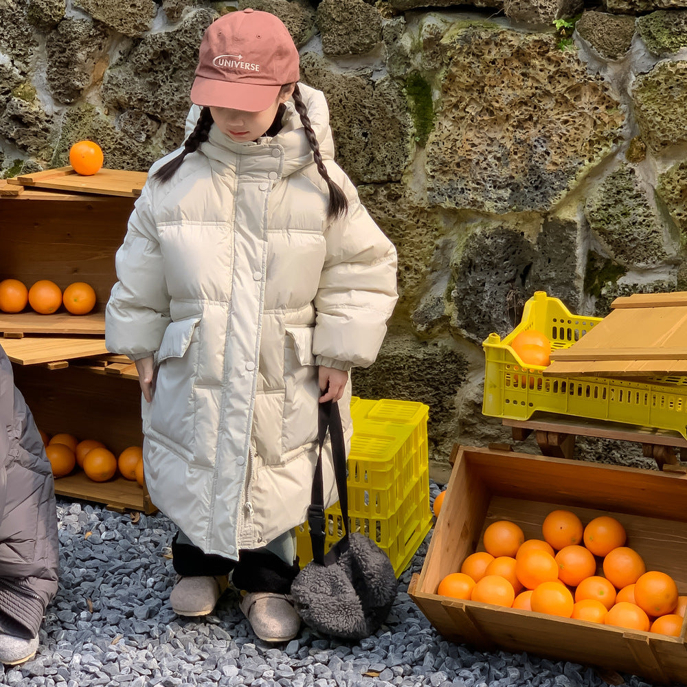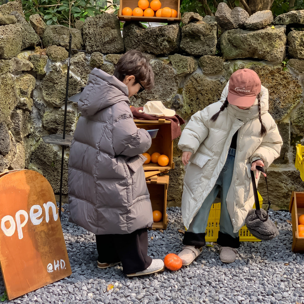軽くて暖かいダウンジャケットは、寒い日のお出かけをサポートするロング丈のベンチコートです。ソリッドカラーのシンプルなデザインながら、フード付きで首元まで暖かく、洗練されたカジュアルスタイルを演出します。ゆったりとしたシルエットは動きやすく、厚手で防寒性の高いこのコートは、お子様の通園や通学、冬のアクティビティに欠かせないアウターとして重宝します。