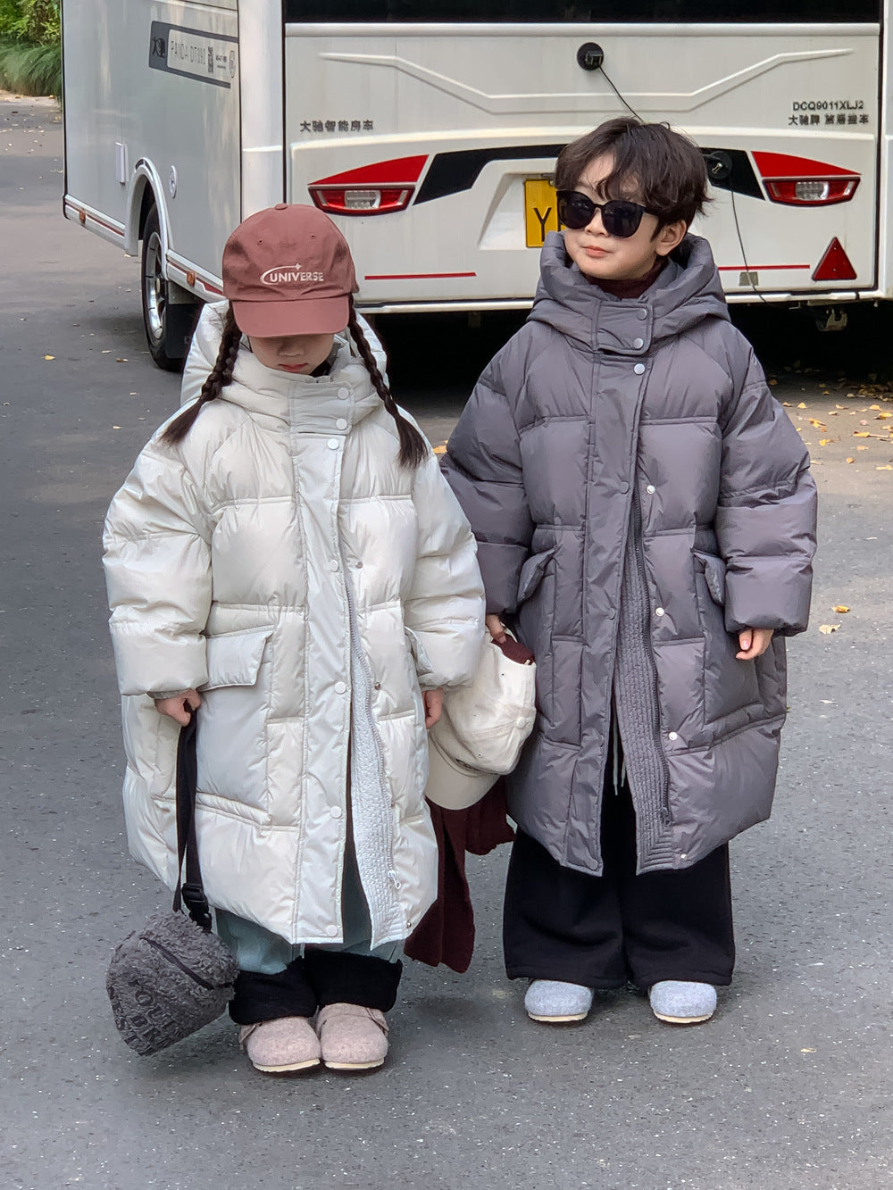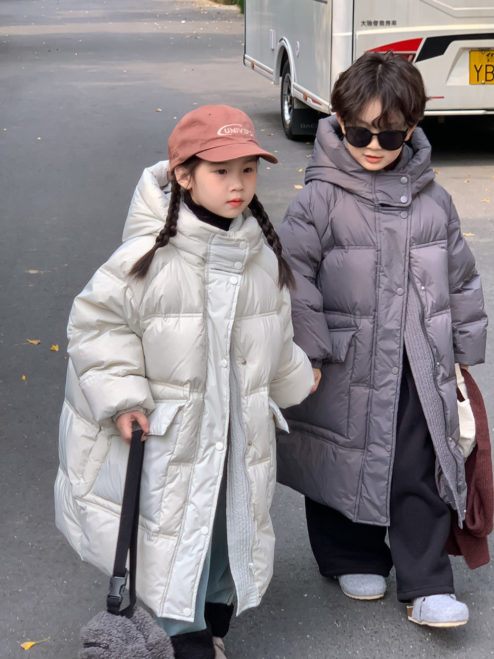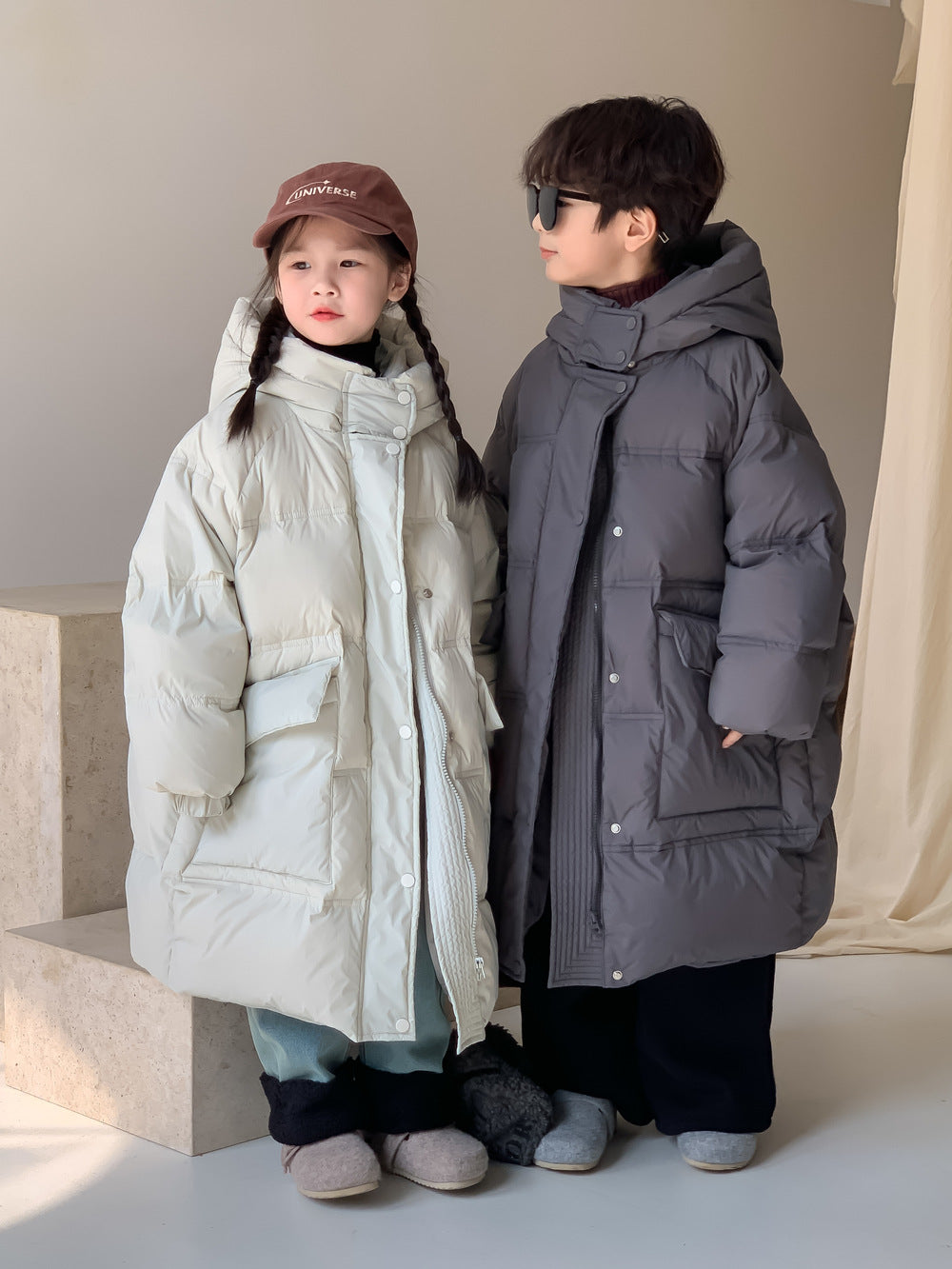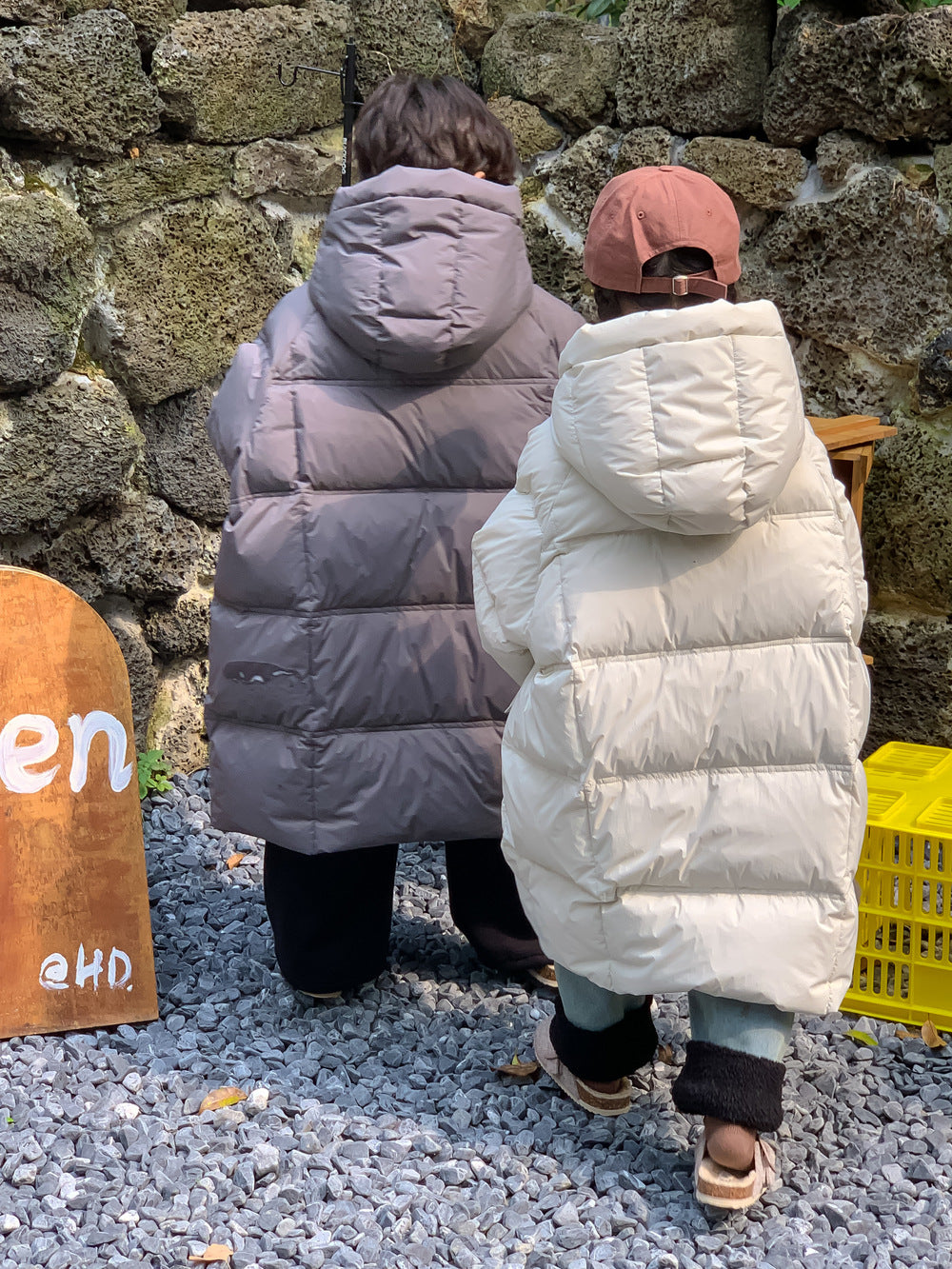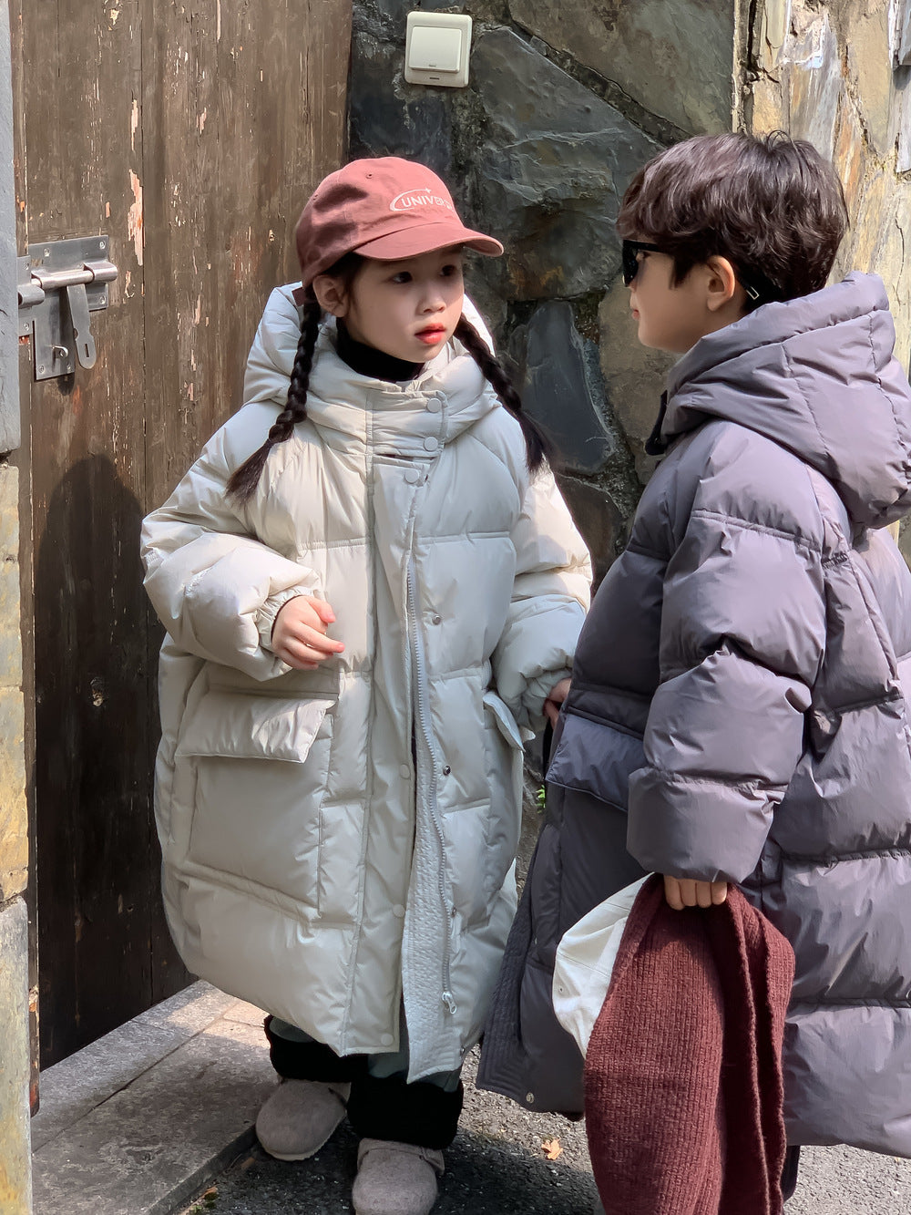 軽くて暖かいダウンジャケットは、寒い日のお出かけをサポートするロング丈のベンチコートです。ソリッドカラーのシンプルなデザインながら、フード付きで首元まで暖かく、洗練されたカジュアルスタイルを演出します。ゆったりとしたシルエットは動きやすく、厚手で防寒性の高いこのコートは、お子様の通園や通学、冬のアクティビティに欠かせないアウターとして重宝します。