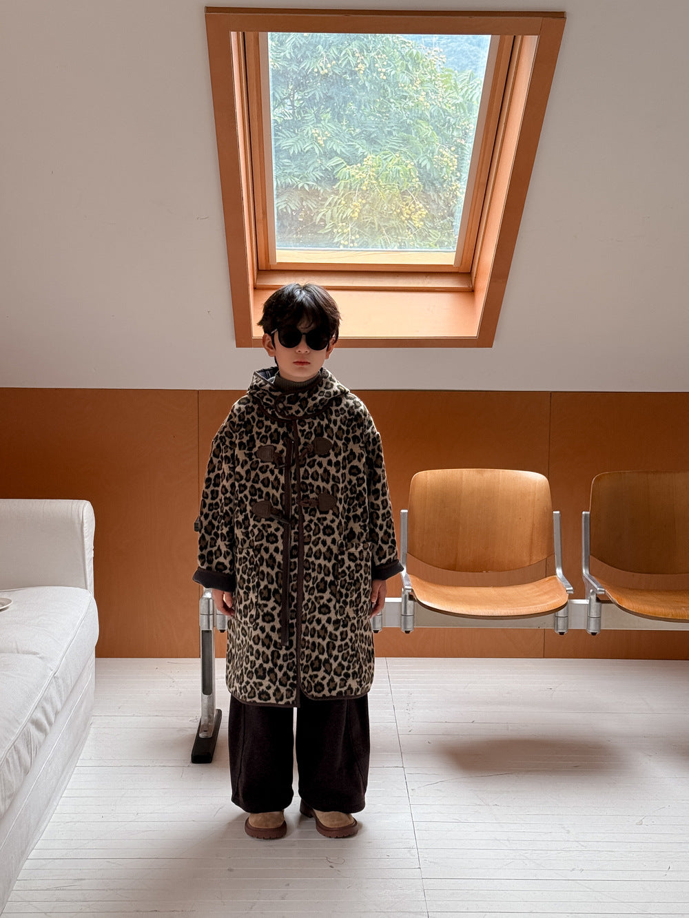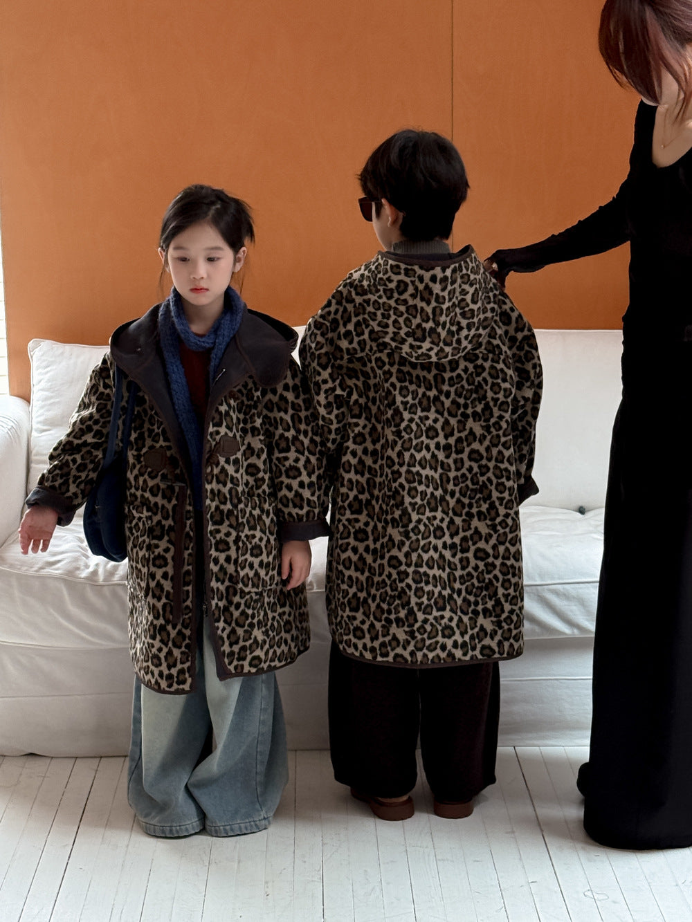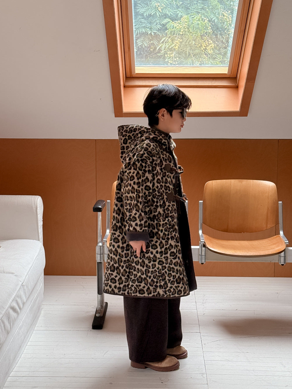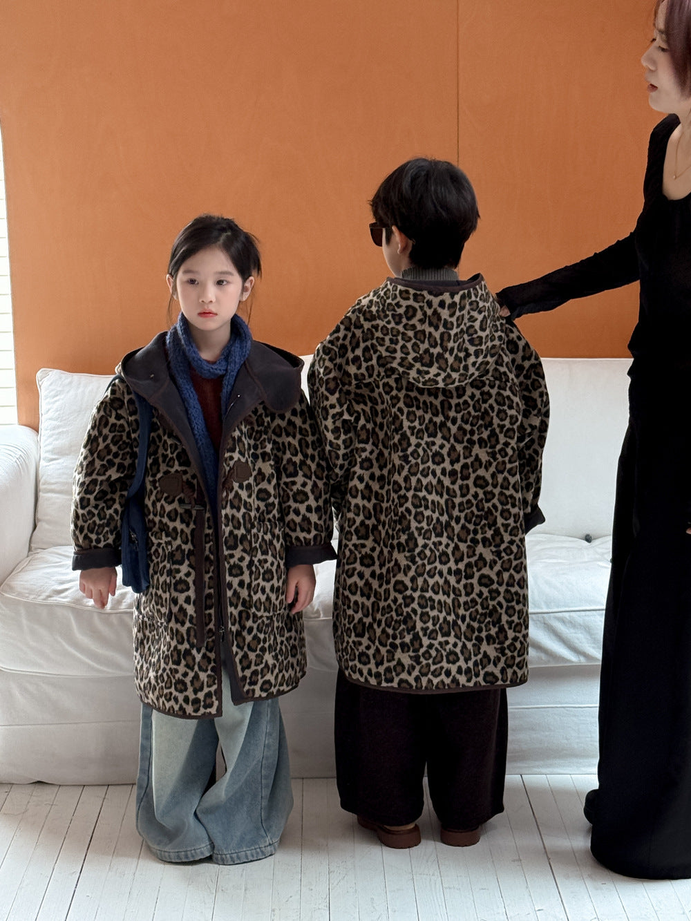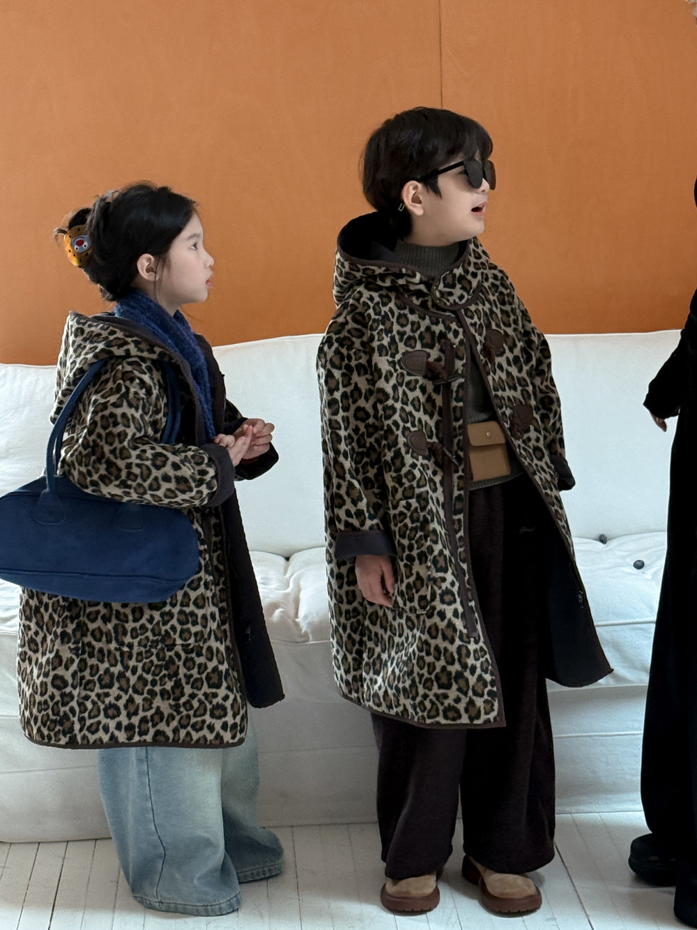 トレンドのレオパード柄をまとった、キッズダッフルコートです。落ち着いたカラーリングの柄が、カジュアルながらもスタイリッシュな雰囲気を演出します。中綿と裏起毛を施した厚手の生地で、真冬でも暖かくベビーを包み込むロング丈アウターです。フード付きのデザインは防寒性にも優れ、デイリーユースにぴったり。男の子にも女の子にも着せられるユニセックスなデザインなので、兄弟姉妹でお揃いリンクコーデも楽しめます。普段の子ども服のコーディネートを格上げする、おしゃれなカジュアルコートです。