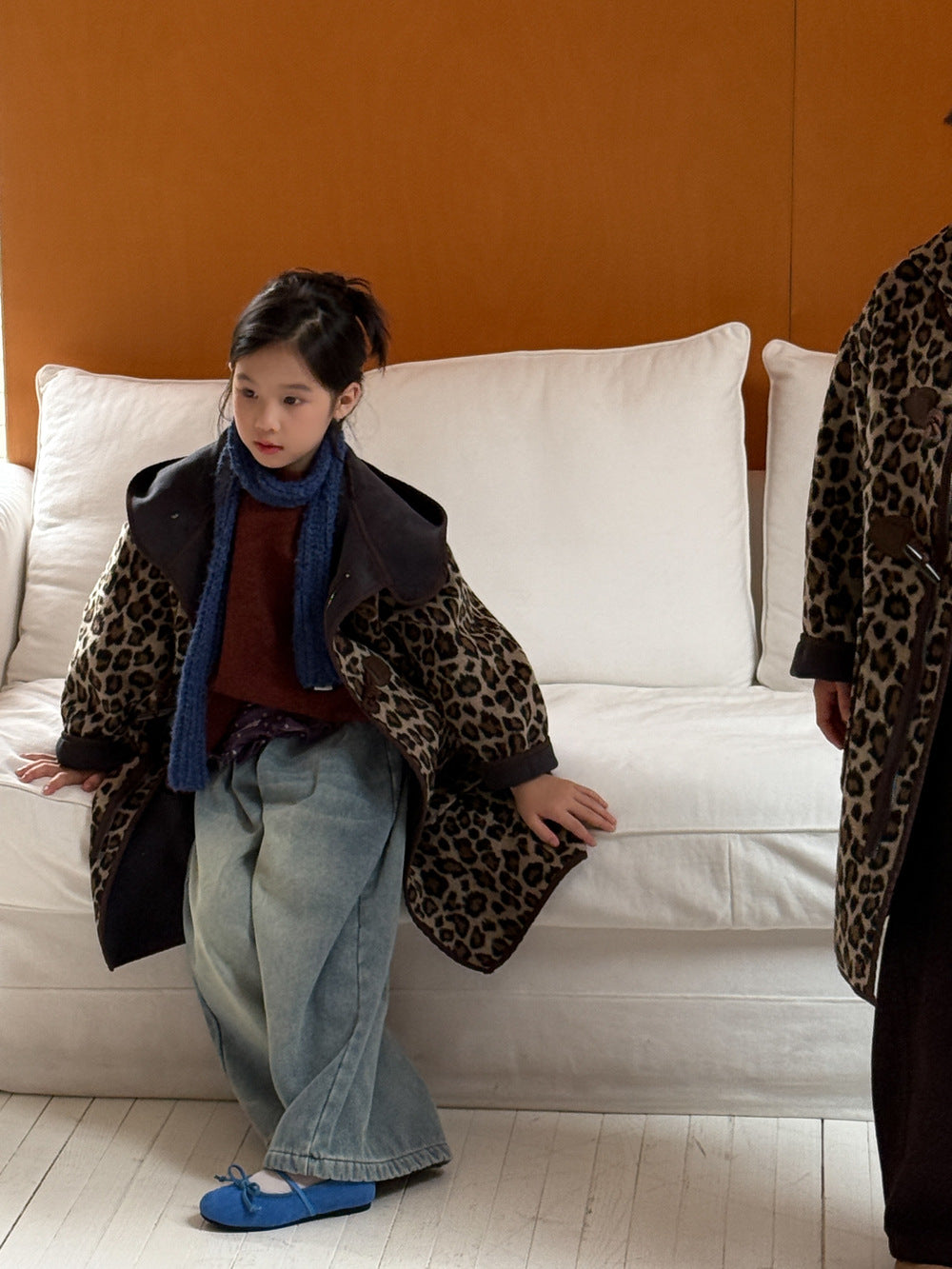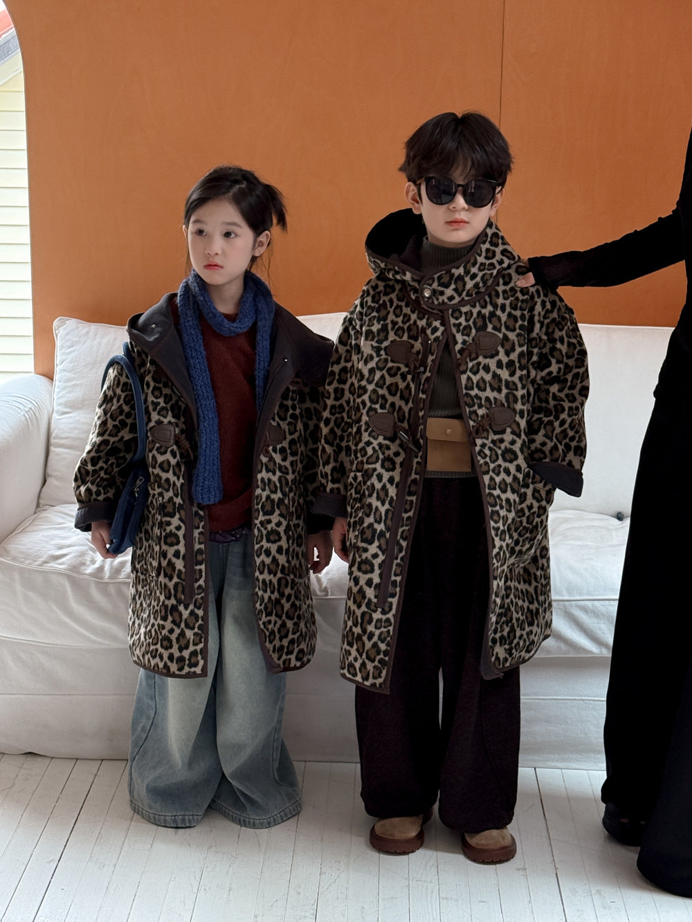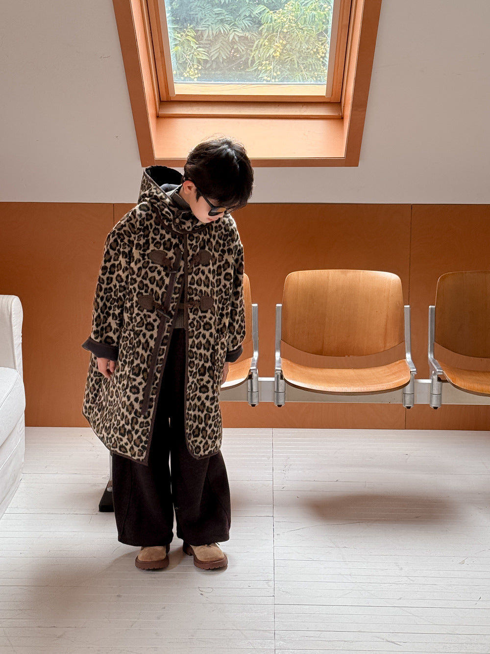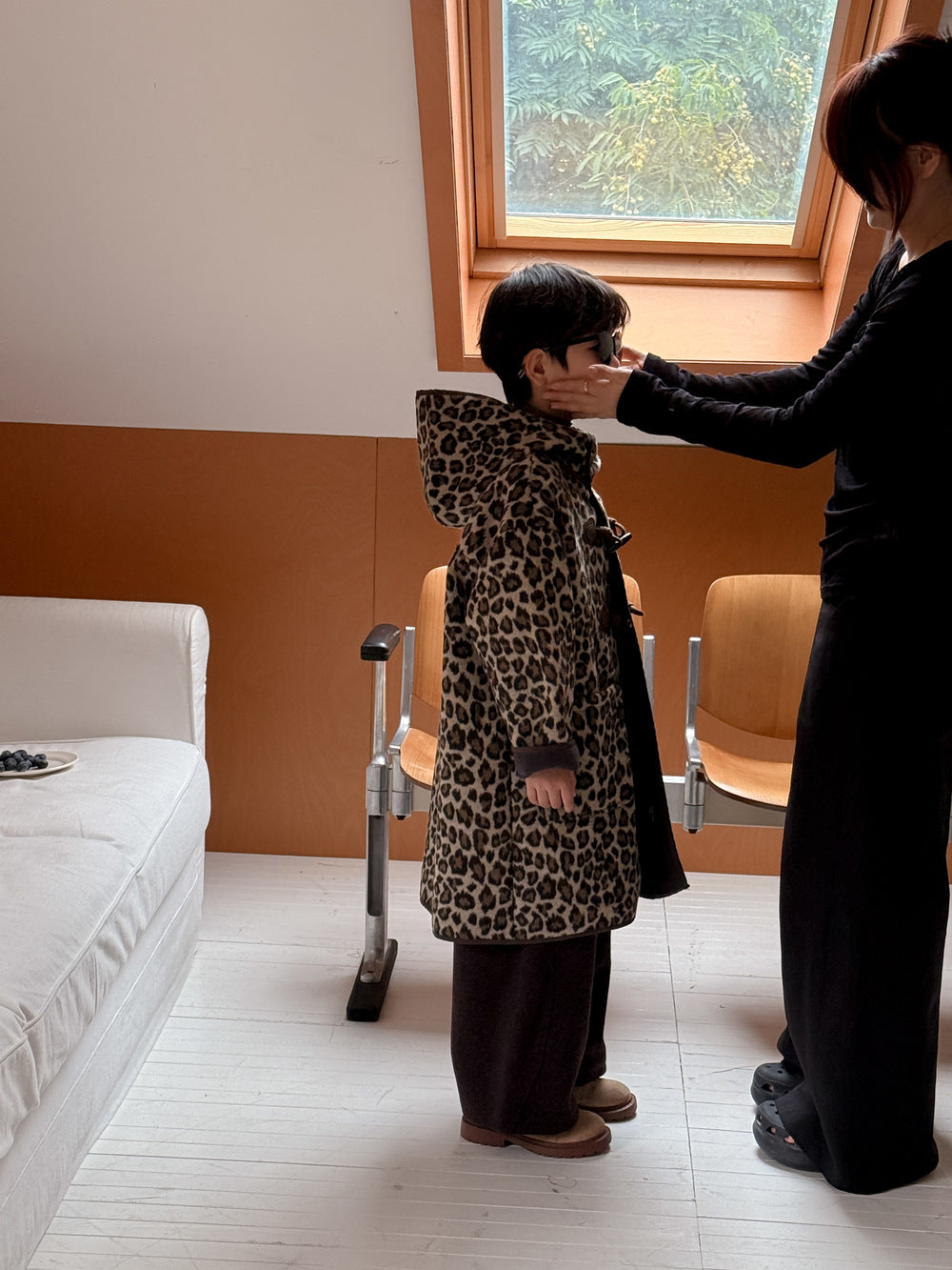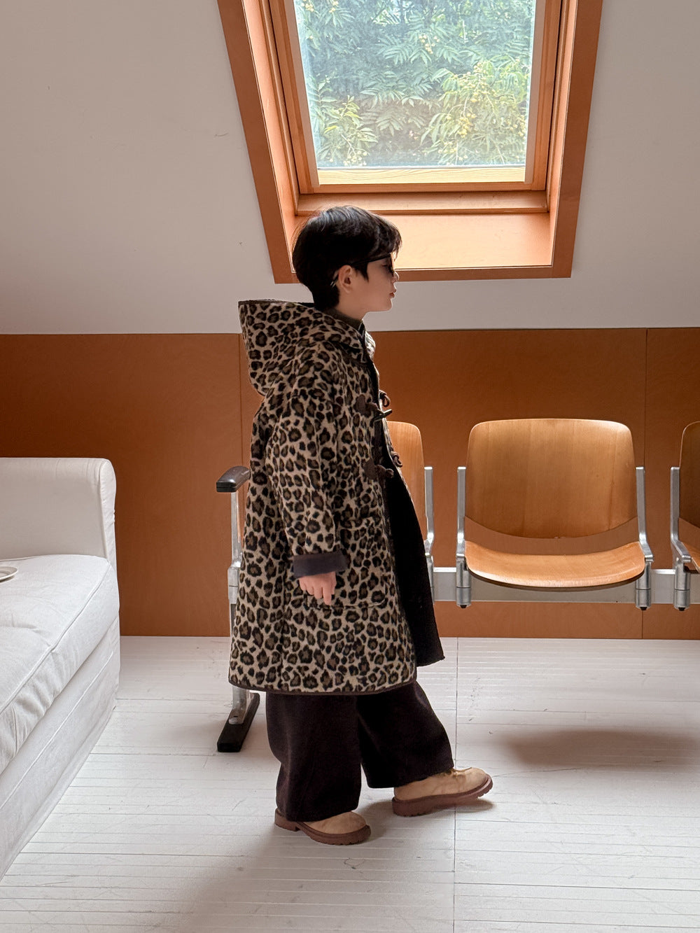 トレンドのレオパード柄をまとった、キッズダッフルコートです。落ち着いたカラーリングの柄が、カジュアルながらもスタイリッシュな雰囲気を演出します。中綿と裏起毛を施した厚手の生地で、真冬でも暖かくベビーを包み込むロング丈アウターです。フード付きのデザインは防寒性にも優れ、デイリーユースにぴったり。男の子にも女の子にも着せられるユニセックスなデザインなので、兄弟姉妹でお揃いリンクコーデも楽しめます。普段の子ども服のコーディネートを格上げする、おしゃれなカジュアルコートです。