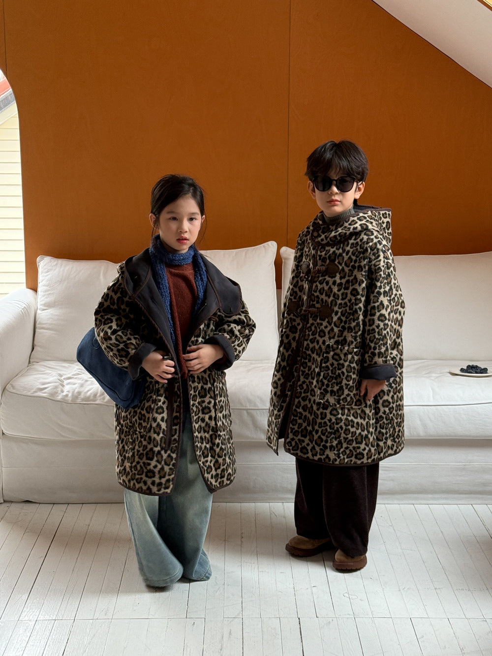 ダッフルコート キッズ レオパード柄 中綿 裏起毛 フード付 ロング丈【mh0011678】
