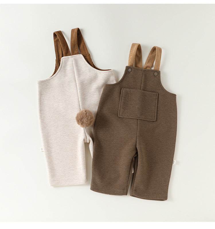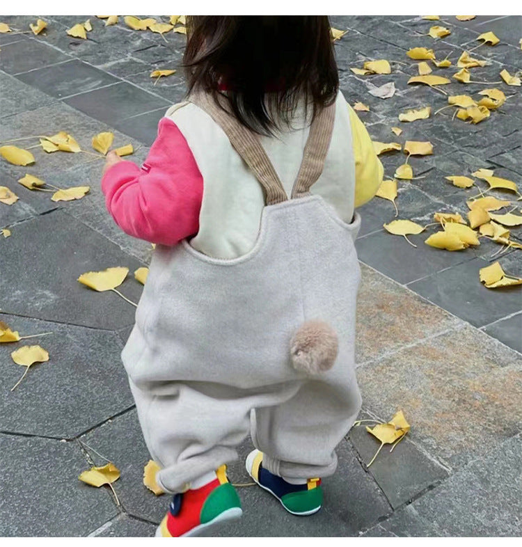愛らしいウサギのしっぽがあしらわれた、ウール調の厚手サロペット。ふっくらとした素材感と計算されたシルエットが、ベビーの愛らしさを一層引き立てます。北欧スタイルを思わせるシンプルなデザインながら、確かな防寒性を兼ね備えたオーバーオールは、寒さに負けないお出かけ着として活躍します。このベビー服のビブパンツは、機能性とデザイン性を両立し、デイリーウェアから特別な日のおしゃれまで、ベビーのワードローブに上質な彩りを与えます。