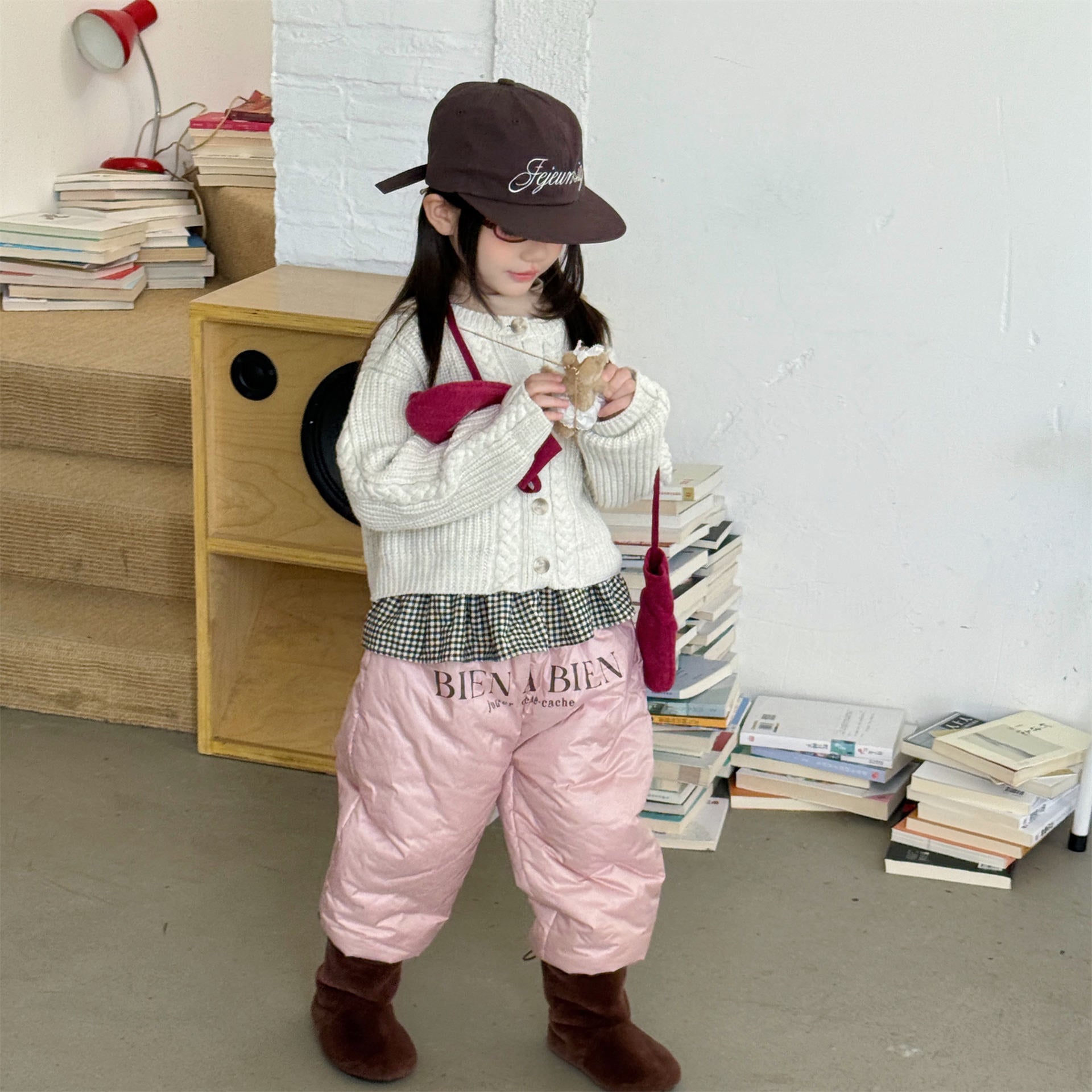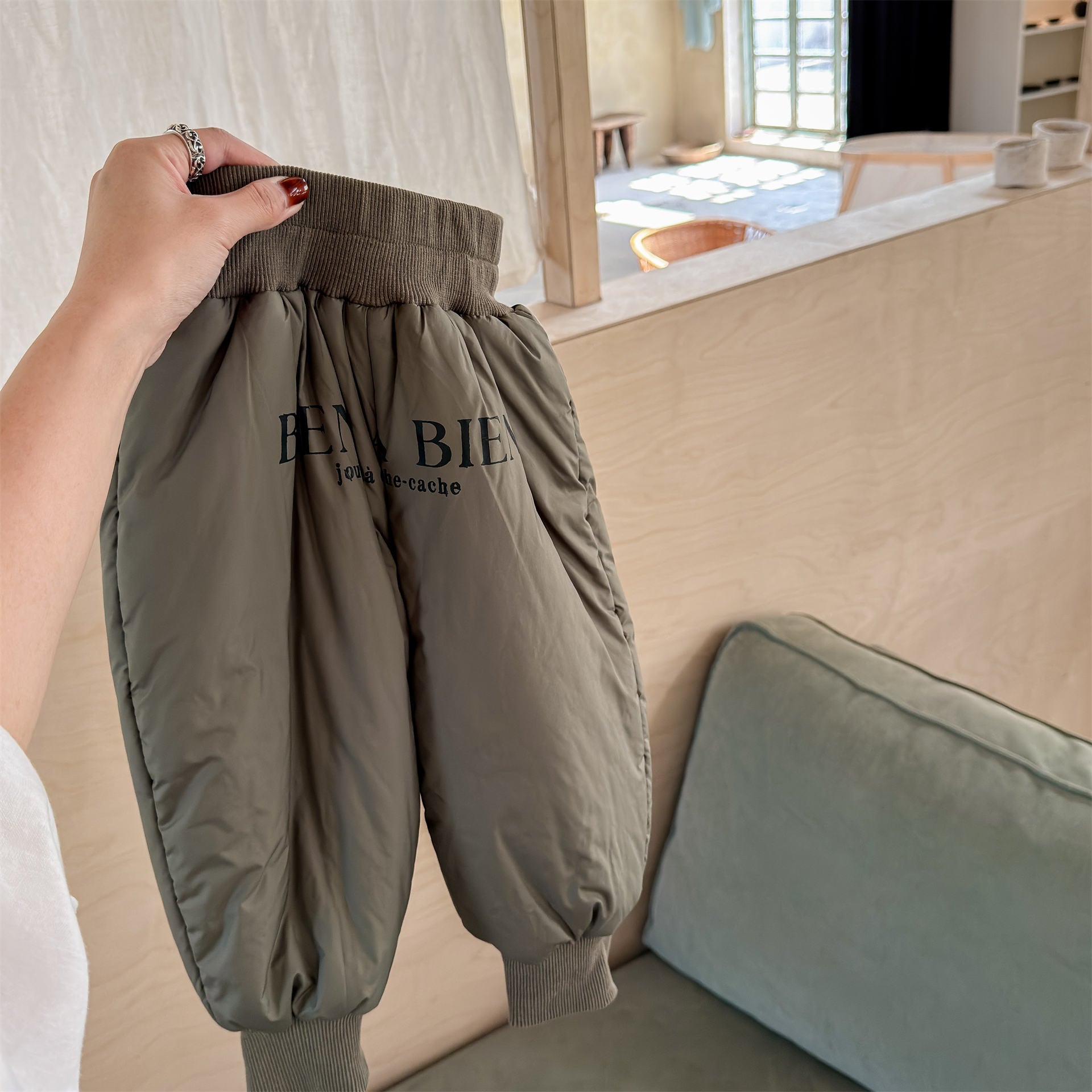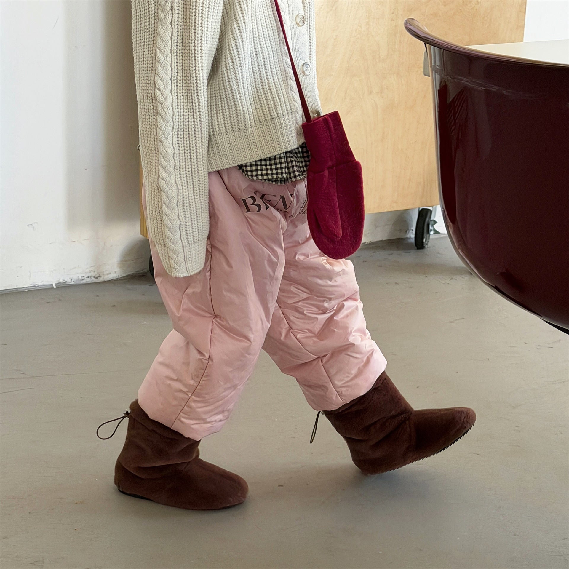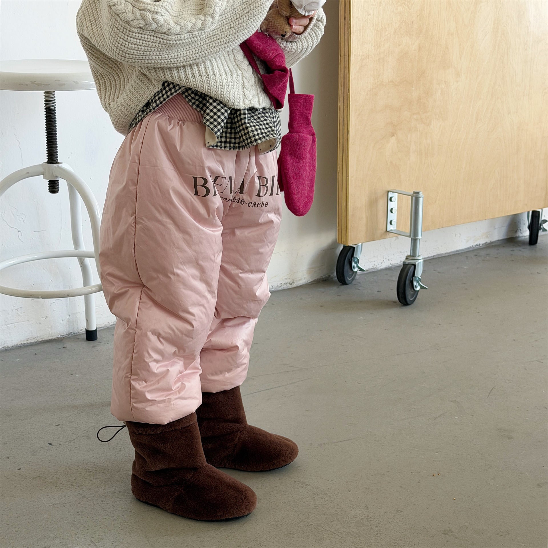 中綿を封入することで圧倒的な保温性を実現した、真冬の寒さに対応する防寒ジョガーパンツです。冷気をシャットアウトする厚手の生地感ながら、裾を絞ったジョガーシルエットに仕上げることで足元をすっきりと見せ、活発な動きを妨げない快適な穿き心地を実現しています。さりげなく施されたロゴプリントがスポーティーなアクセントを加え、男の子にも女の子にも似合う洗練された韓国スタイルのデザインが魅力です。通学や冬の屋外レジャーなど、厳しい寒さの中でもお子様の足を暖かく守る、機能性とファッション性を兼ね備えた頼れる一着です。