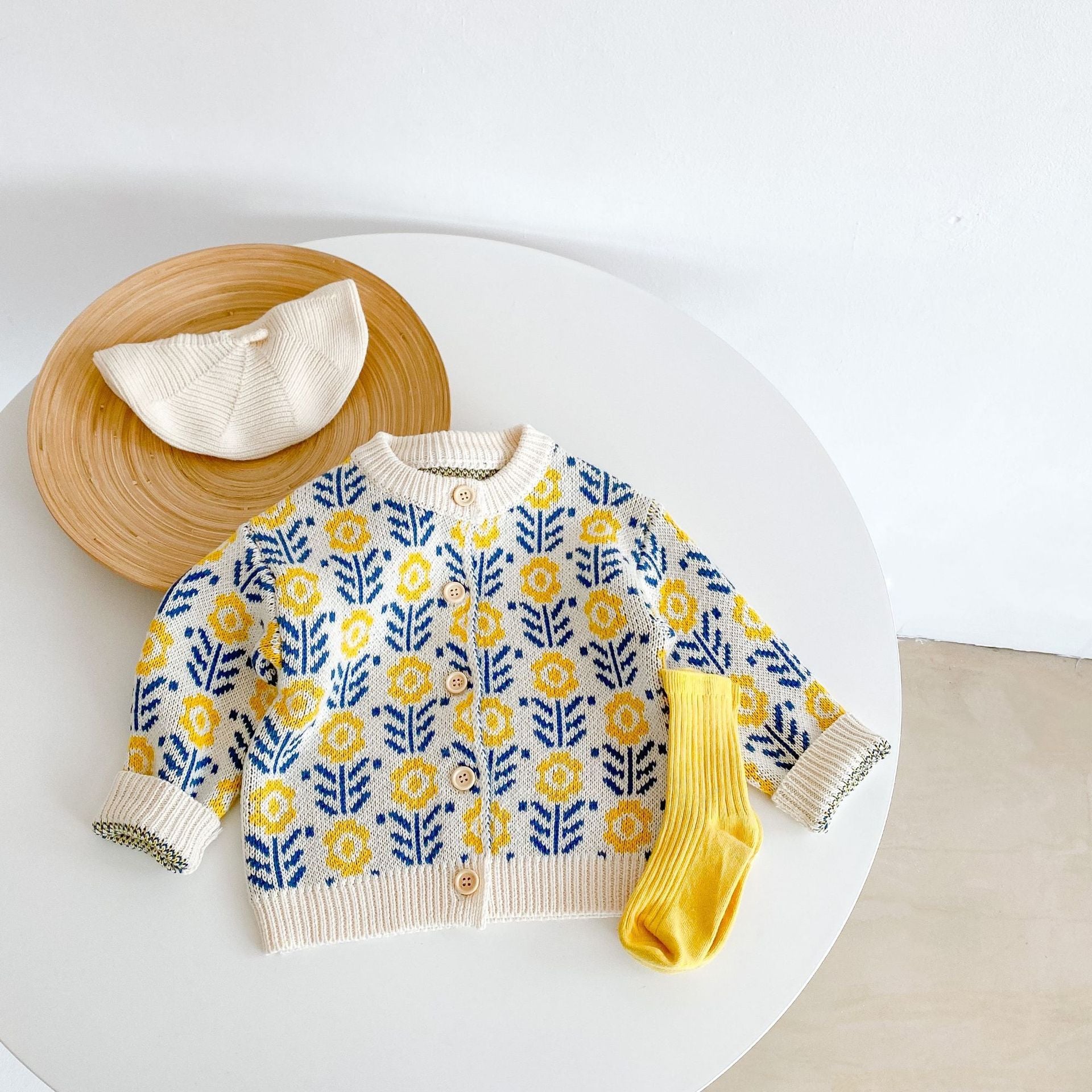大切なお子さまの肌に優しいコットン100%素材を使用。ふんわりとした柔らかさと、程よい厚みのあるジャガード編みが、寒い日でもあたたかく包み込んでくれます。生成り色をベースにした優しいイエローとネイビーの配色は、陽だまりのような温かみを感じさせます。