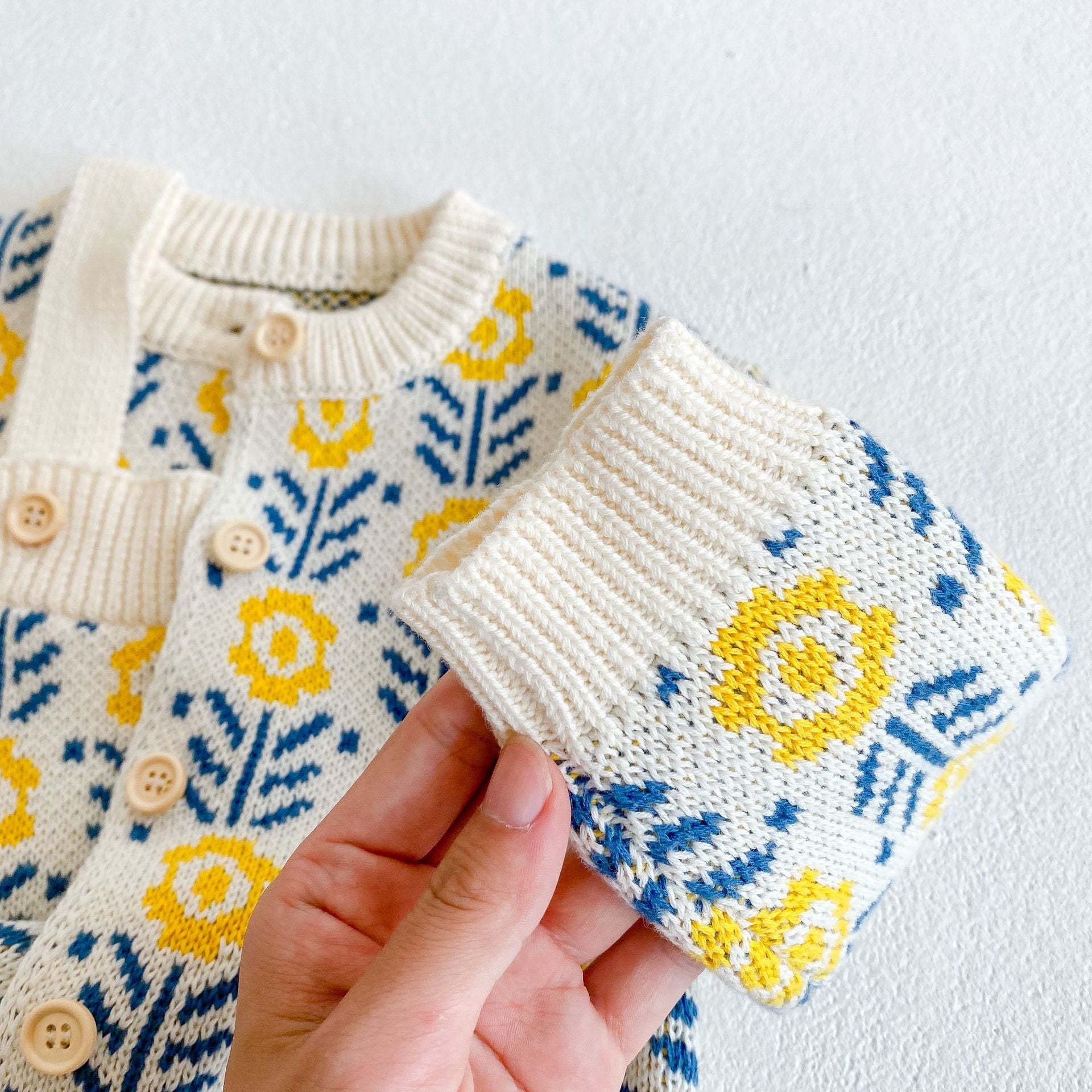通気性と保温性のバランスが良いコットンニットは、春・秋・冬とロングシーズン活躍します。カーディガンは温度調節に便利で、ロンパースは肩のボタンと股下のスナップボタンで、お着替えやオムツ替えもスムーズに行える実用的なデザインです。