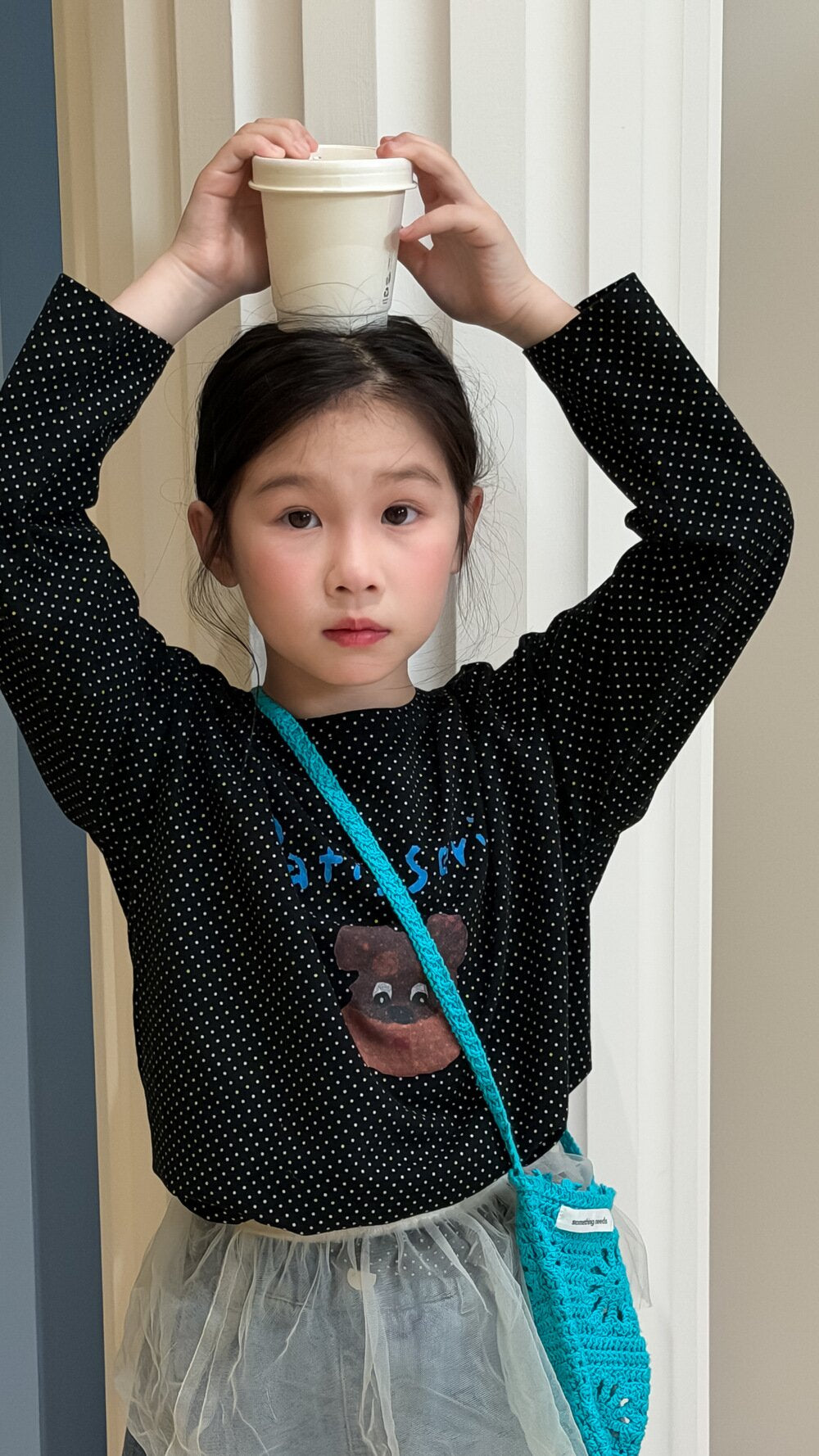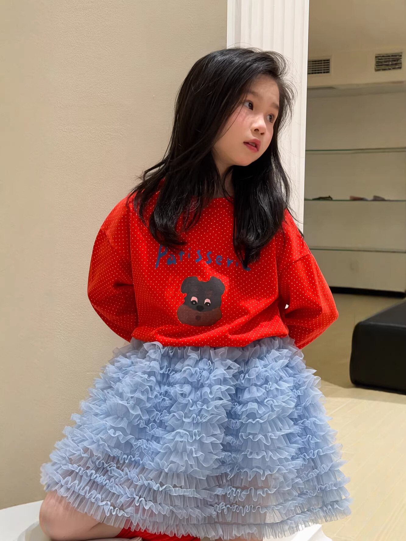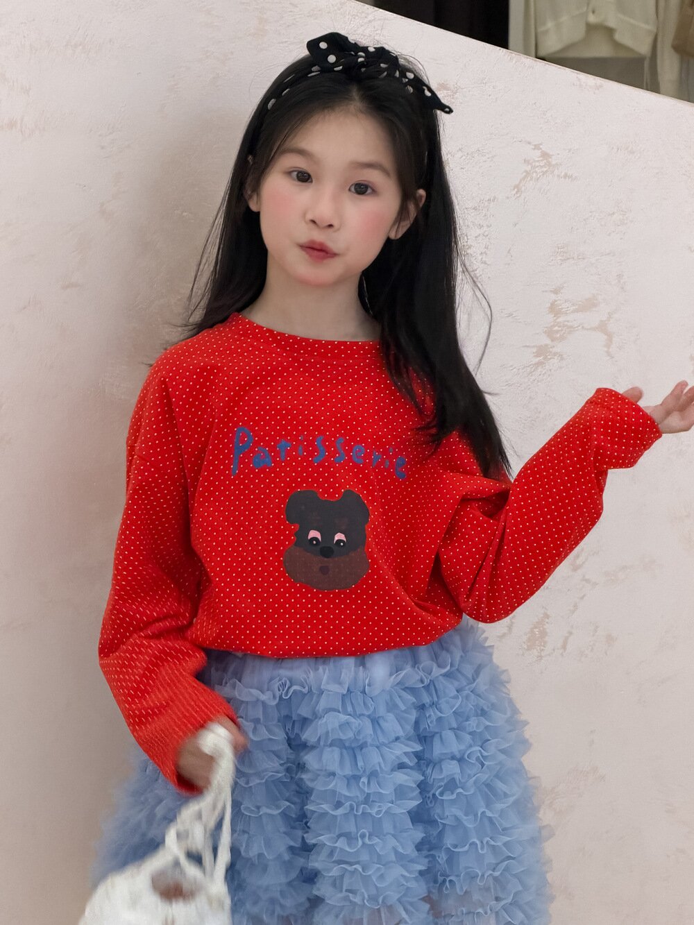クラシックな水玉模様(ドット柄)をベースに、愛嬌たっぷりのキャラクタープリントとレターロゴをあしらった、韓国スタイルのトレンド感あふれる一着です。情熱的なレッドと、着回し力の高いブラックの2色展開。袖口はすっきりとした長袖で、春のデイリーコーデを明るく彩ります。