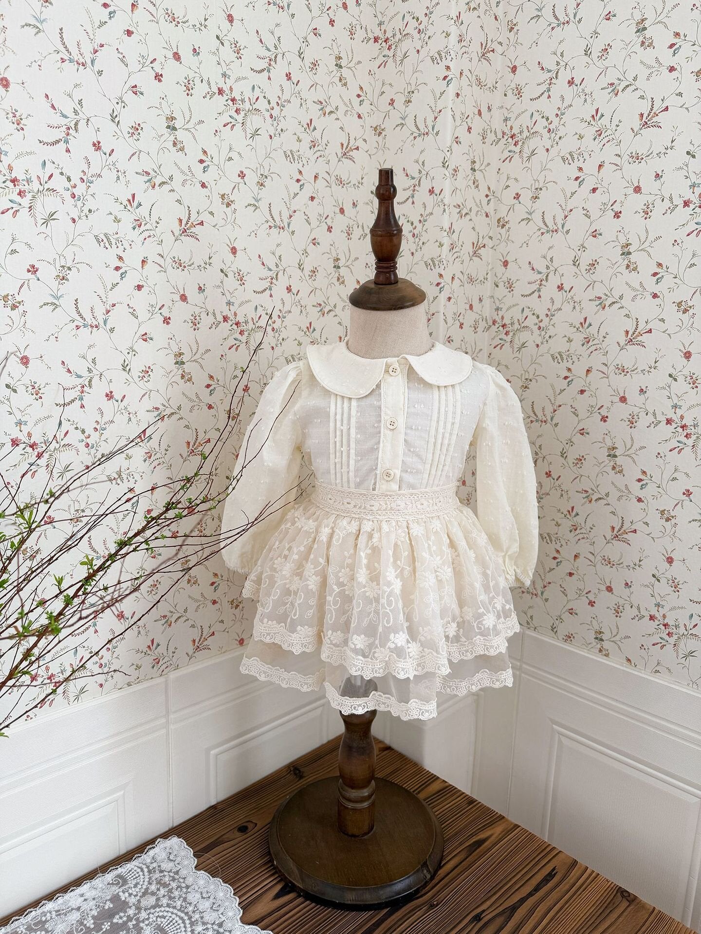 全体に施された繊細な刺繍レースが目を引く、スカートのような華やかさを持ったキュロットパンツです。贅沢に重ねたレースとチュールのフリルが、お子様が動くたびにふんわりと軽やかに揺れ、特別な日の装いから日常のお出かけまで、可憐な表情を演出します。