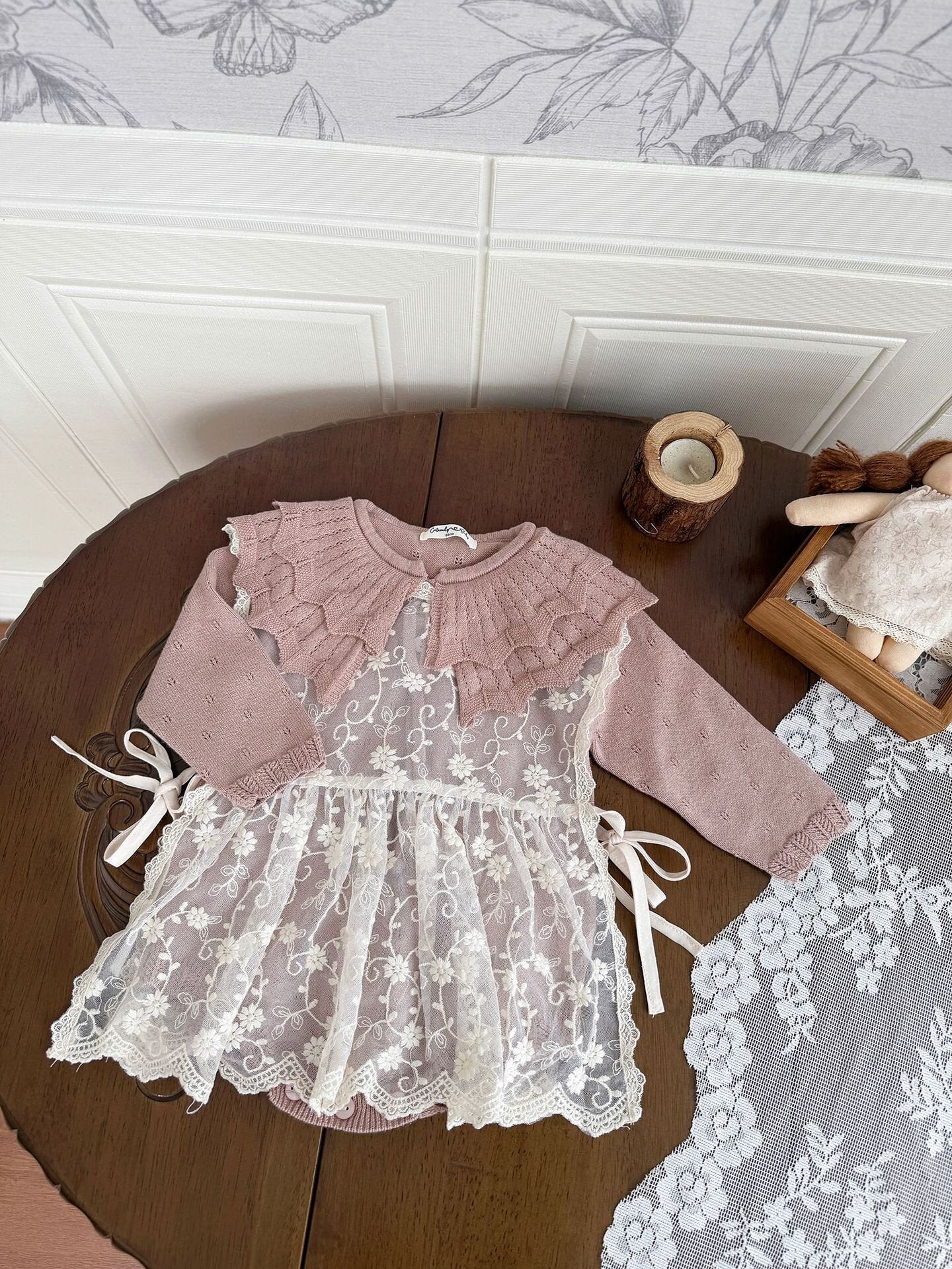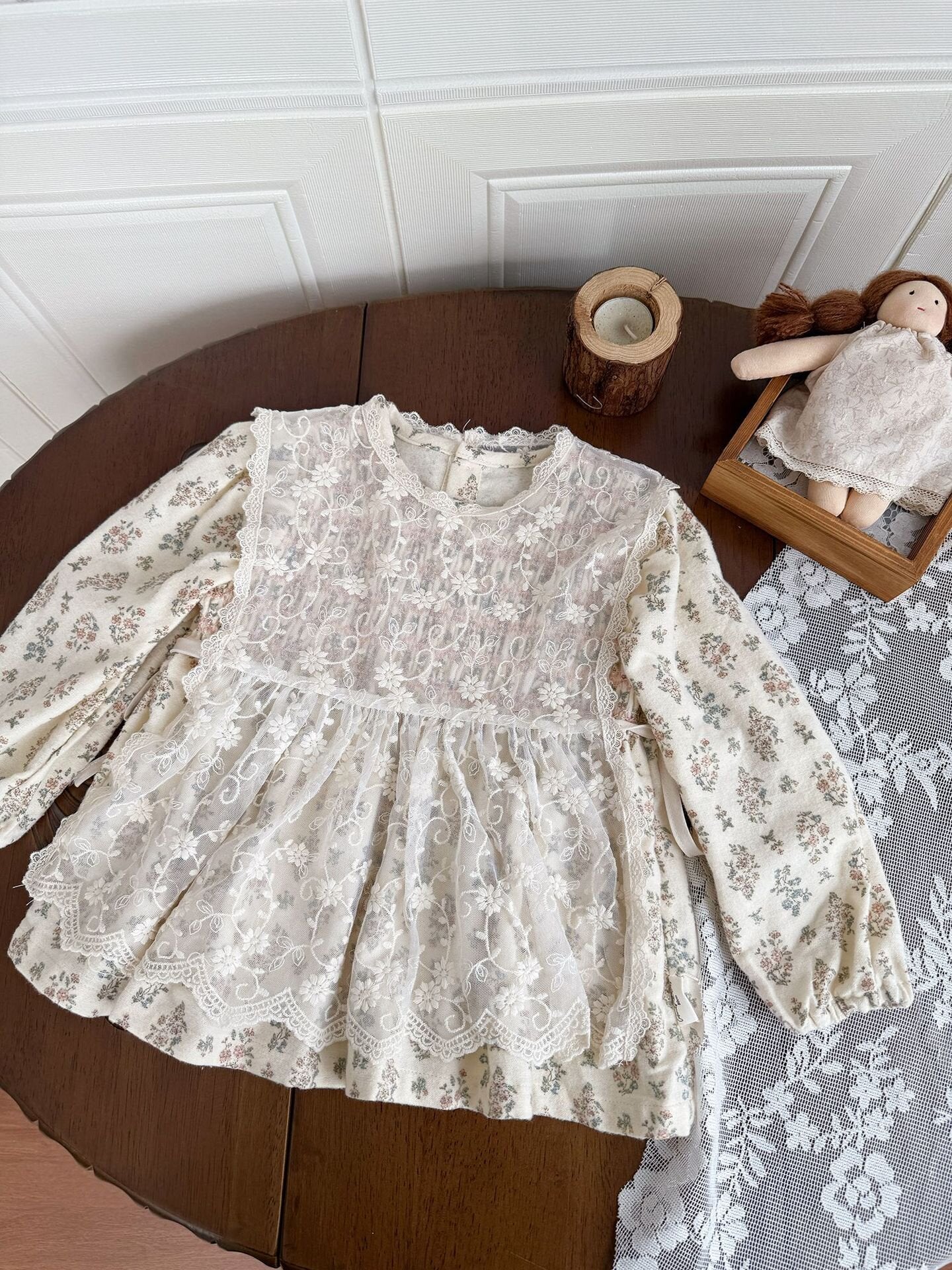 全体に広がる繊細なフラワーモチーフの刺繍が、お子様の装いをいっそう華やかに彩ります。柔らかなコットンブレンドのレース生地を使用しており、肌当たりも優しく軽やかな着心地が魅力です。