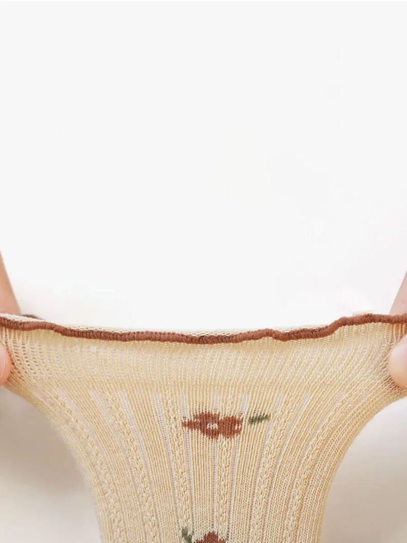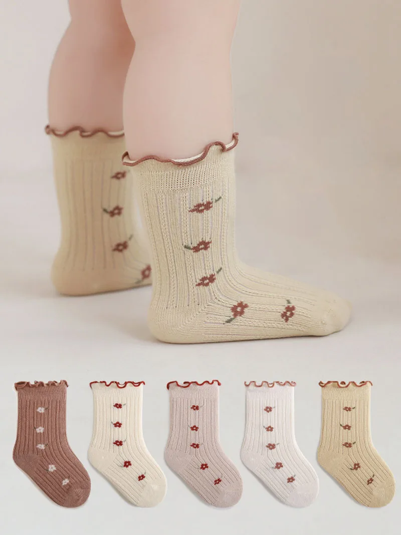 おしゃれなフラワーデザインが特徴のベビーキッズソックス、5足セットが新登場です。足元から華やかに、そして快適に過ごせるようなデザインとなっています。フリルのディテールが可愛さを引き立て、さらにお子様のコーディネートを華やかに演出します。優れた伸縮性とやわらかい肌触りで、お子様の足元を快適に包み込みます。幅広いサイズ展開なので、お子様の成長に合わせてお使いいただけます。