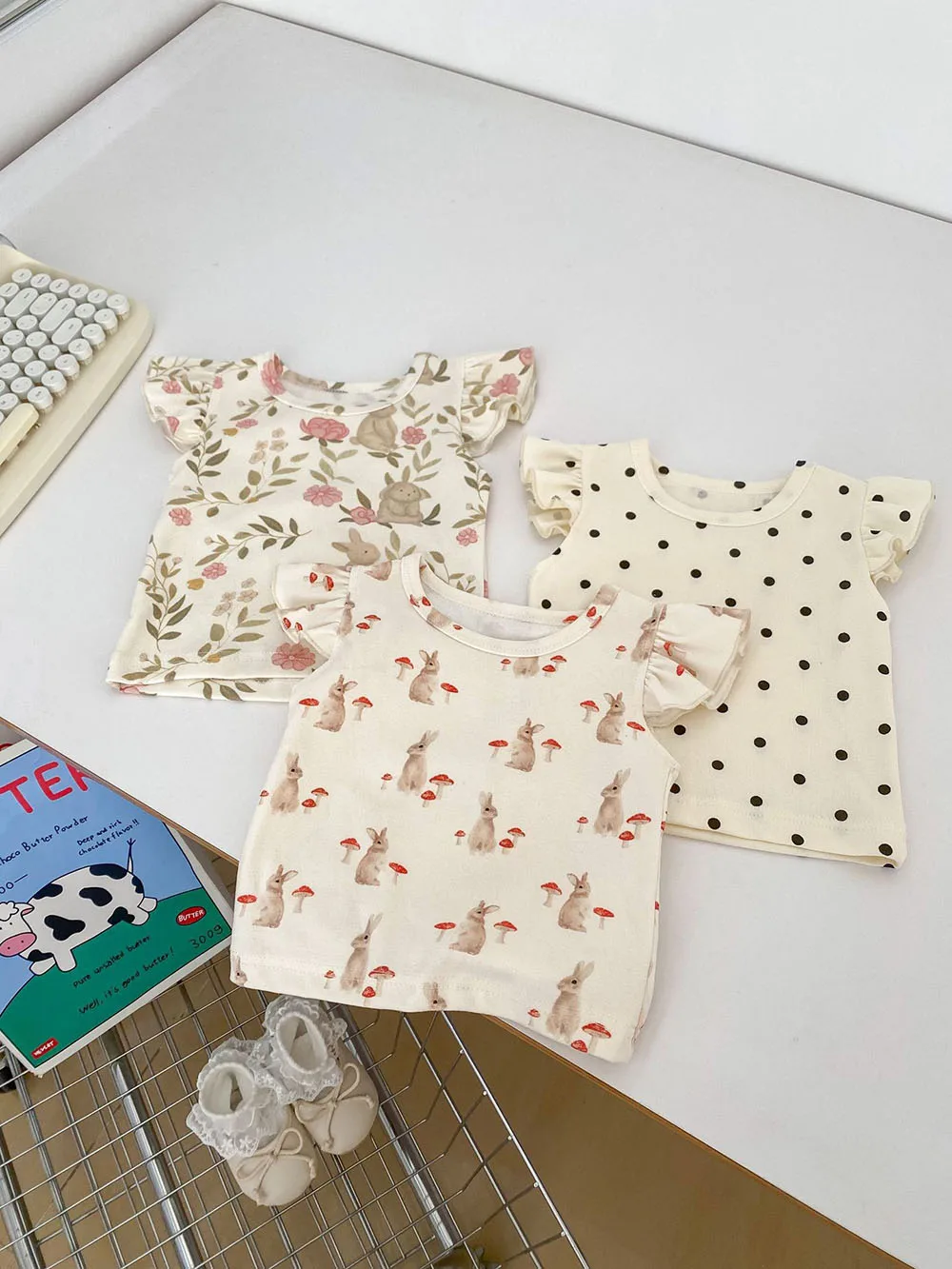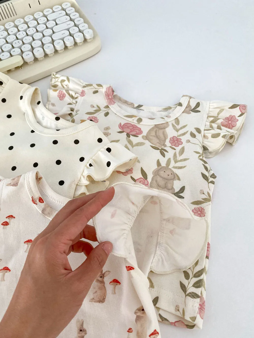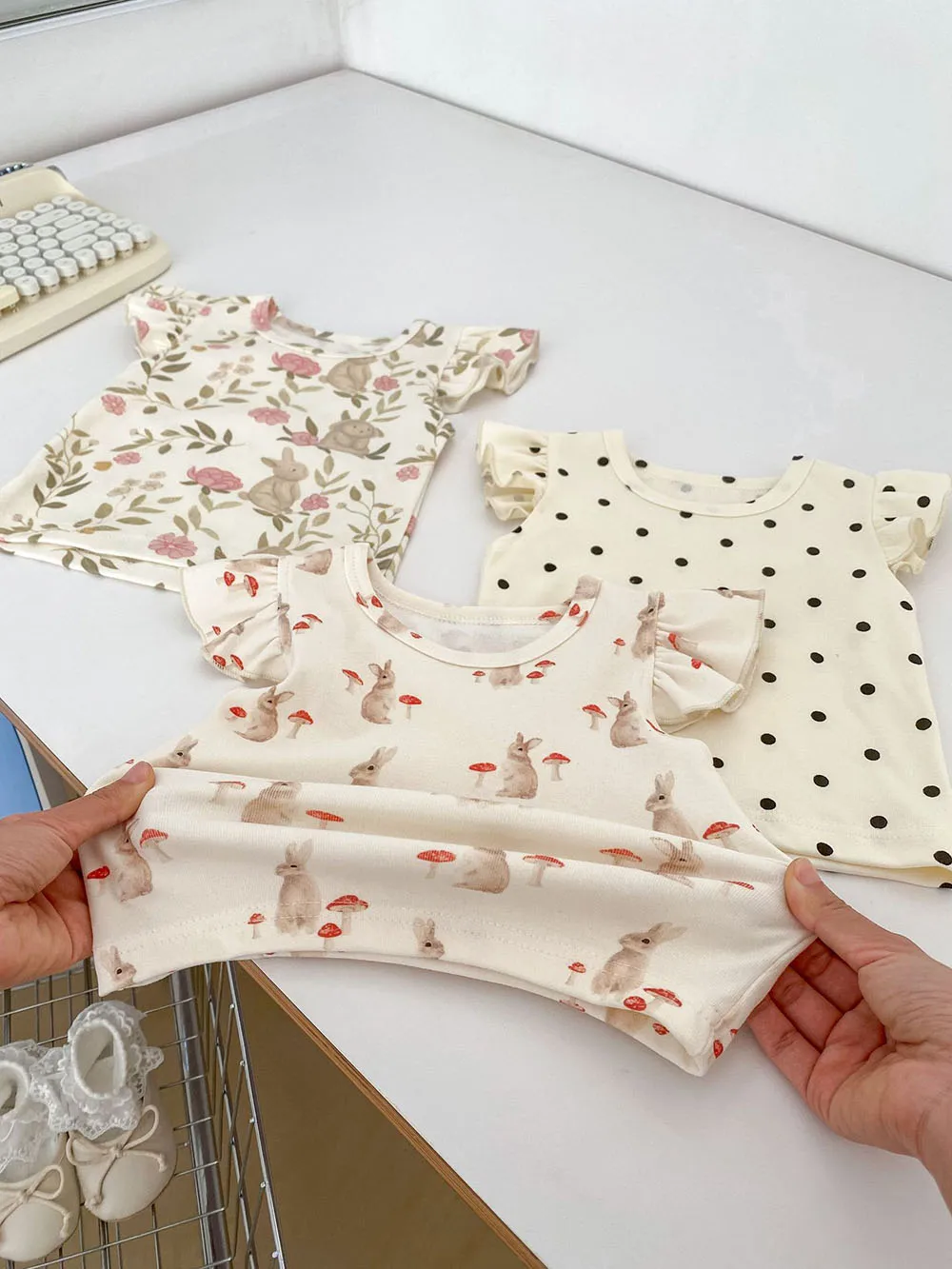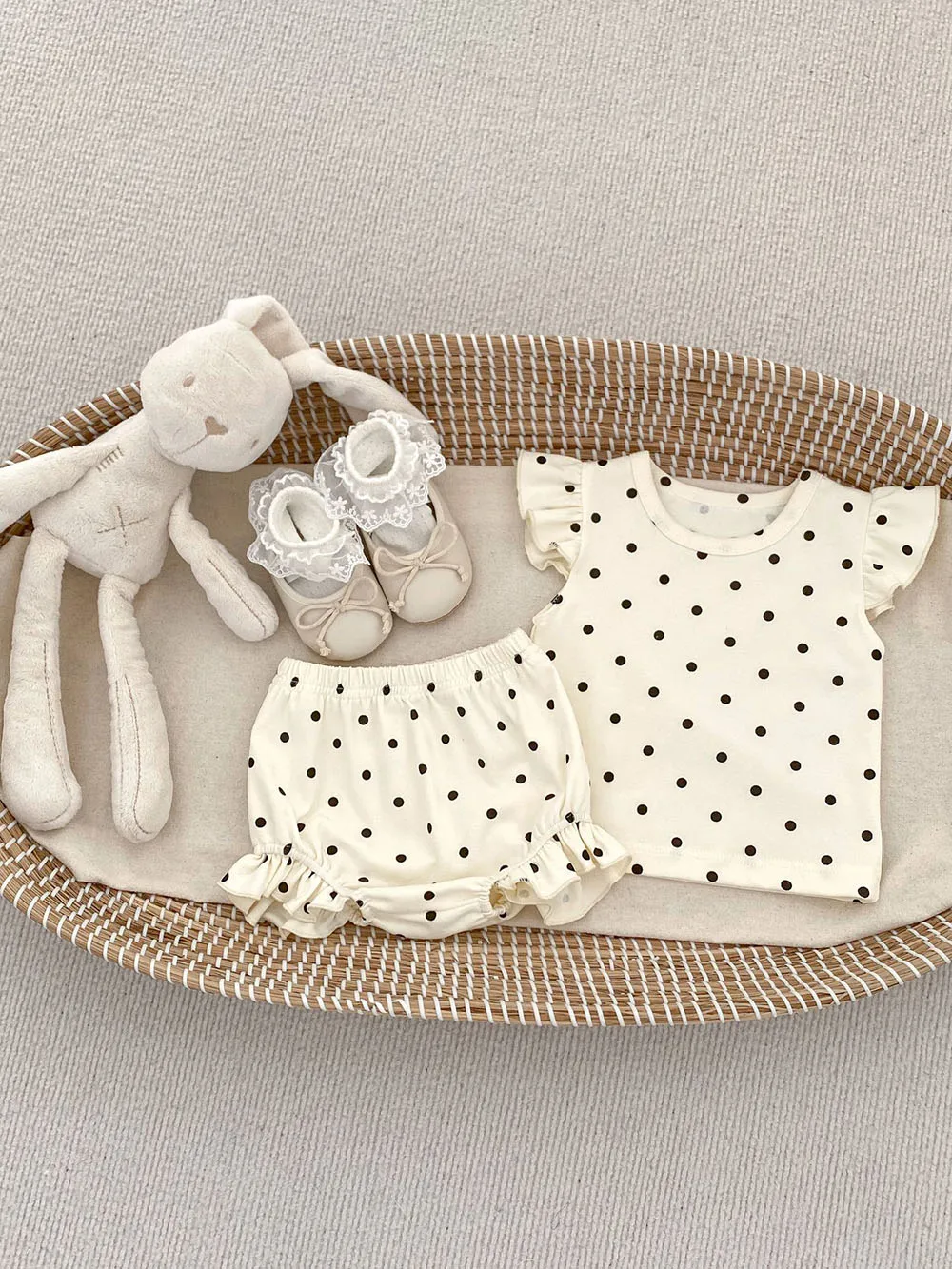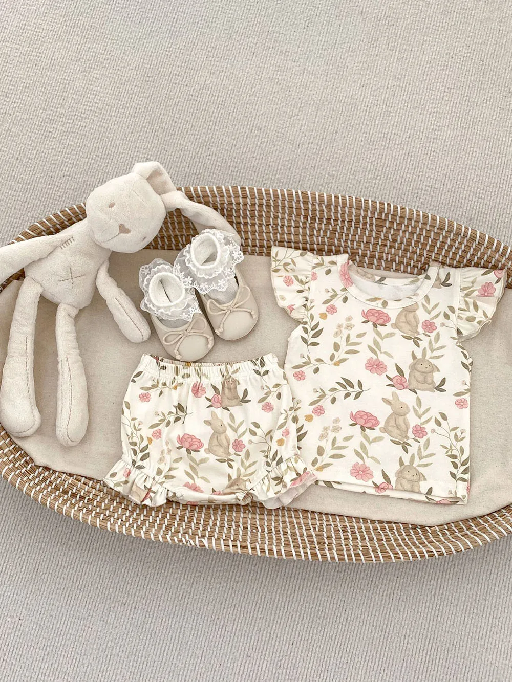 新生児からのおしゃれなベビー服セット。うさぎやマッシュルーム、水玉ドットの可愛らしいデザインのフリルスリーブTシャツとブルマパンツの2点セット。夏にぴったりの爽やかなスタイルで、お子様はもちろん、ママも喜ぶこと間違いなし!