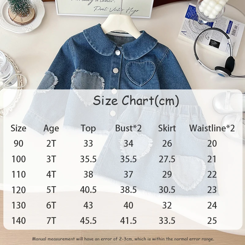 キッズセットアップ デニムパッチワーク長袖ブラウス+ハートパッチワークスカート【mh0006936】