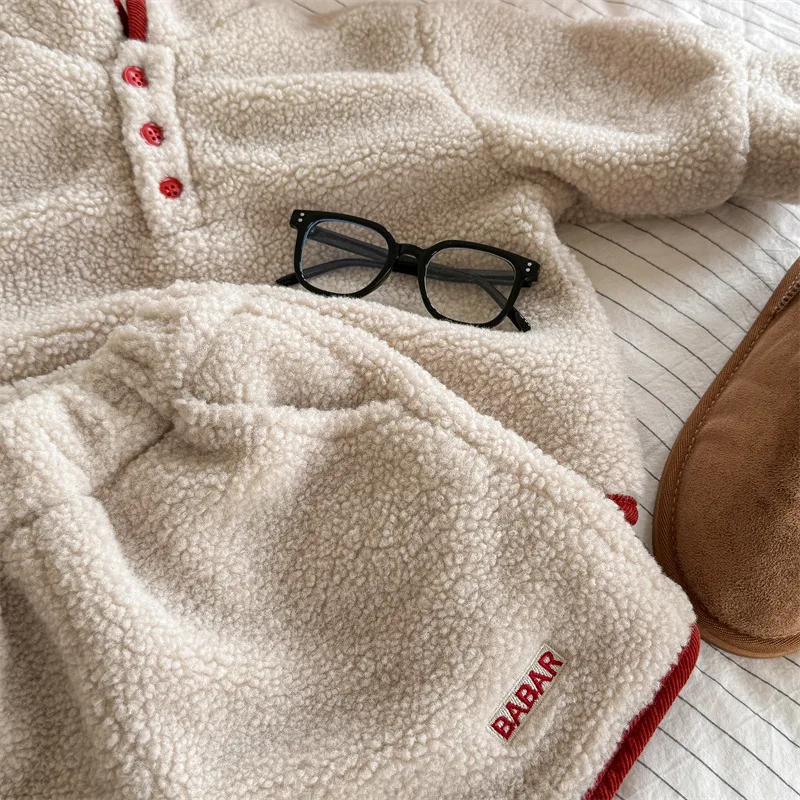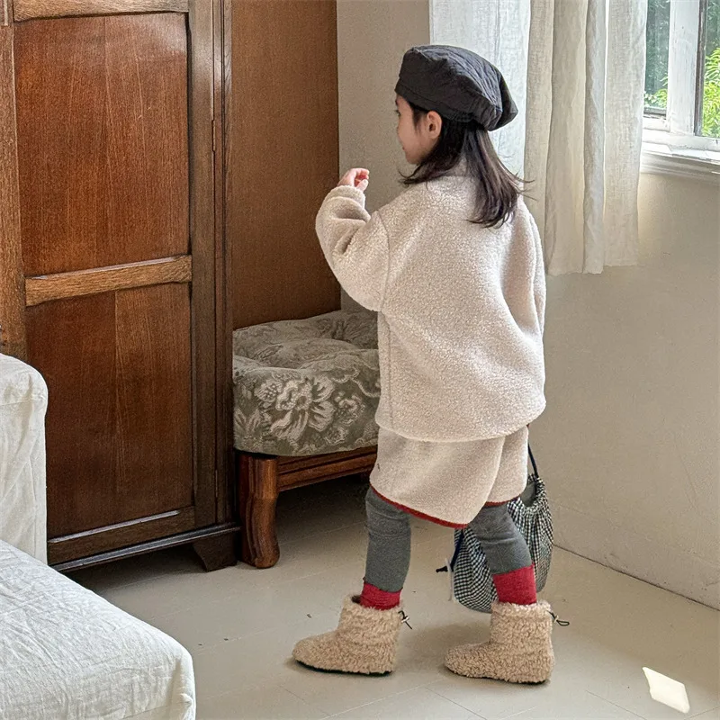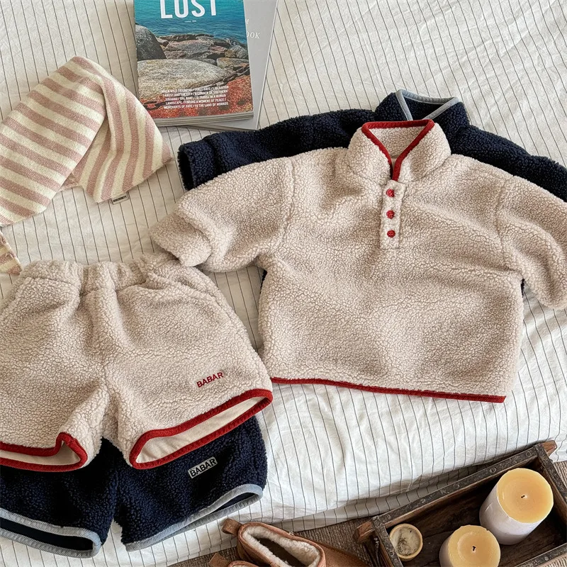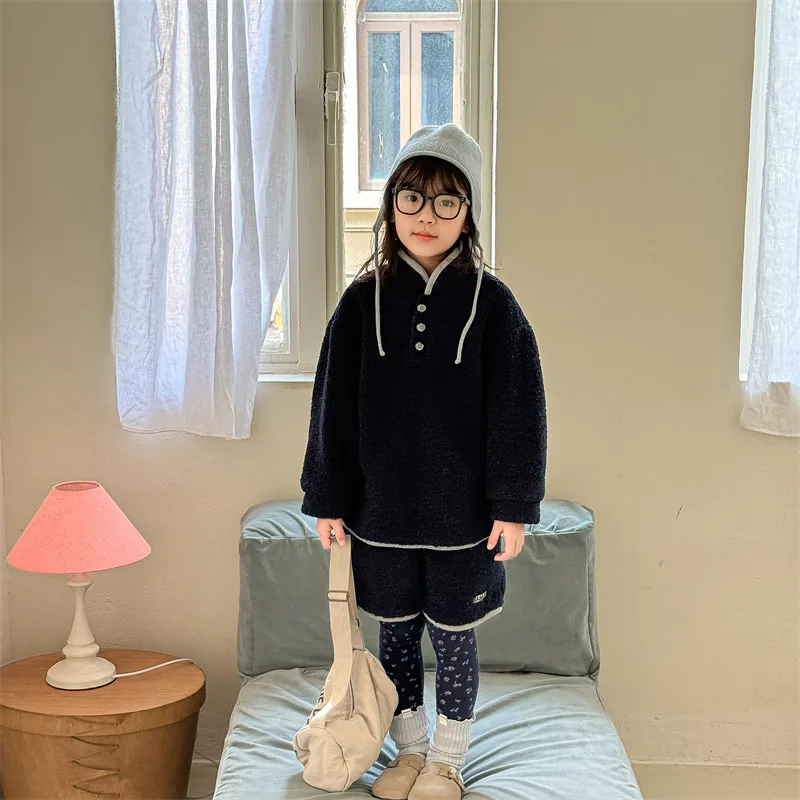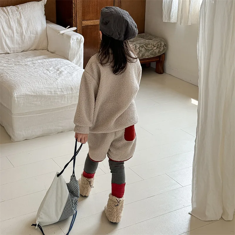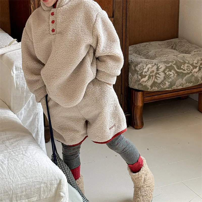 スタンドカラーのボアフリーススウェットシャツとショートパンツの2点セットは、寒い日でも暖かく快適に過ごせるアイテムです。柔らかなフリース素材が肌に優しく、温かさをしっかりと保ちます。スウェットシャツはスタンドカラーで首元もしっかりと保温し、ショートパンツは動きやすく、お子さまの活発な動きに対応します。シンプルでありながら、ボアフリースならではの暖かさと可愛らしさが特徴で、普段使いやお出かけにもぴったりです。寒い季節のコーディネートに役立つ、実用的かつおしゃれなセットです。