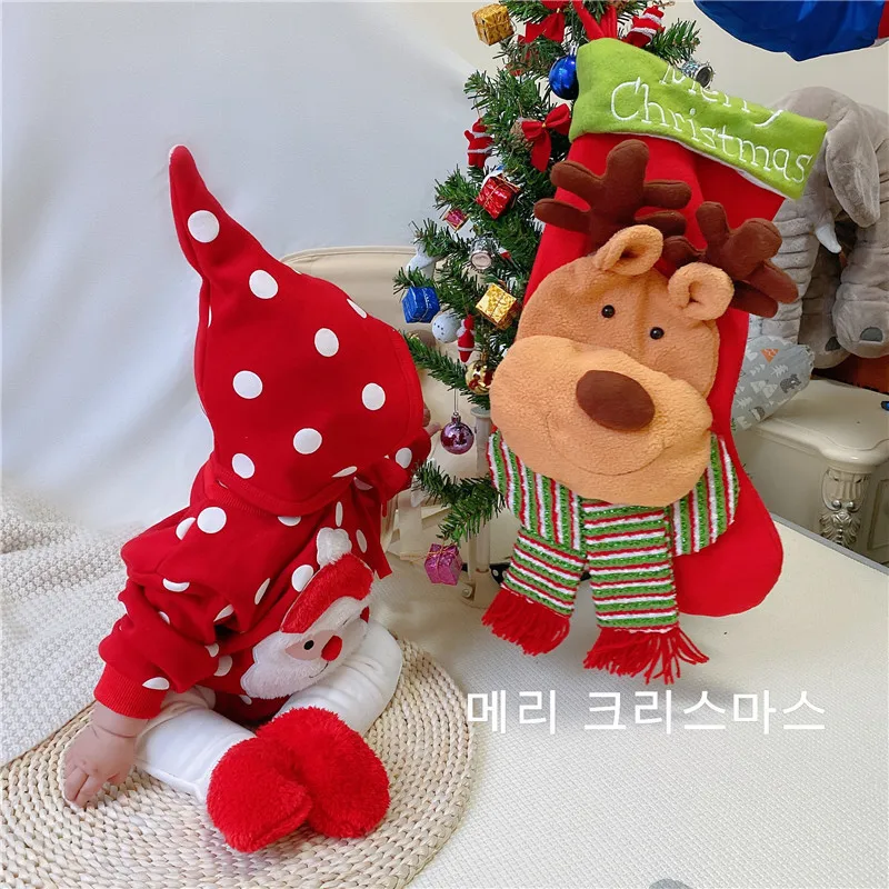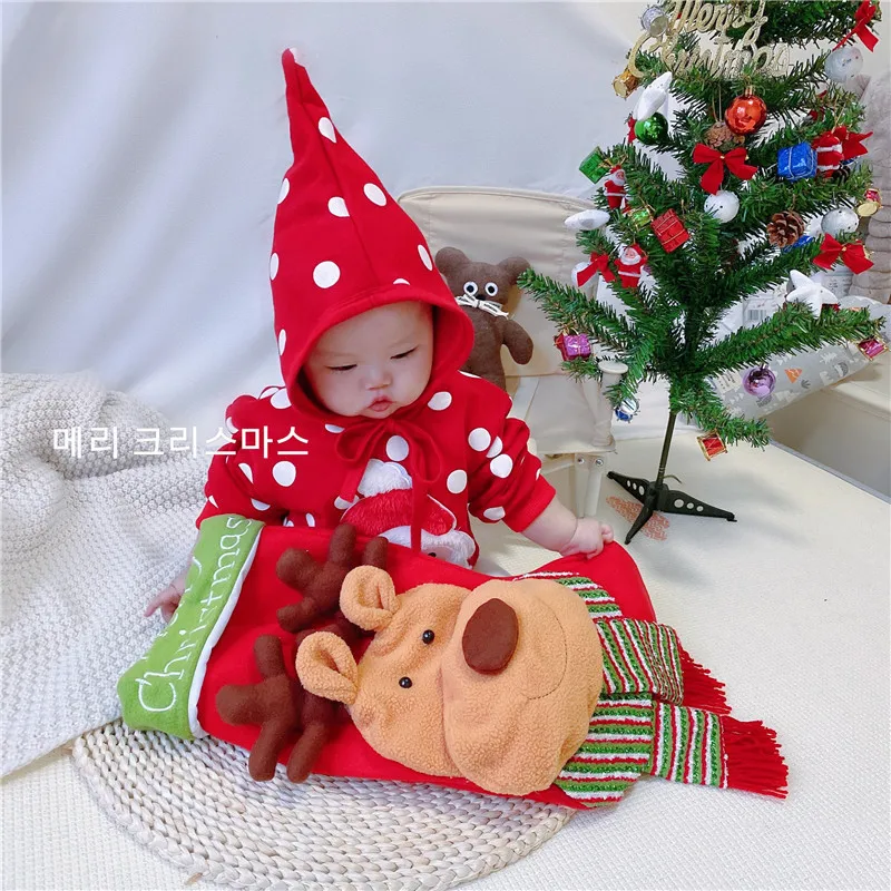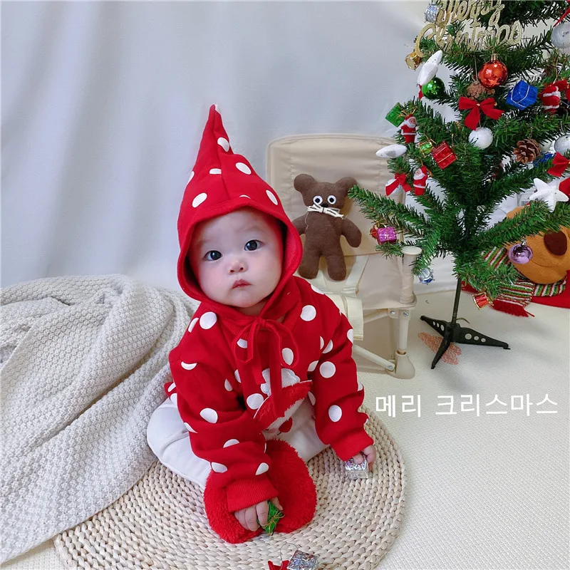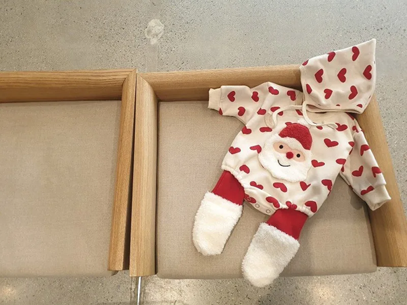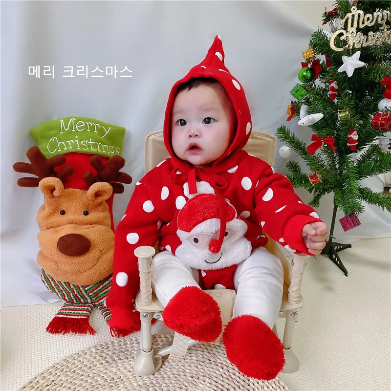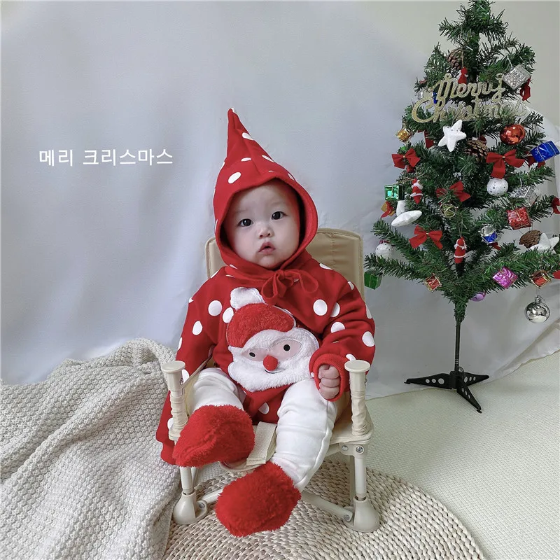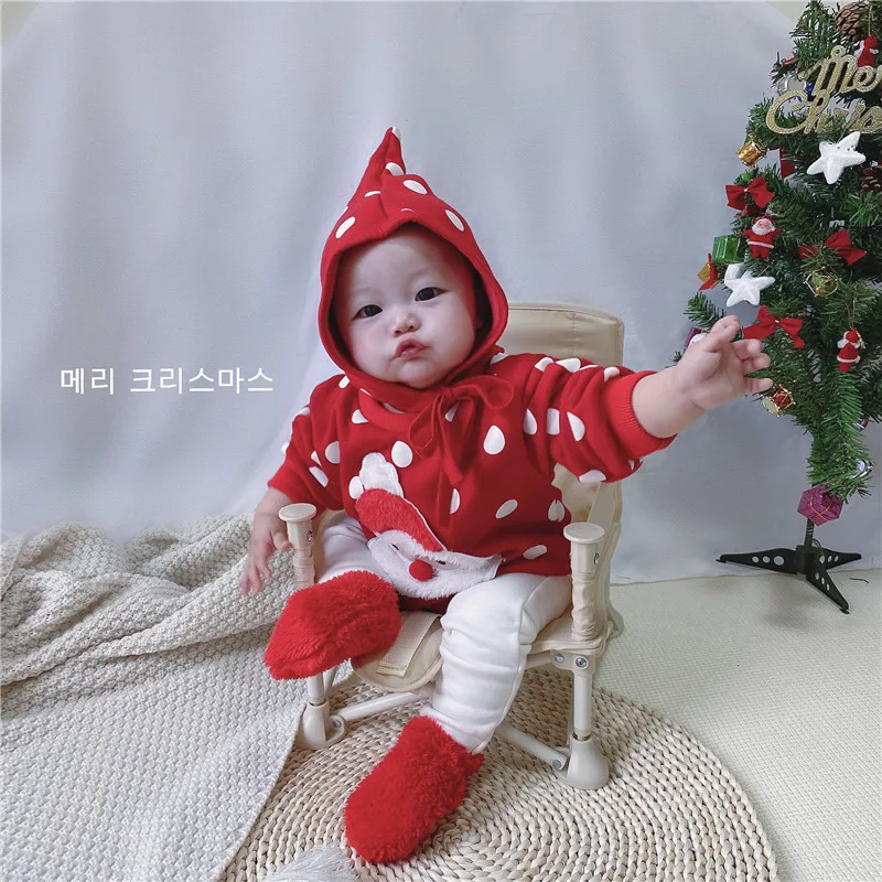 クリスマスの雰囲気が漂うサンタ風の長袖ボディスーツ、ボンネット帽子、足つきレギンスパンツのセットは、赤ちゃんの特別な冬を彩る一着です。柔らかなベロア素材が心地よく、保温性も抜群。ボディスーツは着脱が簡単で、ボンネット帽子と足つきレギンスが全身を暖かく包みます。赤と白を基調としたデザインがクリスマスや新年のイベントにぴったり。記念写真やお祝いの日に最適なコーディネートです。