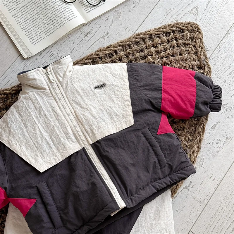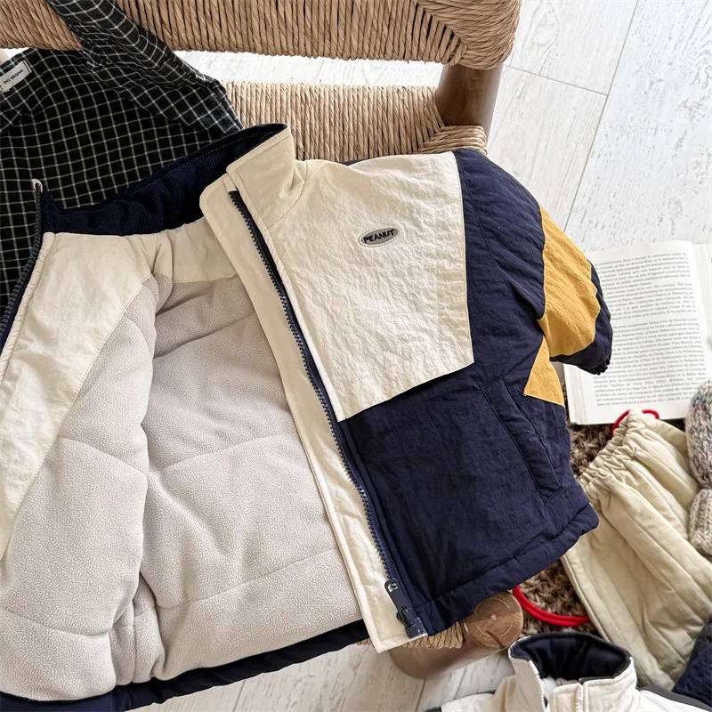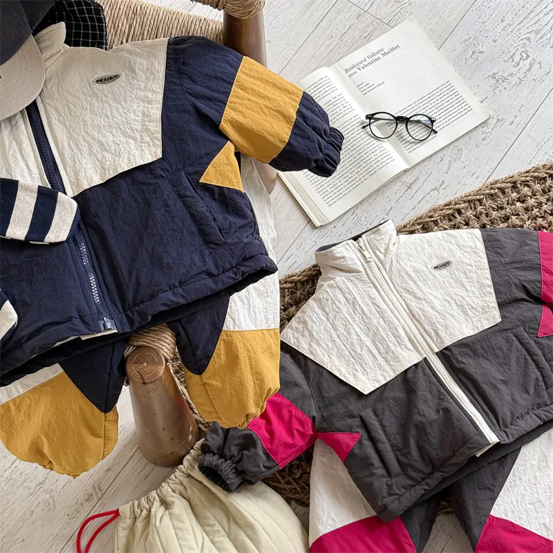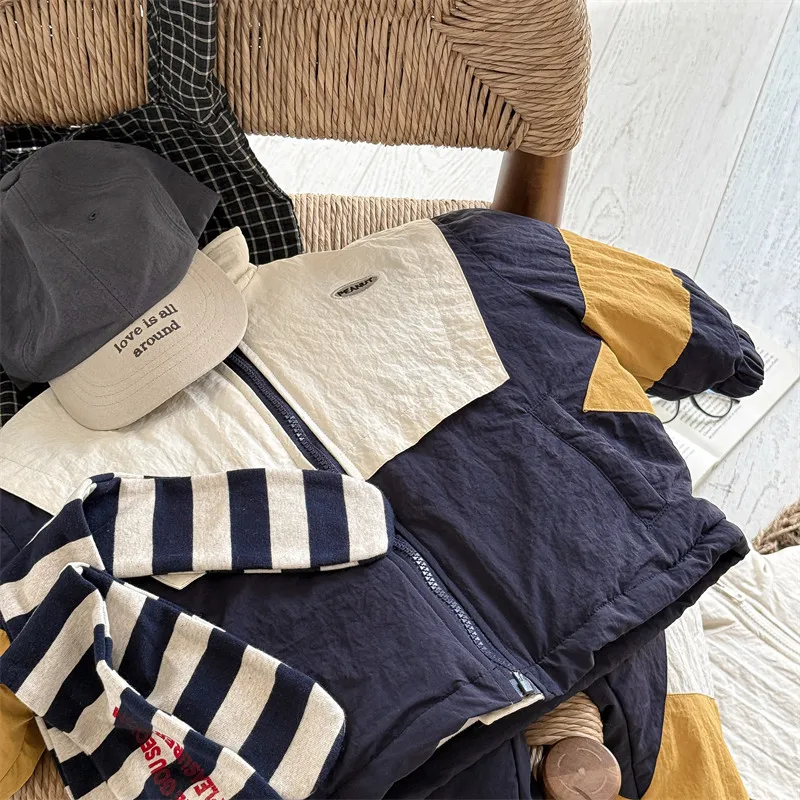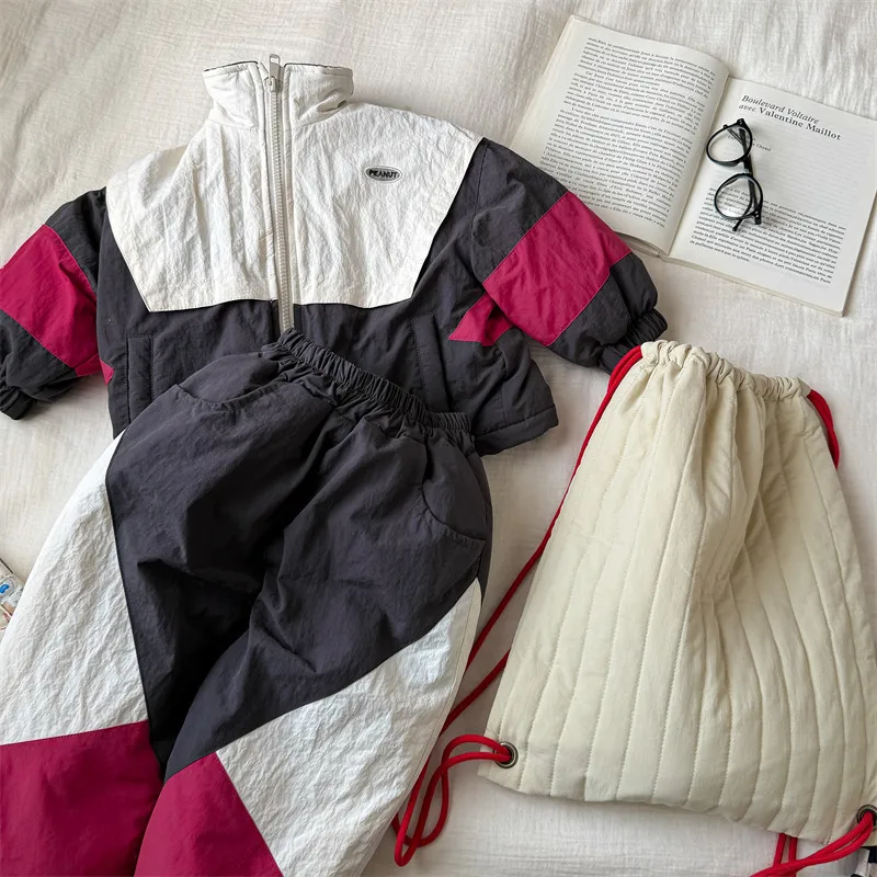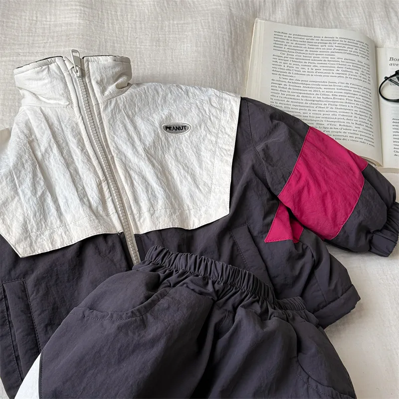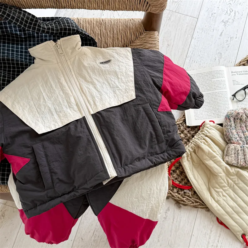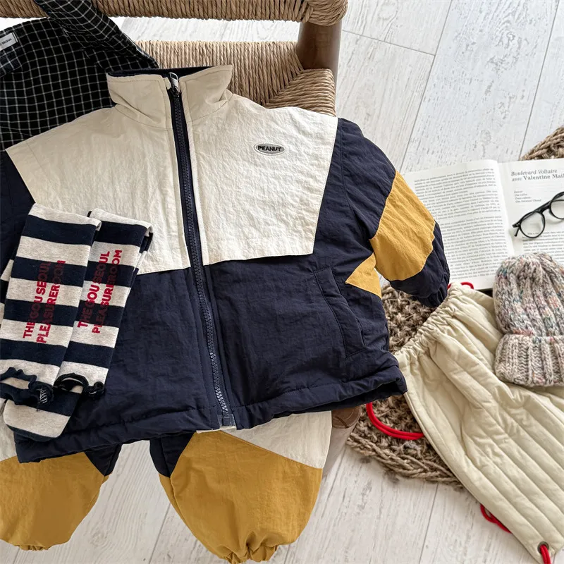 パッチワークデザインのパデッドスタンドカラージップアップジャケットとスポーツロングパンツの2点セットは、冬の寒さからお子様をしっかり守るスタイリッシュなアイテムです。ジャケットは厚手の裏フリース素材を使用し、保温性が高く、快適な着心地を実現しています。ジップアップデザインにより、着脱も簡単で、重ね着にも最適です。ロングパンツは動きやすく、アクティブなお子様にぴったりなスタイルです。このセットはデイリーから特別な日まで幅広く対応し、暖かさとおしゃれを両立させたコーディネートを楽しめる一着です。