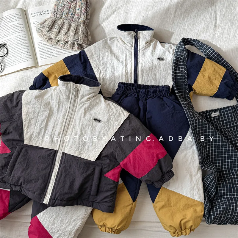 キッズセットアップ 2点セット パッチワークパデッドスタンドカラージップアップジャケット+スポーツロングパンツ【mh0008319】