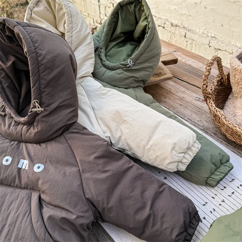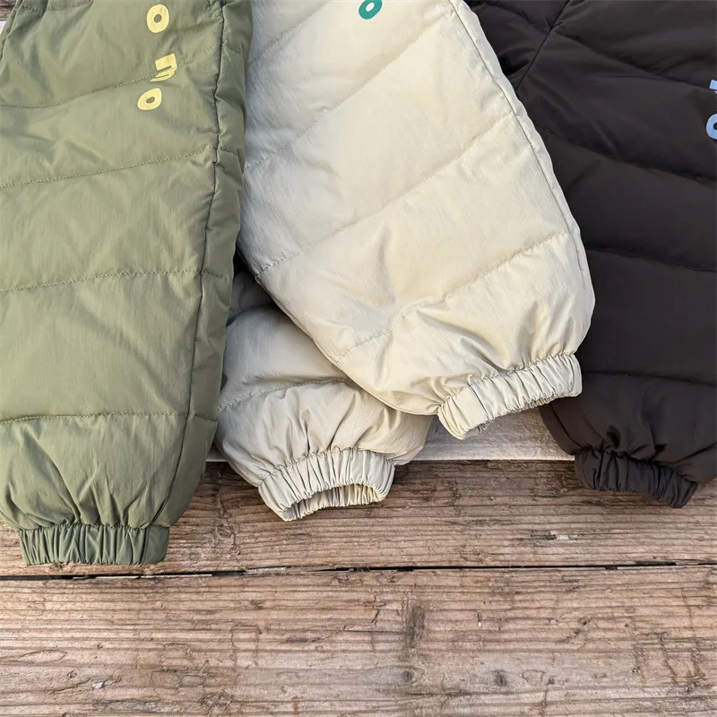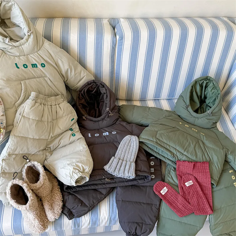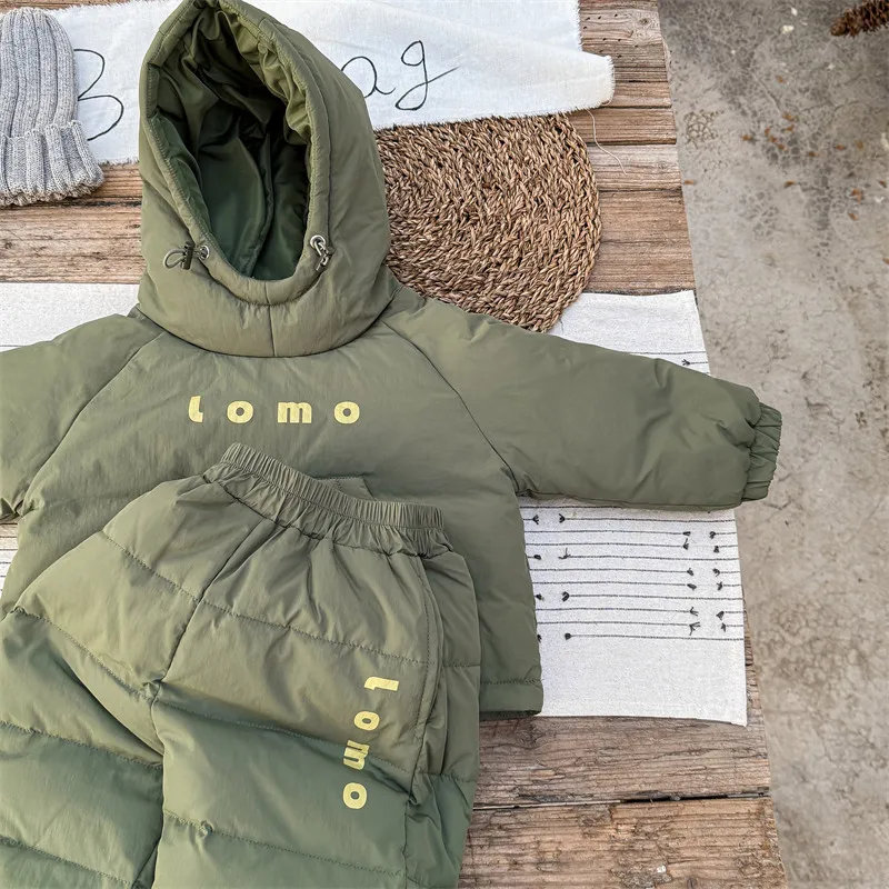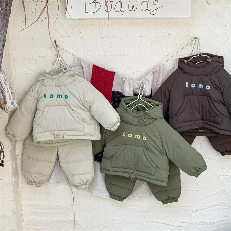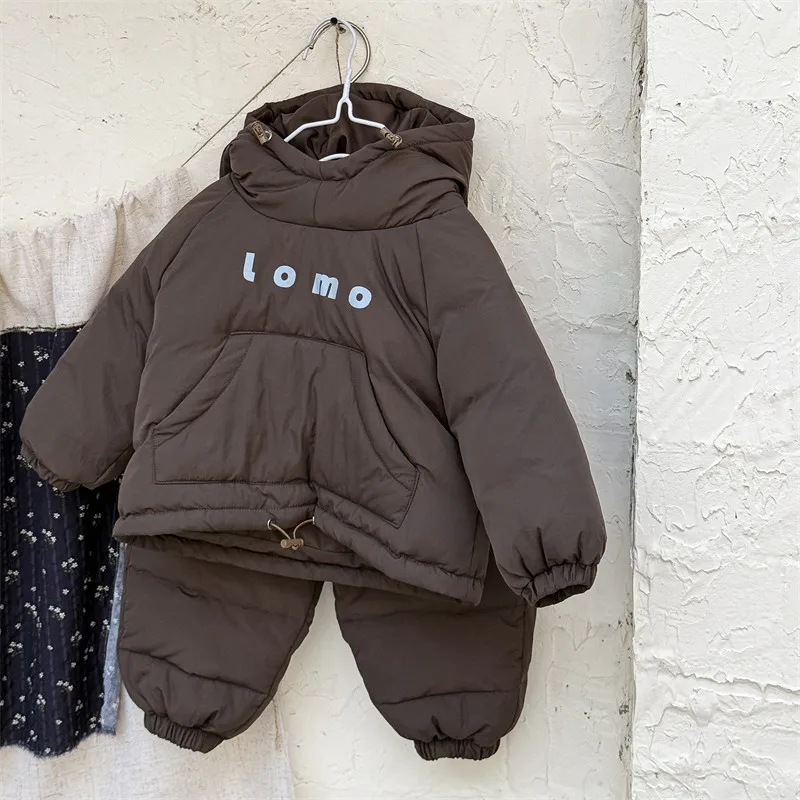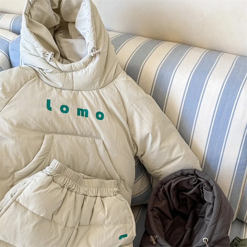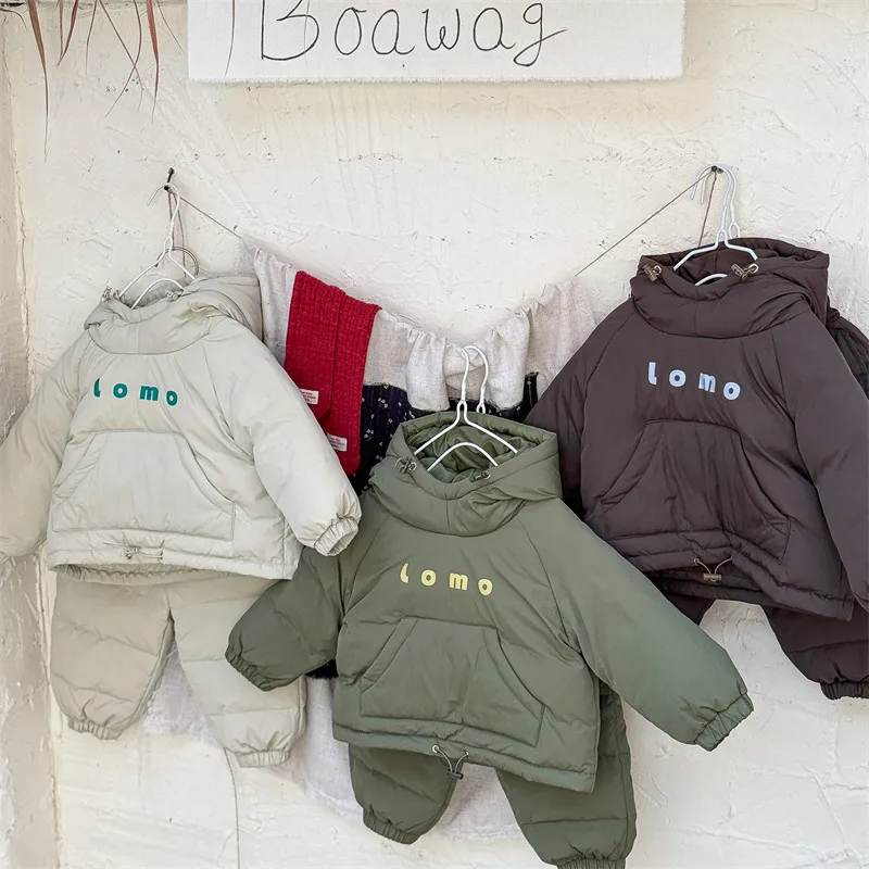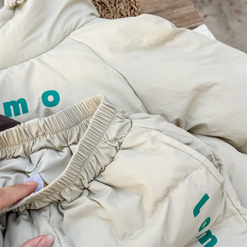#キッズセットアップ #ダウンフーディ #防寒パンツ #レタープリント #赤ちゃん服 #カジュアルコーデ #暖かいアウトフィット