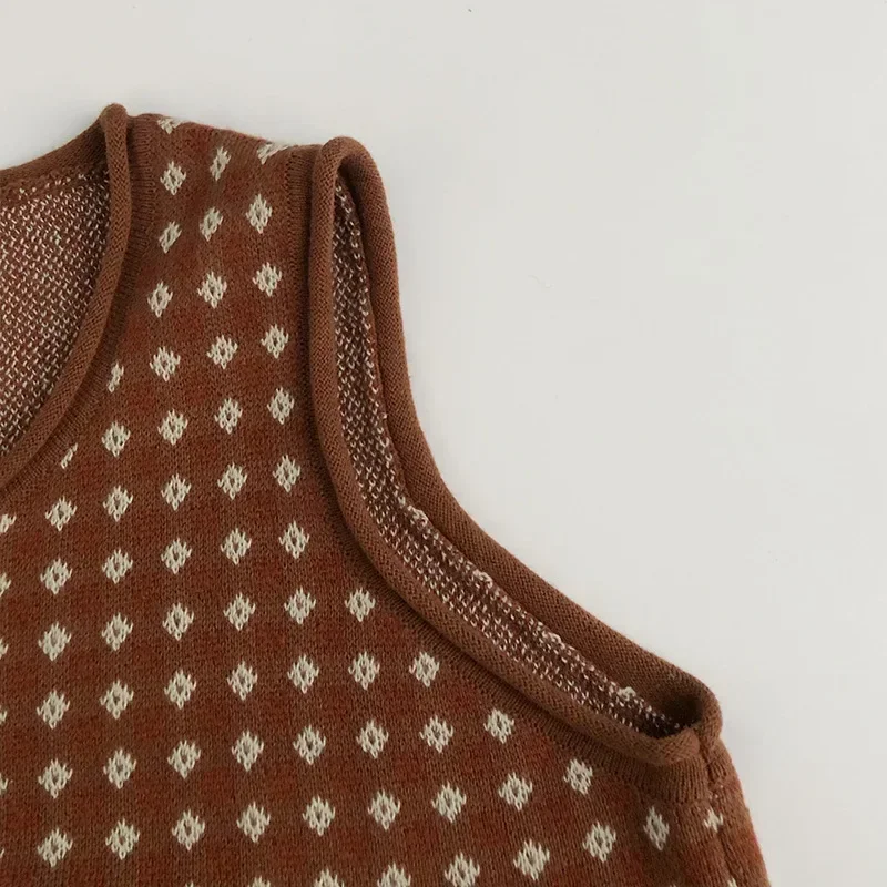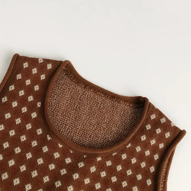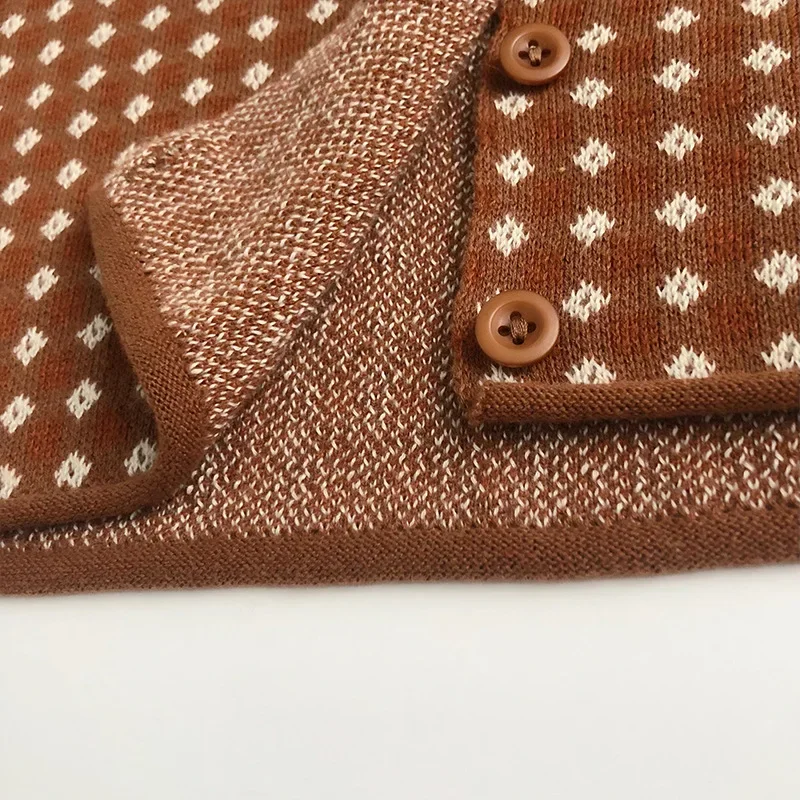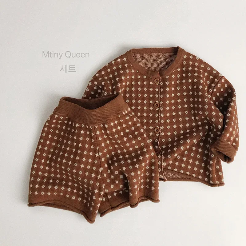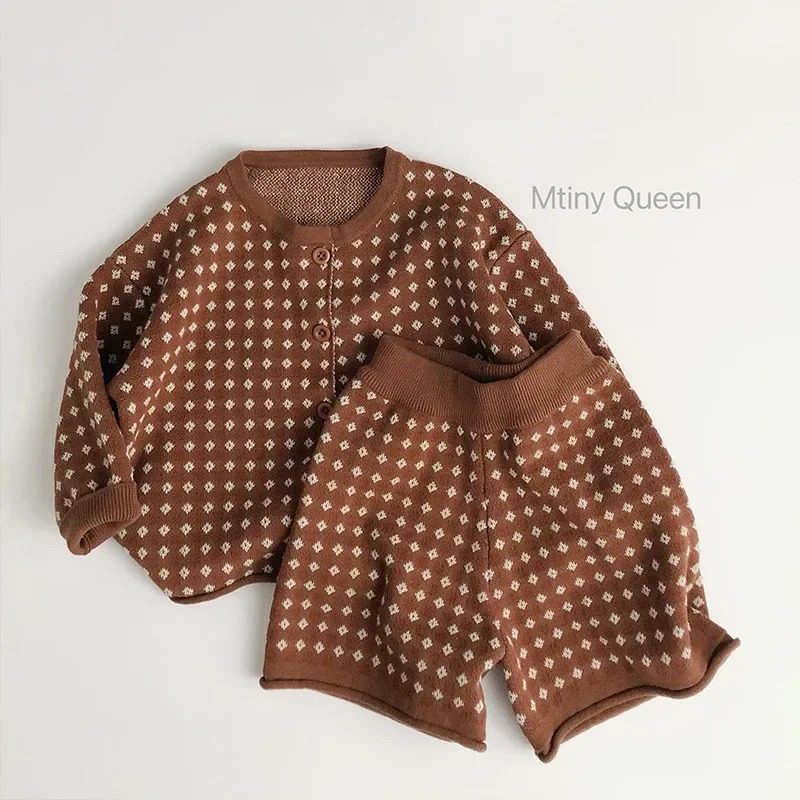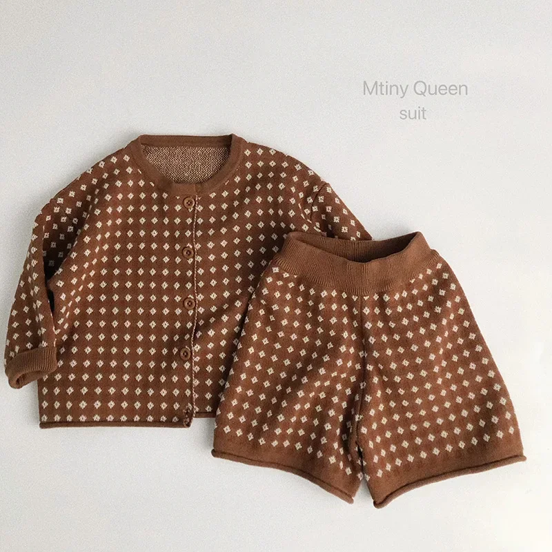 チェック柄のニットセットアップです。レトロデザインのベストに、柔らかなニットジャケット、そしてニットショーツの3点セットのコーディネートで、おしゃれで快適なスタイルを演出します。特に、個性的なチェック柄が目を引き、シーズンを問わず活躍できるアイテムです。コーディネートに迷うことなく、簡単におしゃれを楽しむことができます。柔らかな素材を使用しているため、お子様の肌にも優しく、リラックスした着心地が魅力。普段使いや特別なお出かけにぴったりの一着です。