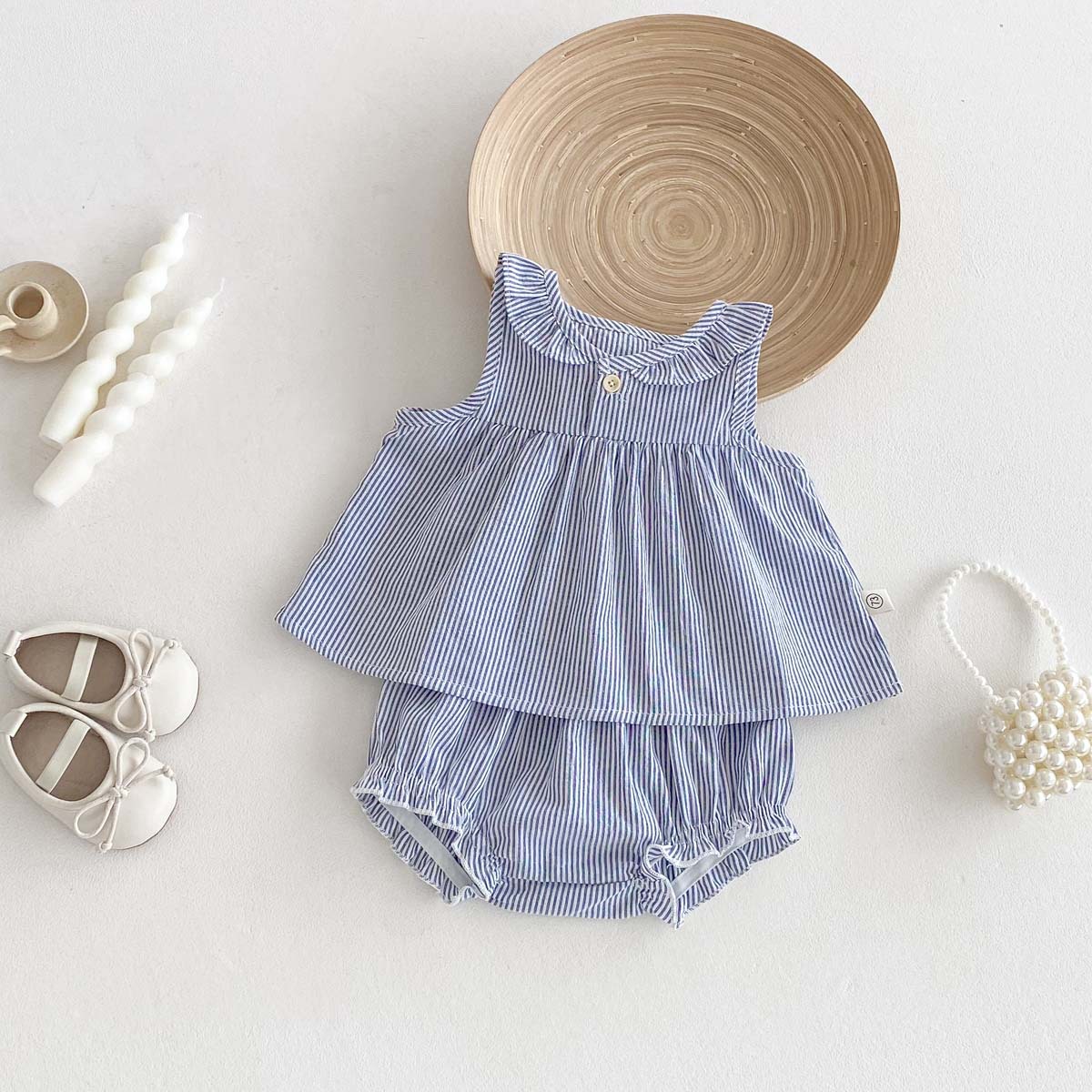 爽やかなストライプ柄の丸襟ノースリーブブラウスと、ふんわりとしたフリルブルマパンツのベビーガール用2点セットです。夏のベビーにぴったりの、涼しげな素材を使用。ブラウスは可愛らしい丸襟で、ブルマパンツのフリルがガーリーな印象をプラスします。上下別々にも着こなせるので、コーディネートの幅が広がります。普段使いにはもちろん、ちょっとしたお出かけにもおすすめです。カレッジスタイル風のおしゃれなベビーの夏スタイルを楽しめます。