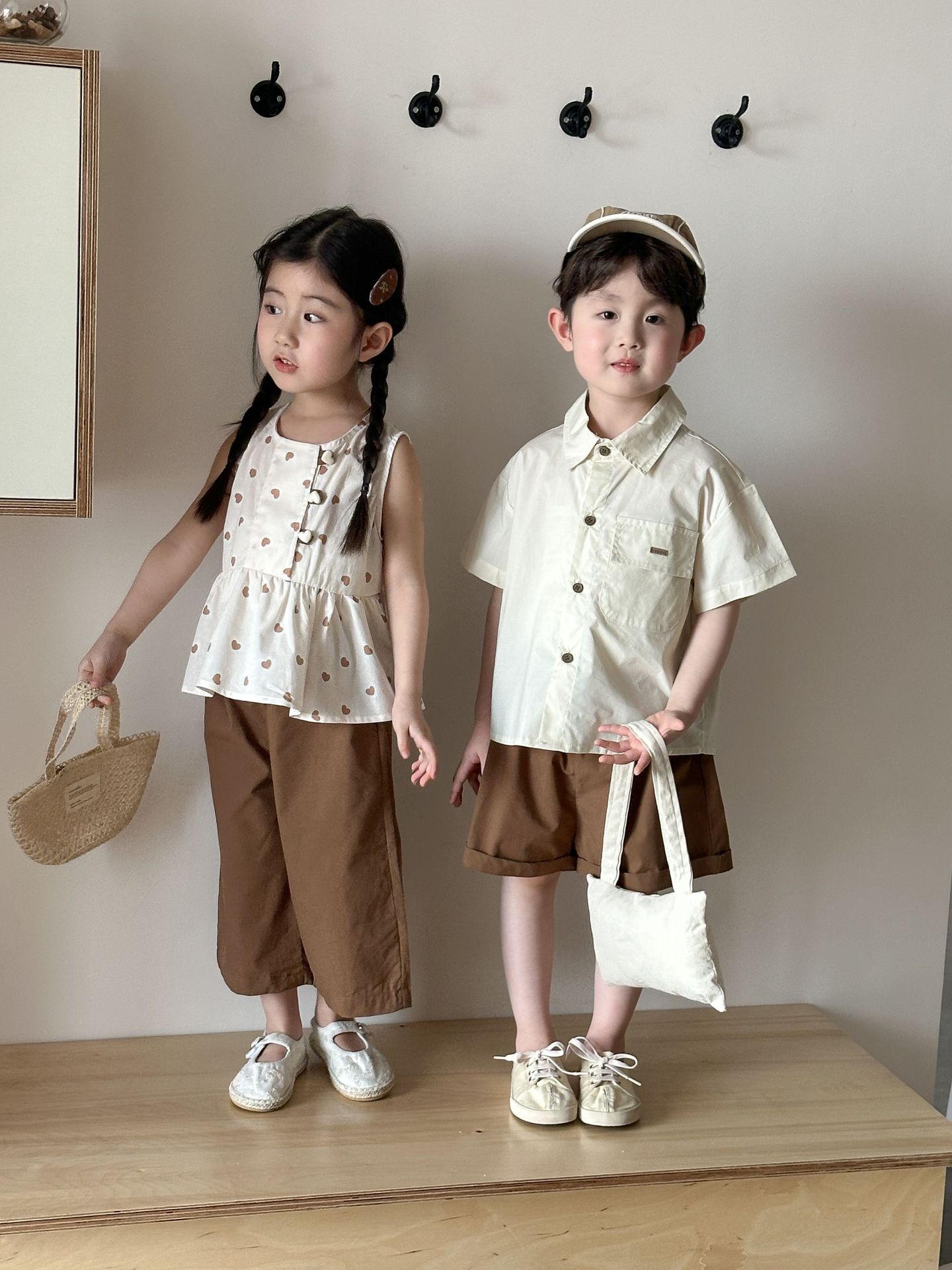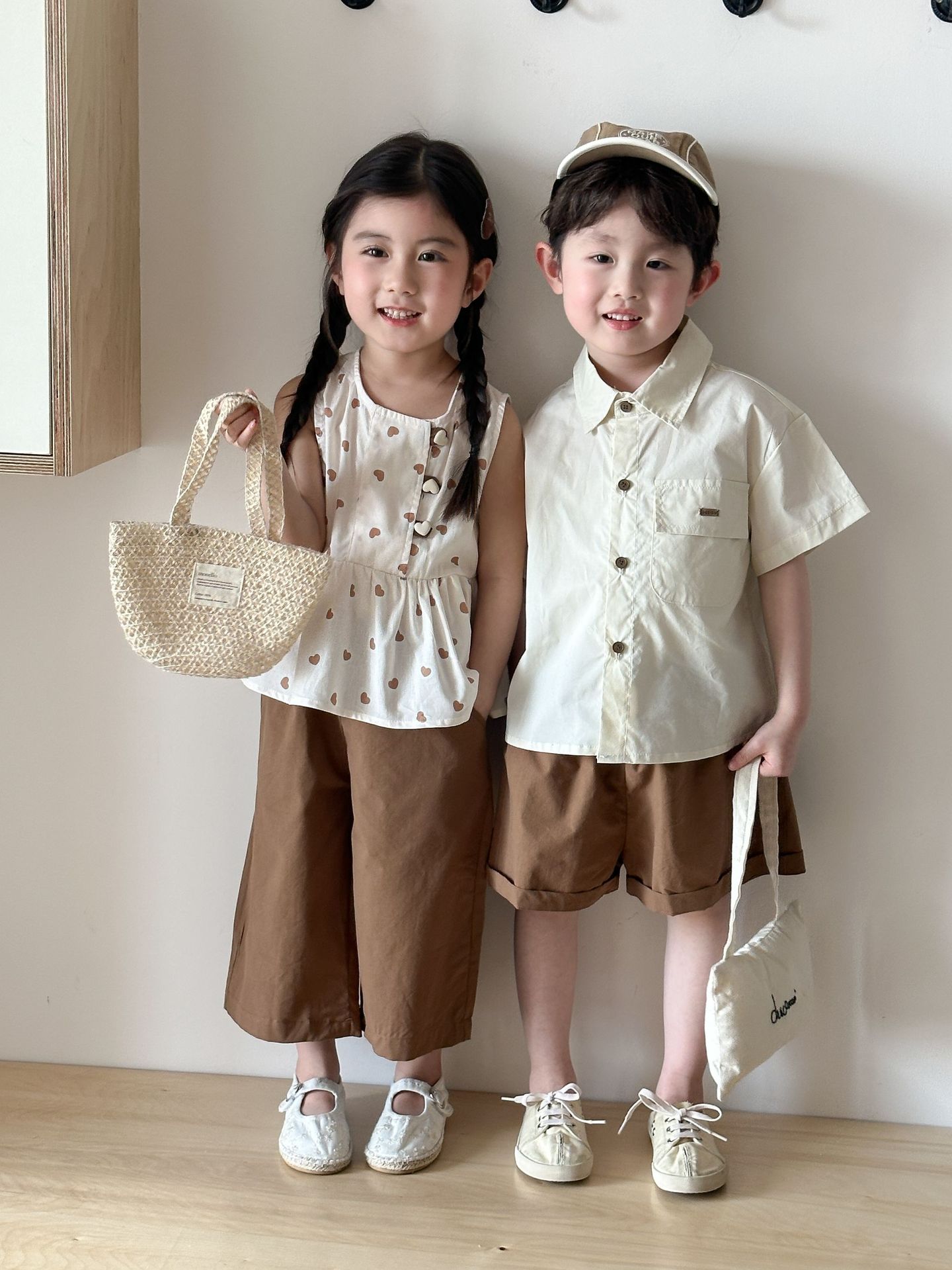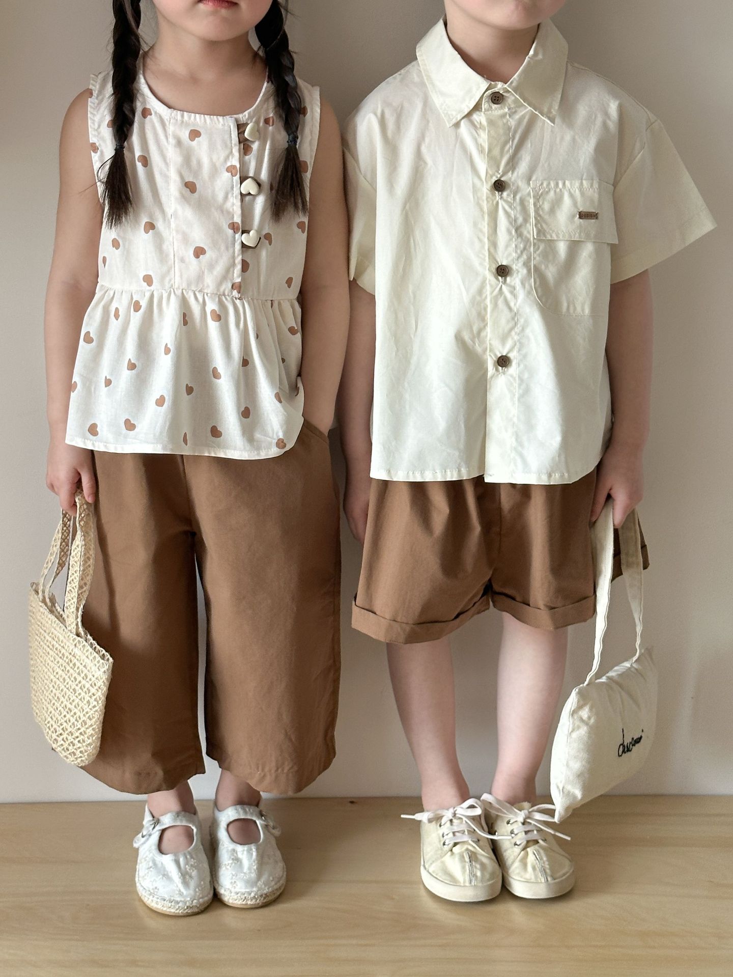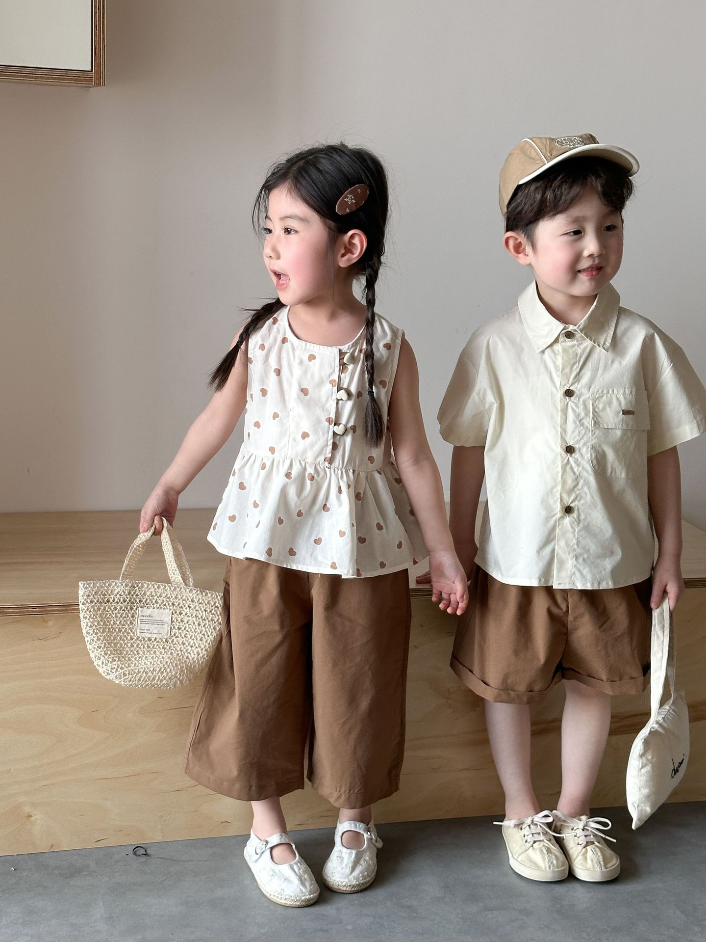 ハートプリントガールズノースリーブブラウス+ロングパンツ、もしくはボーイズ半袖シャツ+ショートパンツのセットアップ2点セットです。女の子用はハートプリントが施されたノースリーブブラウスとロングパンツの組み合わせで、優しい印象を与えます。男の子用はシンプルな半袖シャツとショートパンツの組み合わせで、カジュアルなスタイルに適しています。