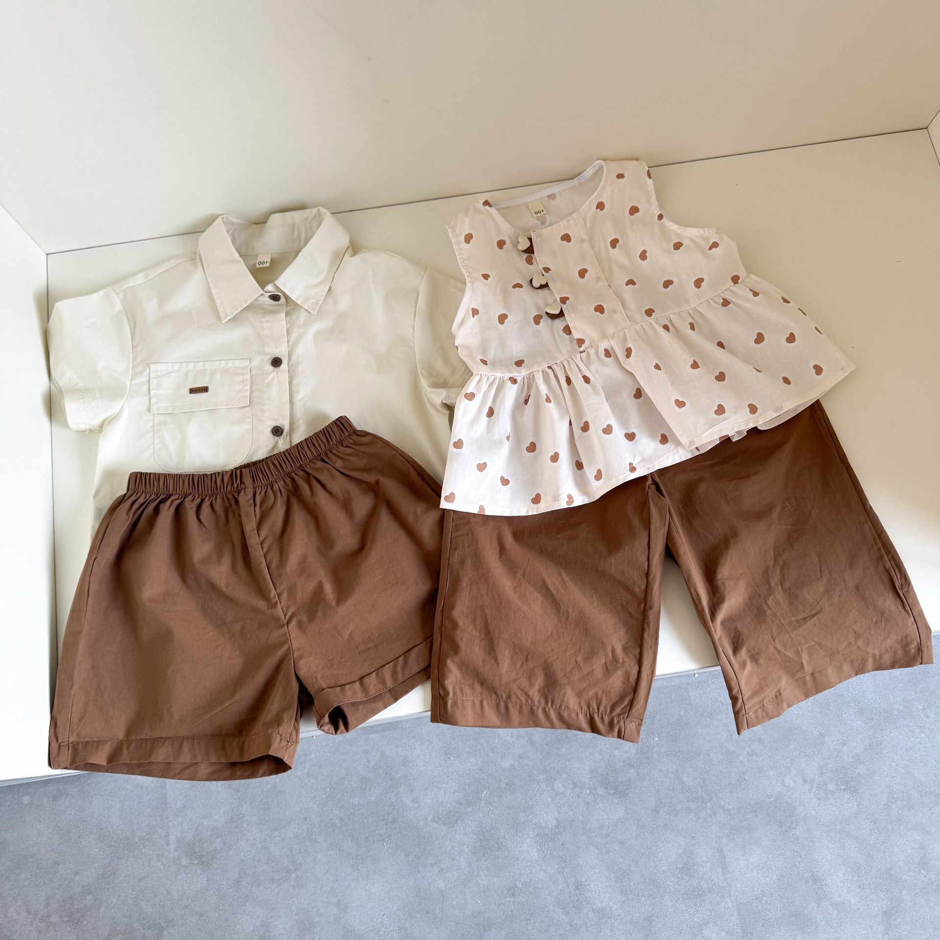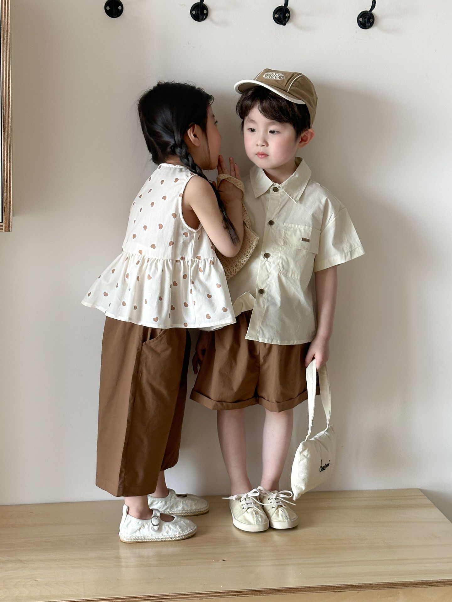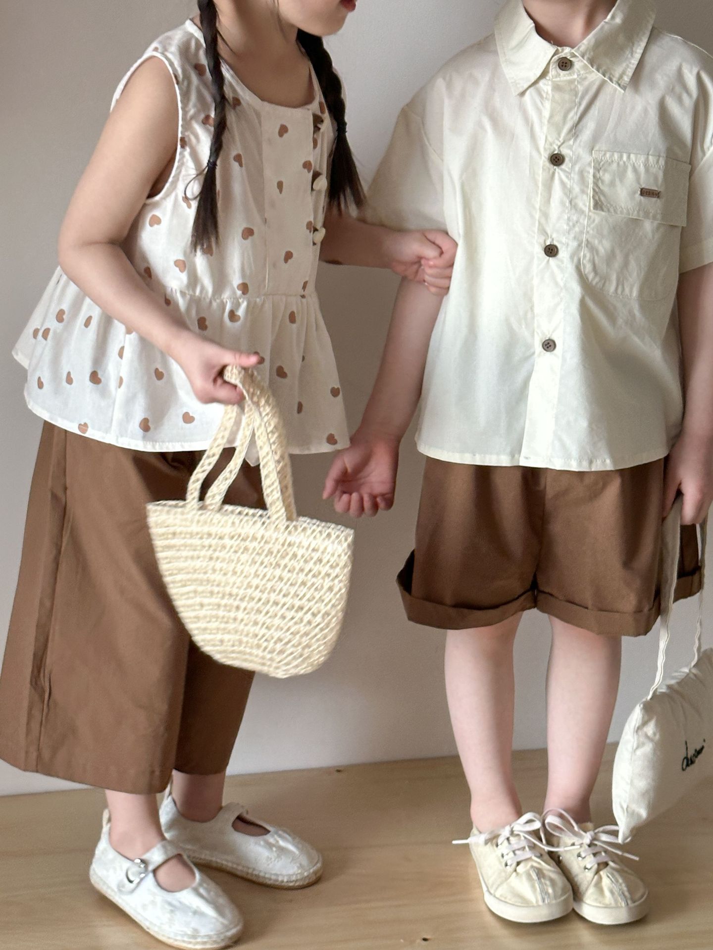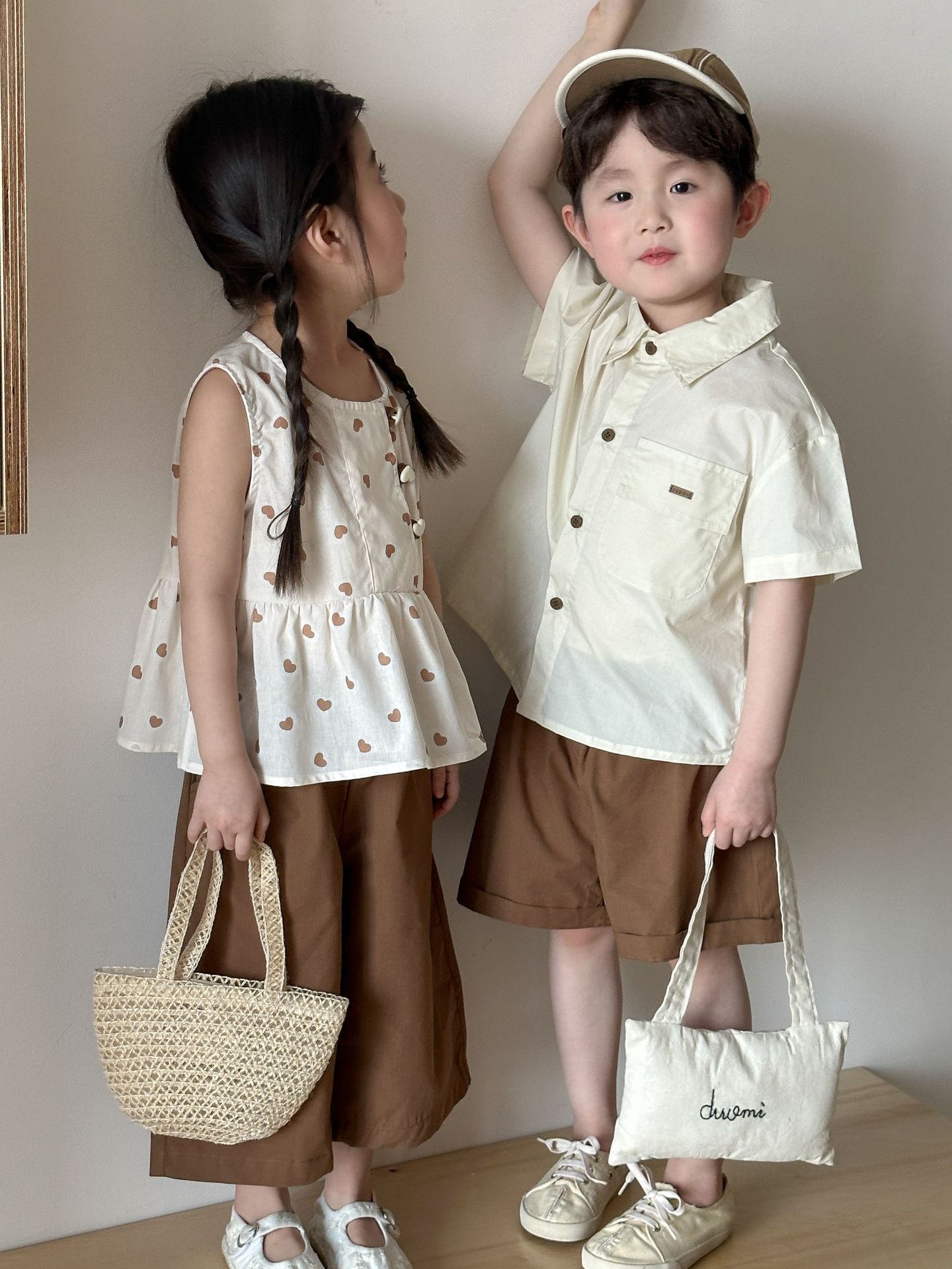 ハートプリントガールズノースリーブブラウス+ロングパンツ、もしくはボーイズ半袖シャツ+ショートパンツのセットアップ2点セットです。女の子用はハートプリントが施されたノースリーブブラウスとロングパンツの組み合わせで、優しい印象を与えます。男の子用はシンプルな半袖シャツとショートパンツの組み合わせで、カジュアルなスタイルに適しています。