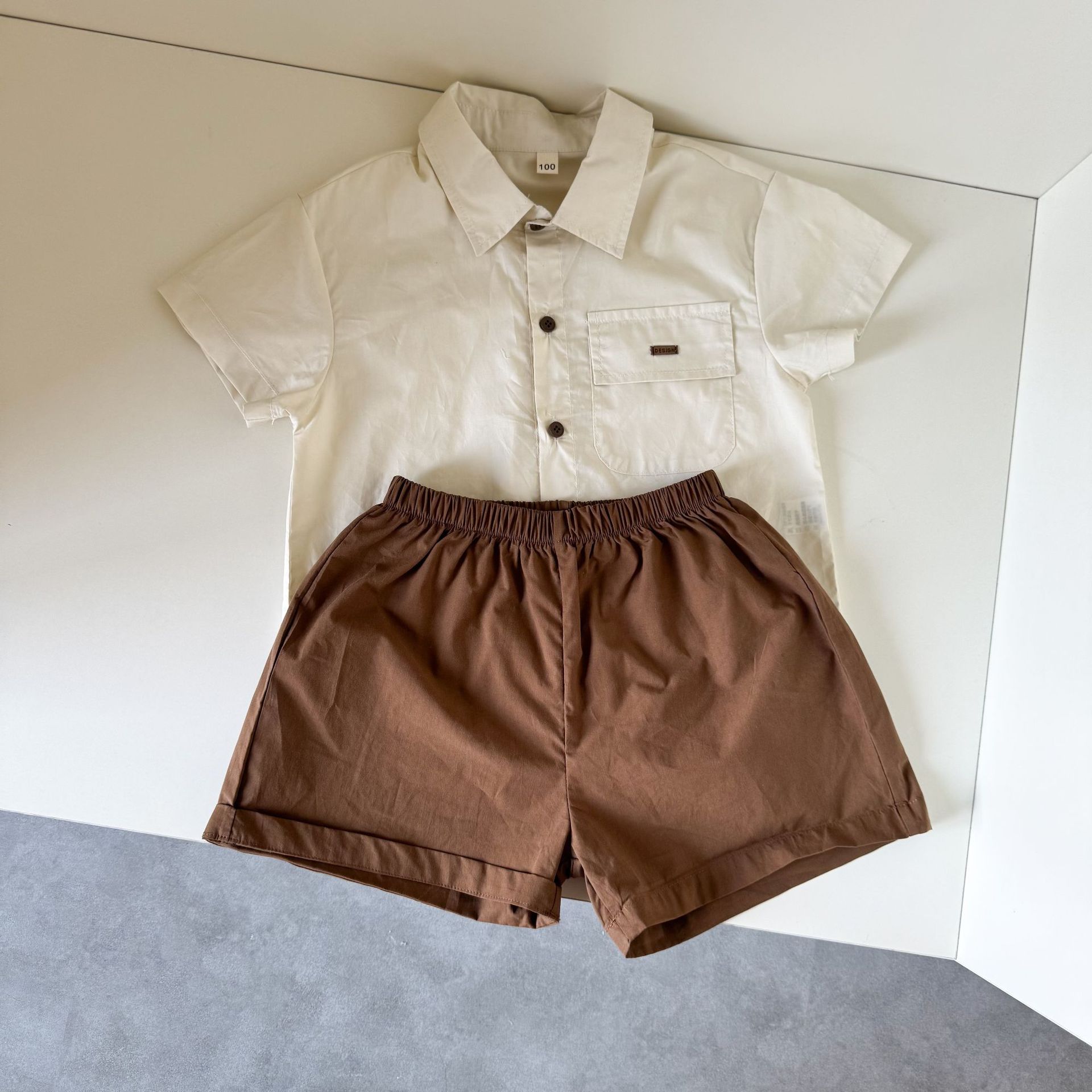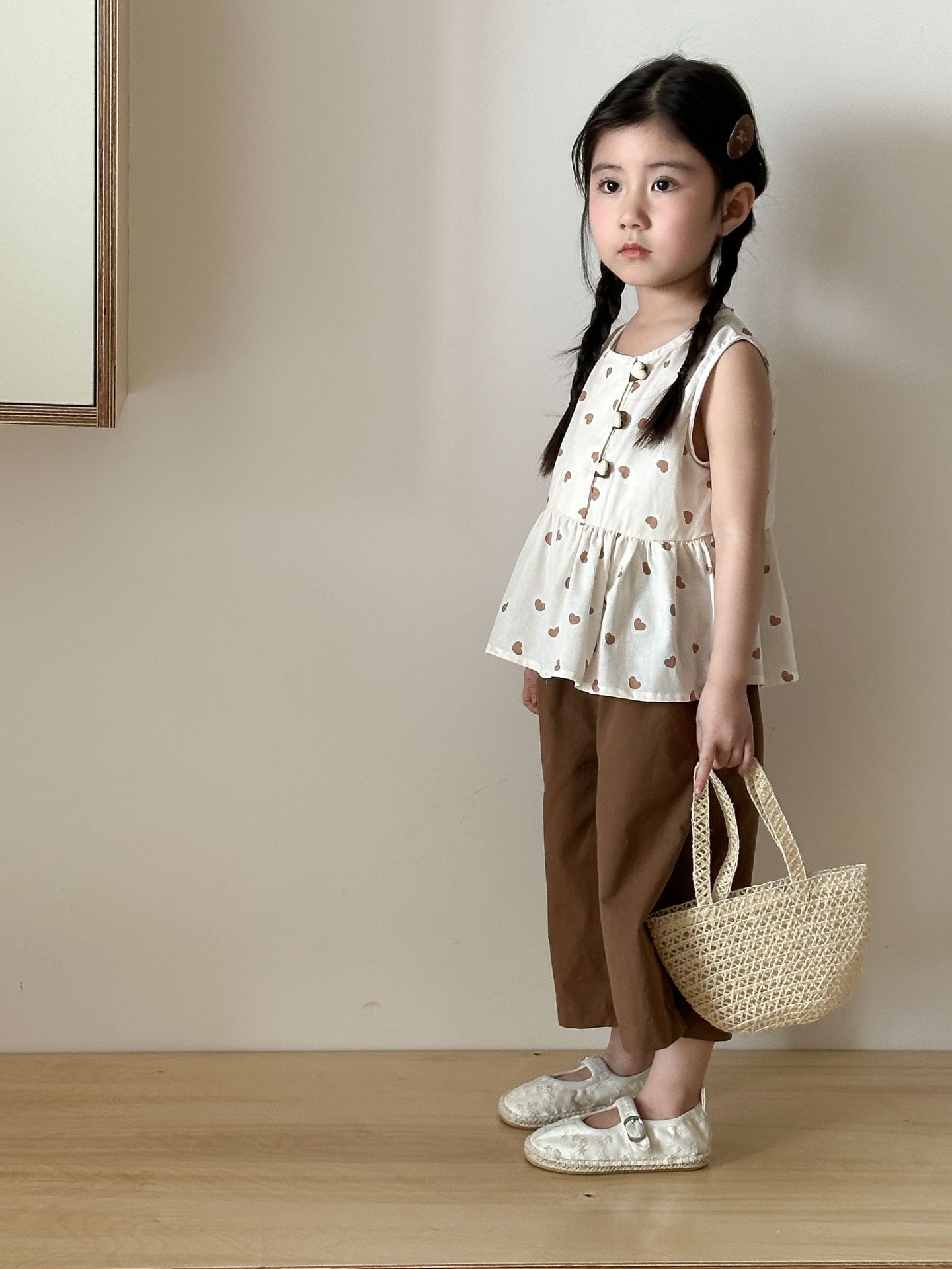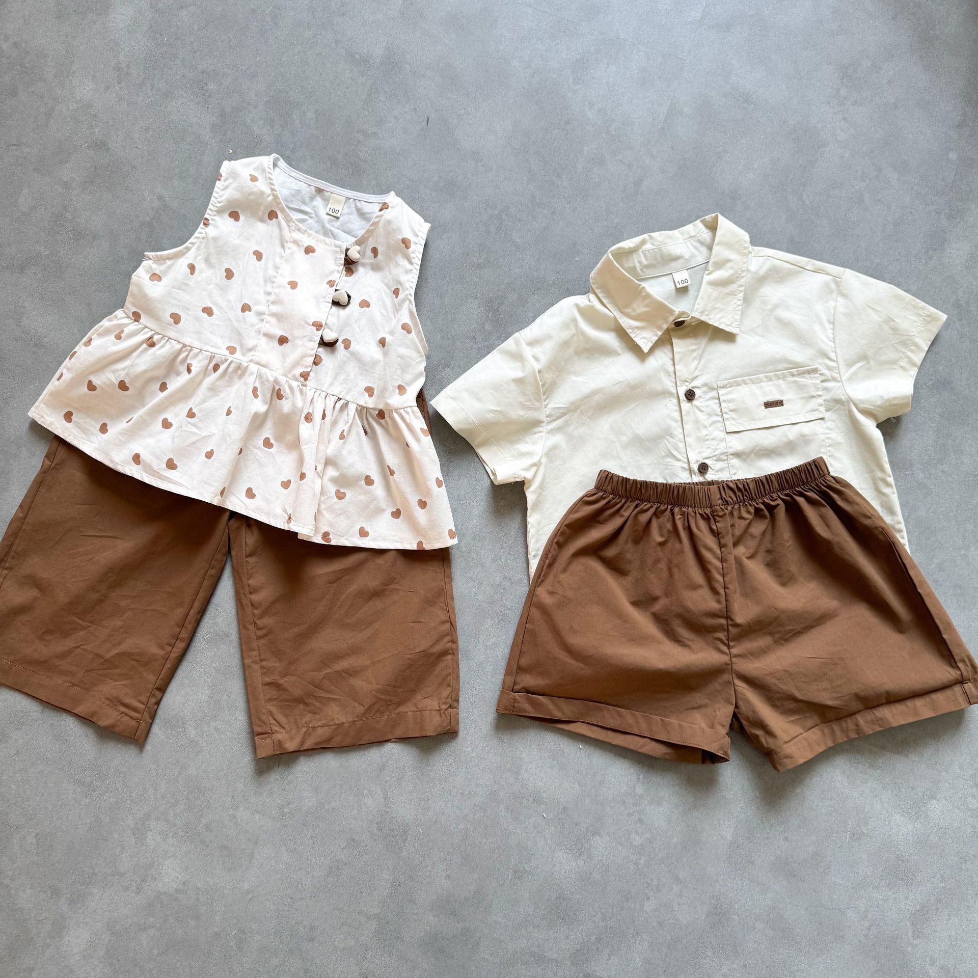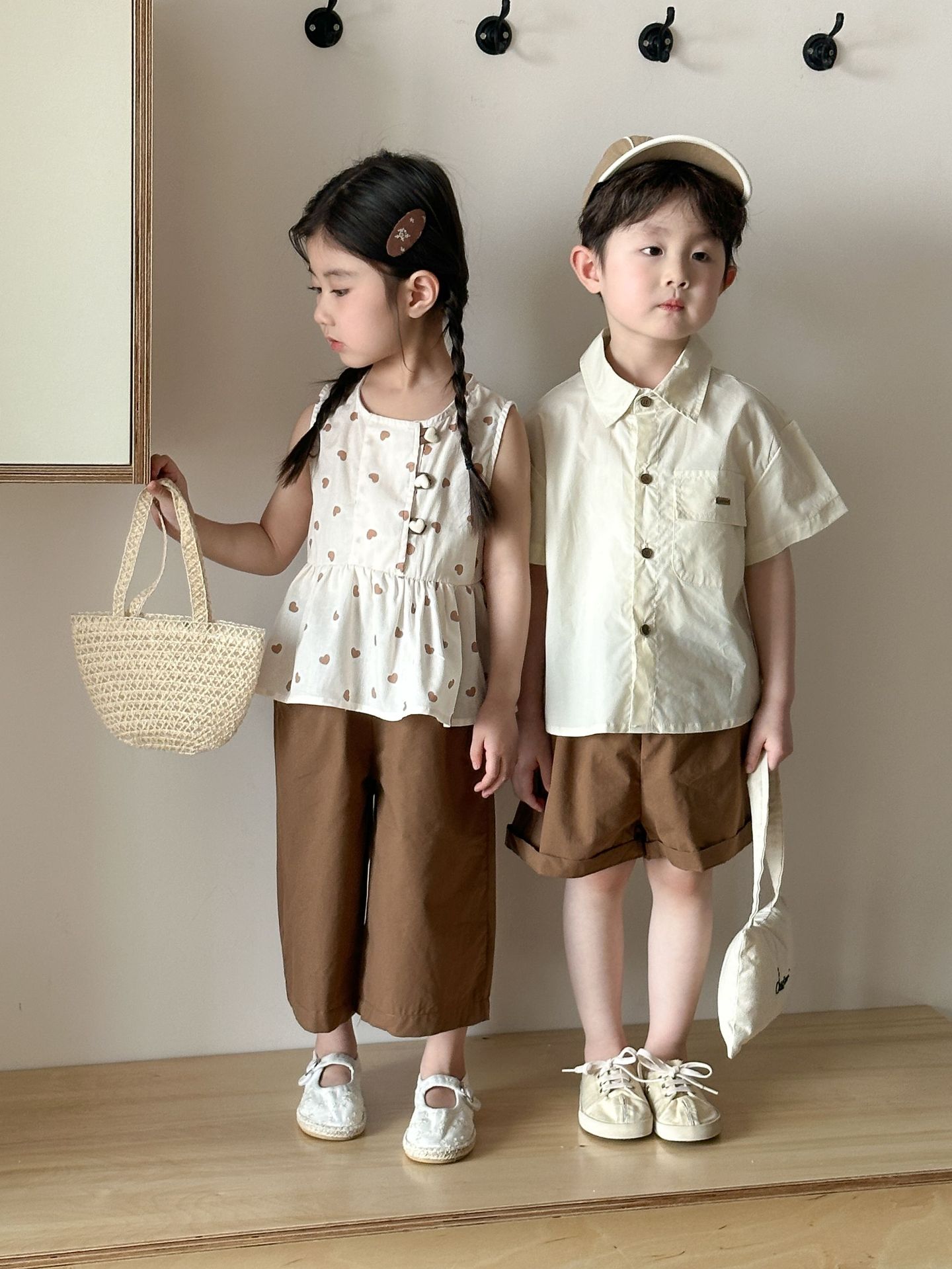 ハートプリントガールズノースリーブブラウス+ロングパンツ、もしくはボーイズ半袖シャツ+ショートパンツのセットアップ2点セットです。女の子用はハートプリントが施されたノースリーブブラウスとロングパンツの組み合わせで、優しい印象を与えます。男の子用はシンプルな半袖シャツとショートパンツの組み合わせで、カジュアルなスタイルに適しています。