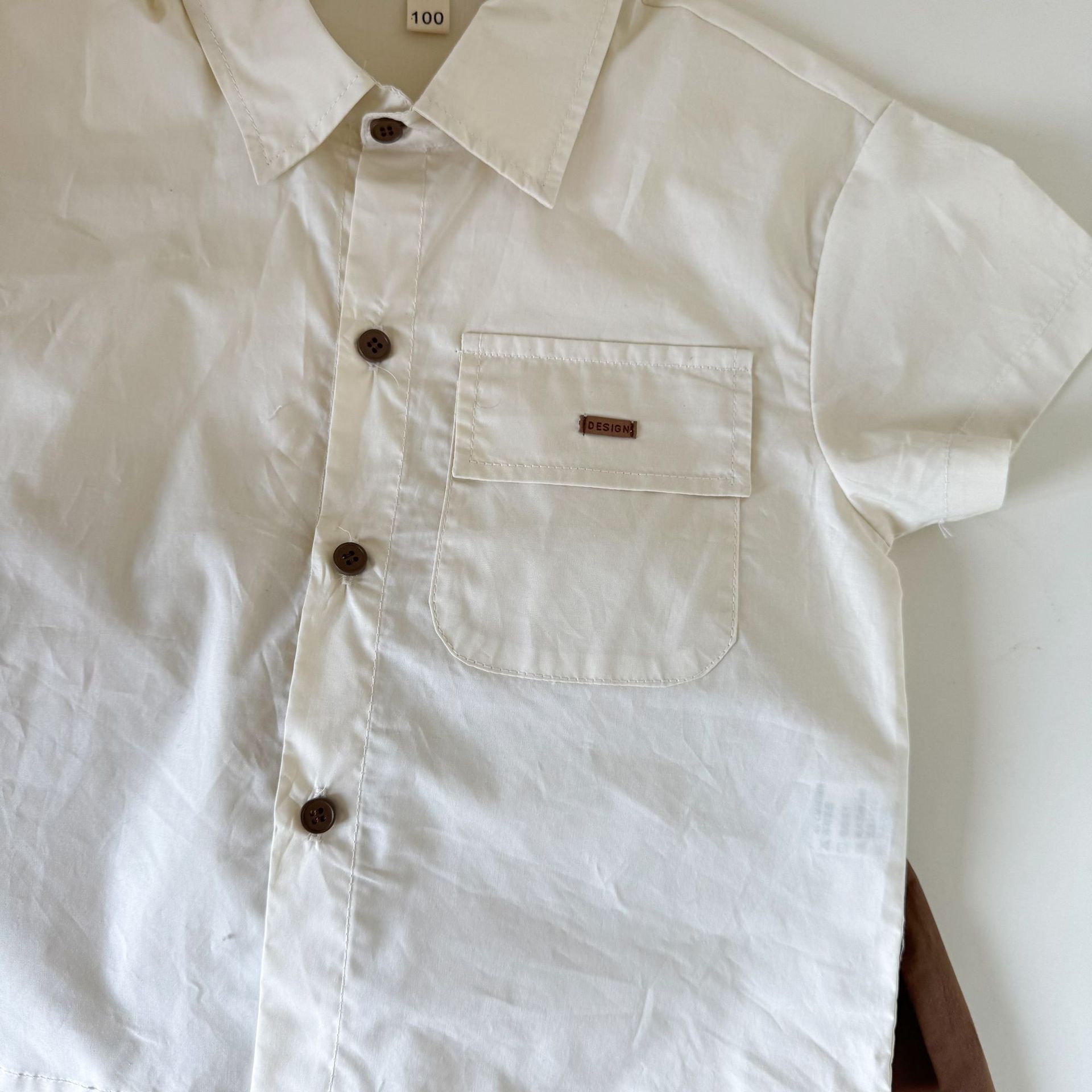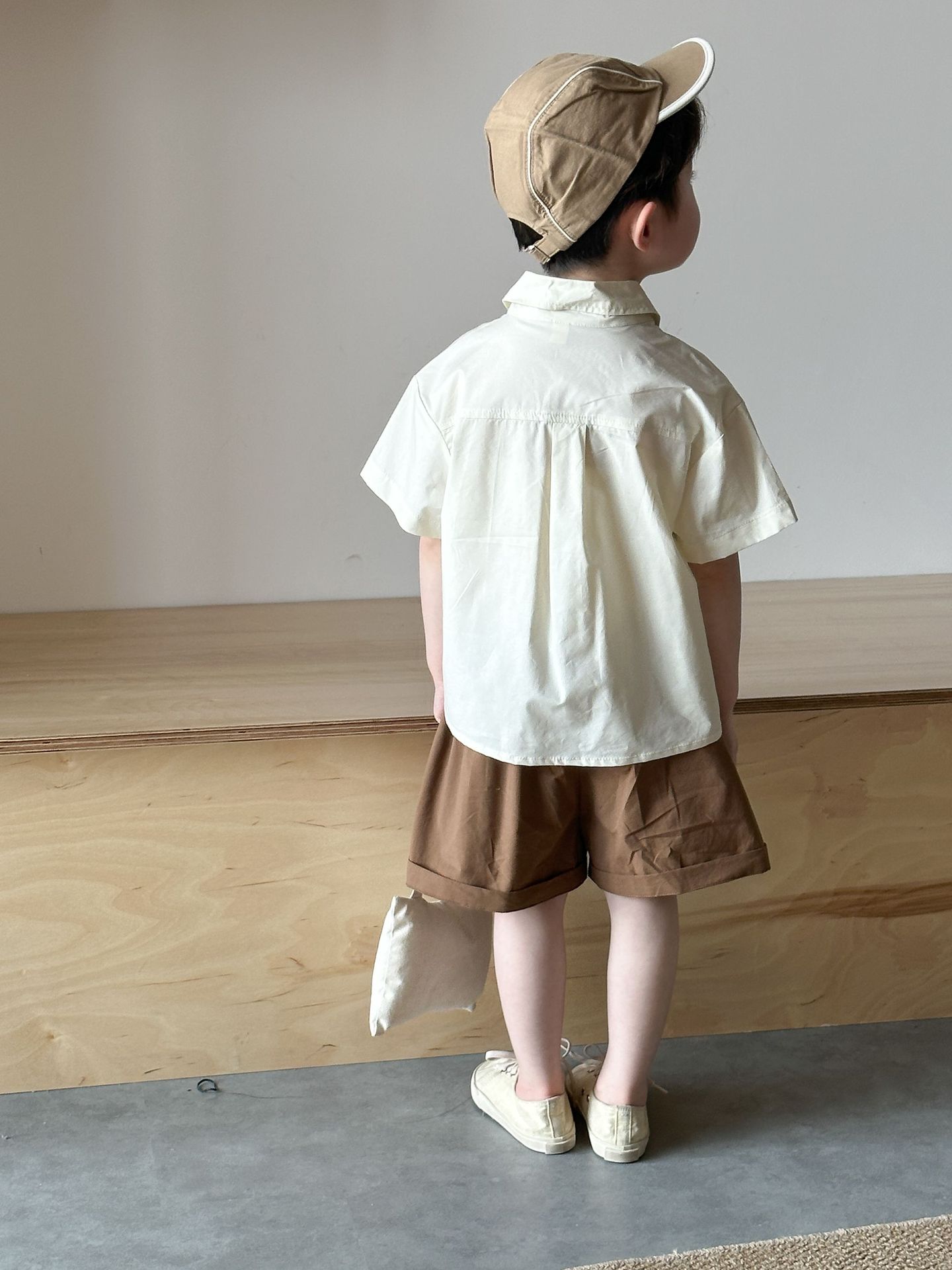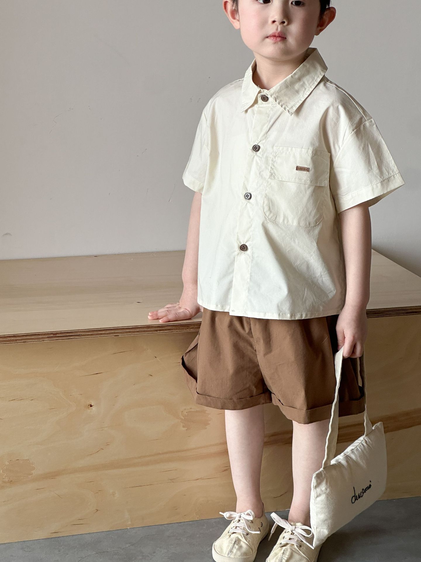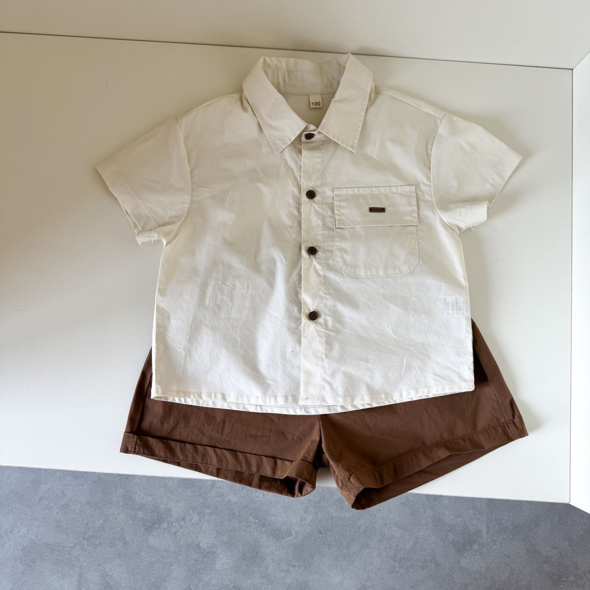 ハートプリントガールズノースリーブブラウス+ロングパンツ、もしくはボーイズ半袖シャツ+ショートパンツのセットアップ2点セットです。女の子用はハートプリントが施されたノースリーブブラウスとロングパンツの組み合わせで、優しい印象を与えます。男の子用はシンプルな半袖シャツとショートパンツの組み合わせで、カジュアルなスタイルに適しています。
