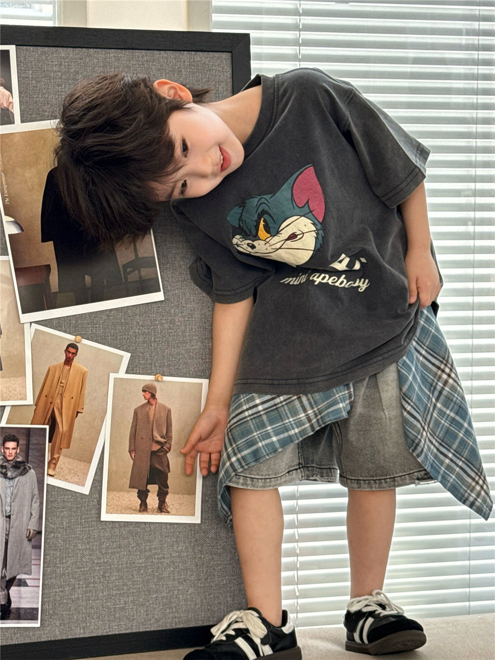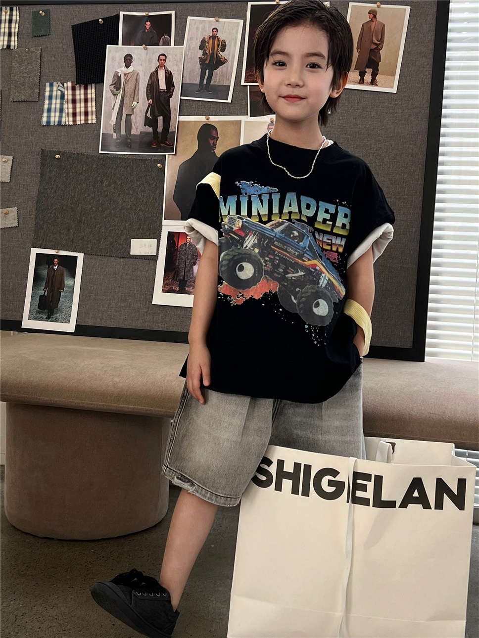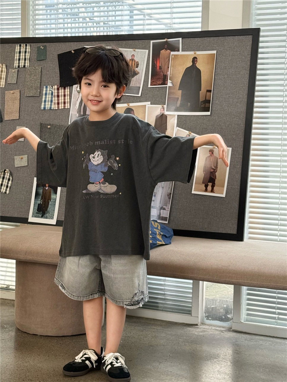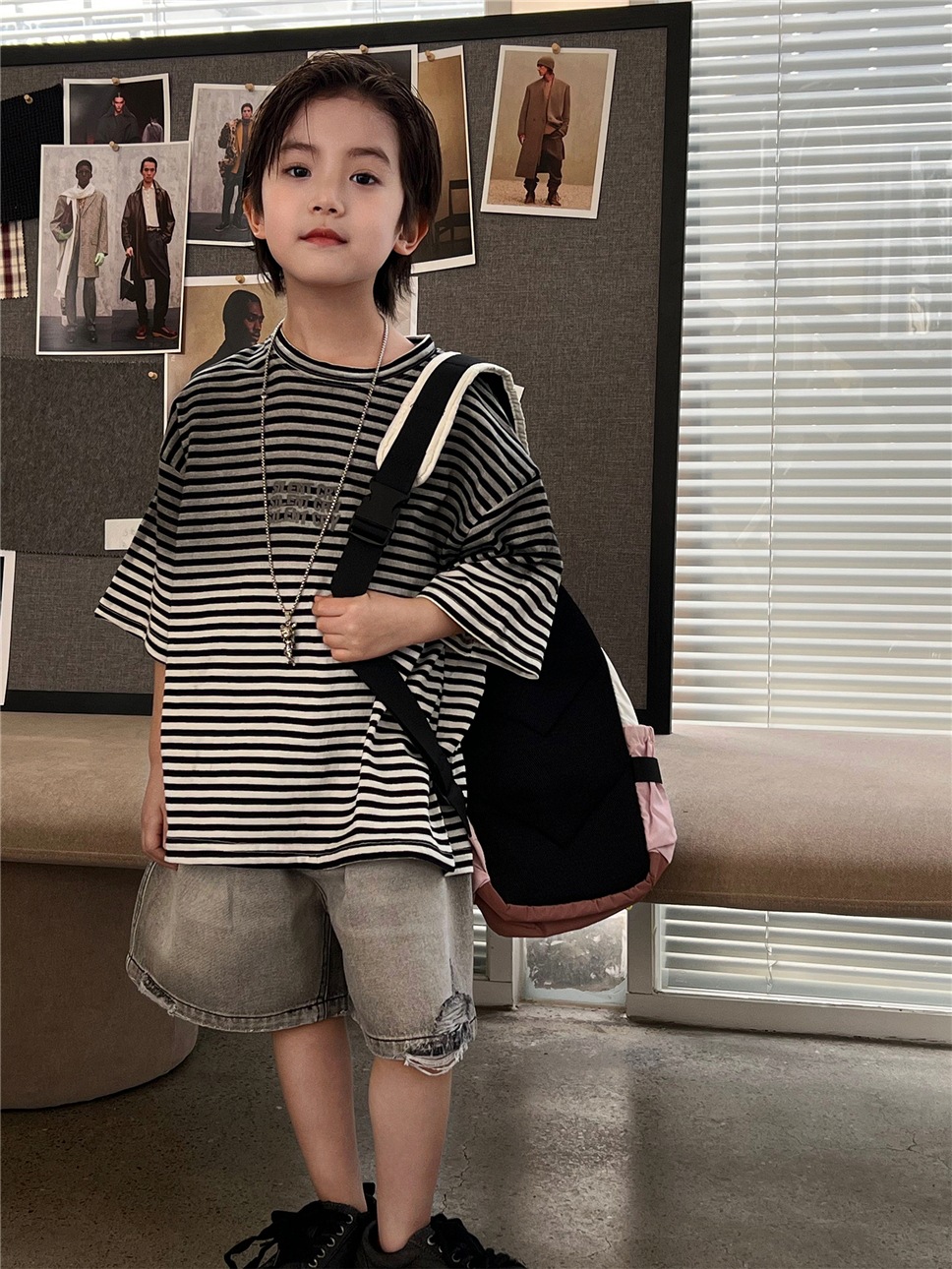 通気性の良い薄手のデニム素材で仕立てられているため、暑い日でもお子様が快適に過ごせるように配慮しました。元気いっぱいに動き回るお子様にも安心の、動きやすさを追求したデザインです。普段使いはもちろん、ストリート感のあるおしゃれを楽しみたい時にもおすすめです。このダメージブラックデニムハーフパンツは、お子様の日常の装いに快適さとトレンド感を添える一着です。