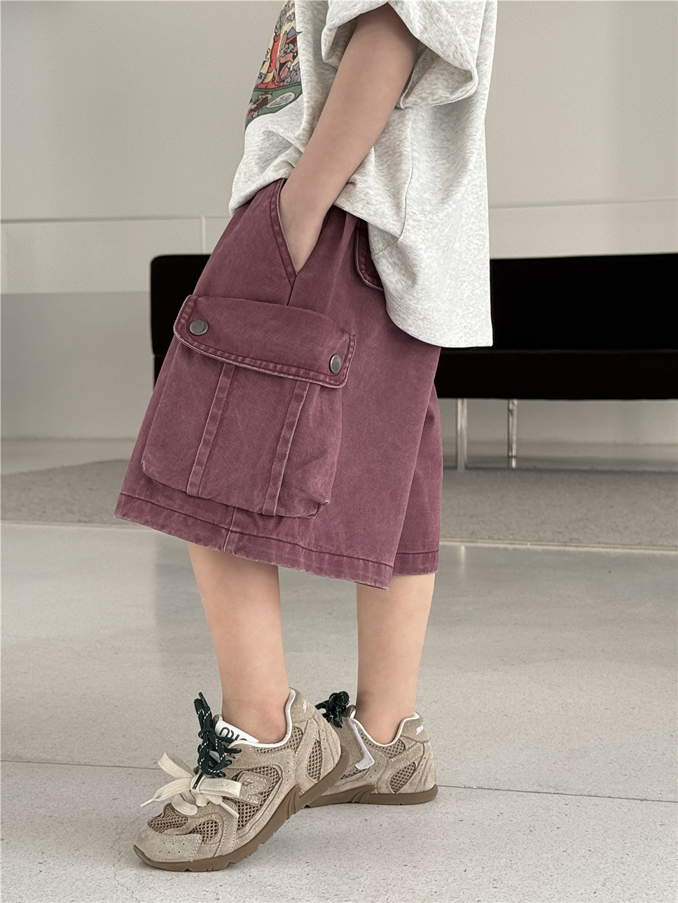 レトロな雰囲気のルーズハーフカーゴパンツです。深みのあるダークレッドの色合いと、ゆったりとしたシルエットが特徴で、トレンド感のあるカジュアルスタイルを演出します。両サイドの大きめポケットがアクセントになり、機能性とおしゃれさを兼ね備えています。