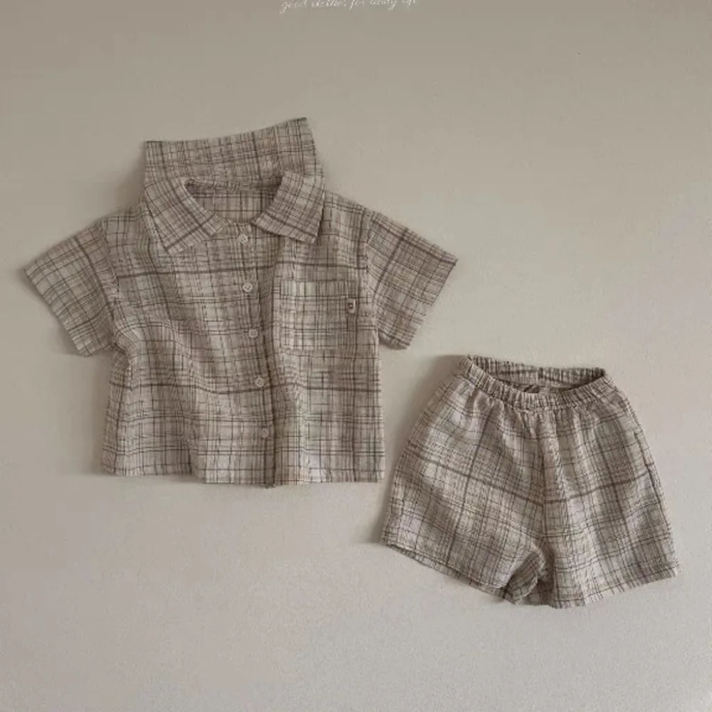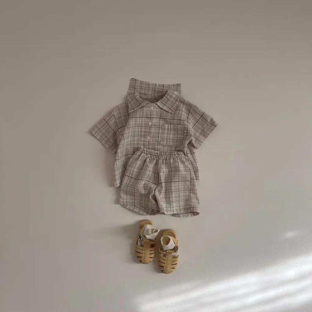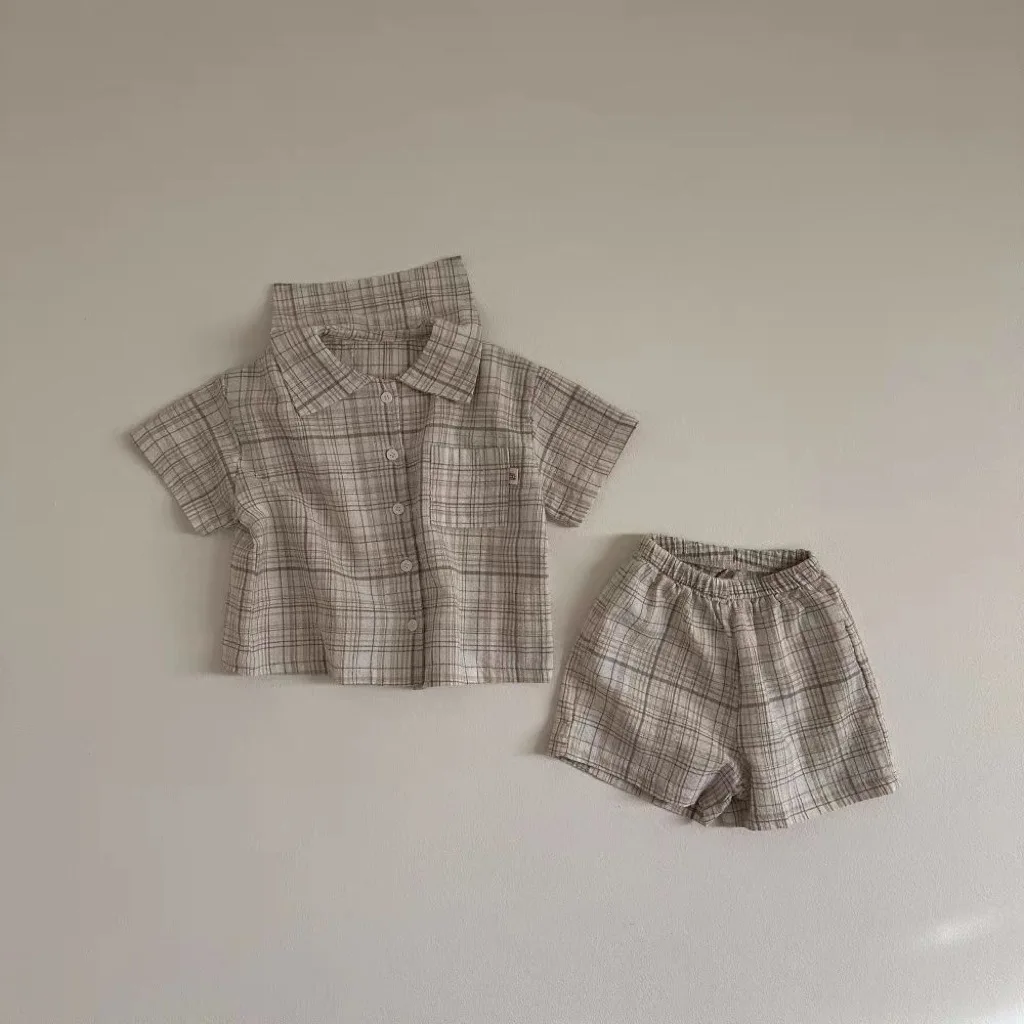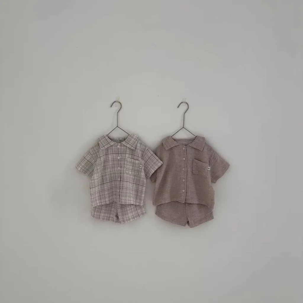 キッズセットアップ 2点セット 半袖シャツ+ショートパンツ レトロ 無地/チェック 2カラー【mh0005461】