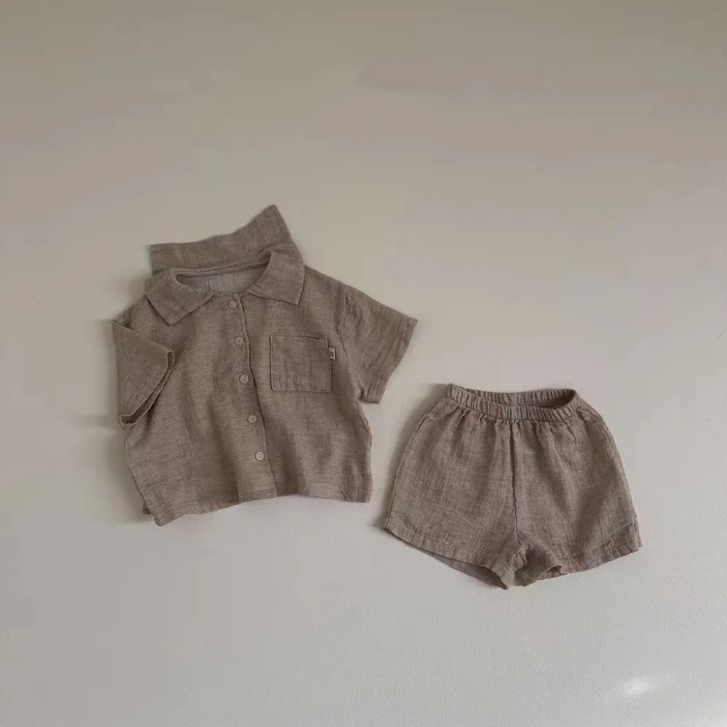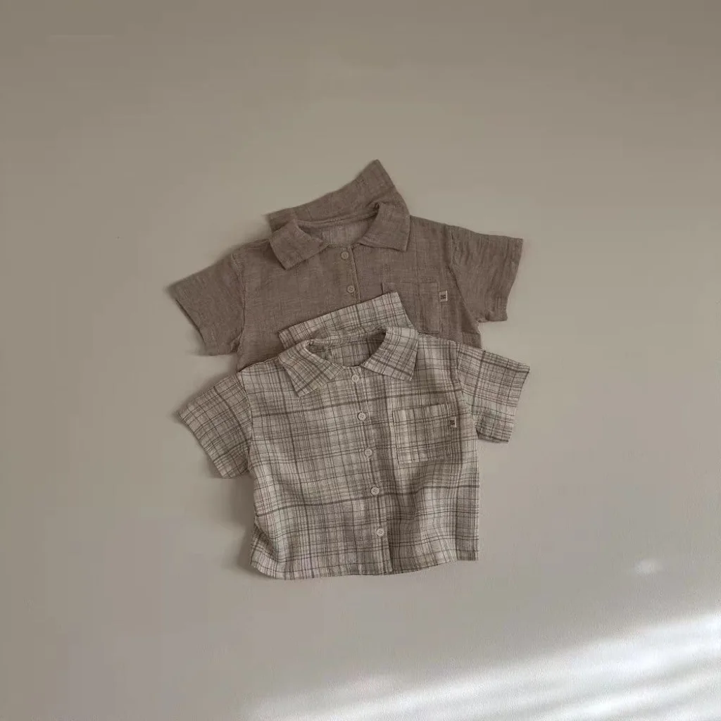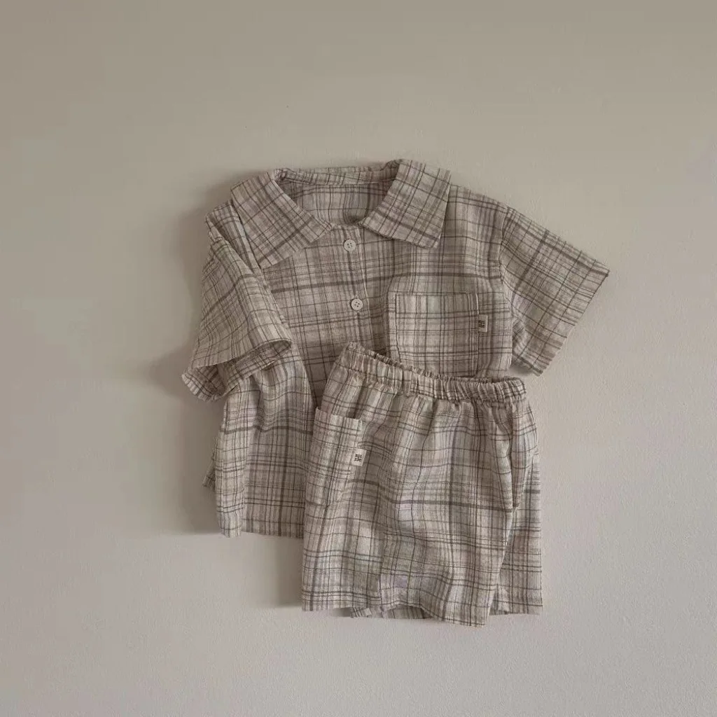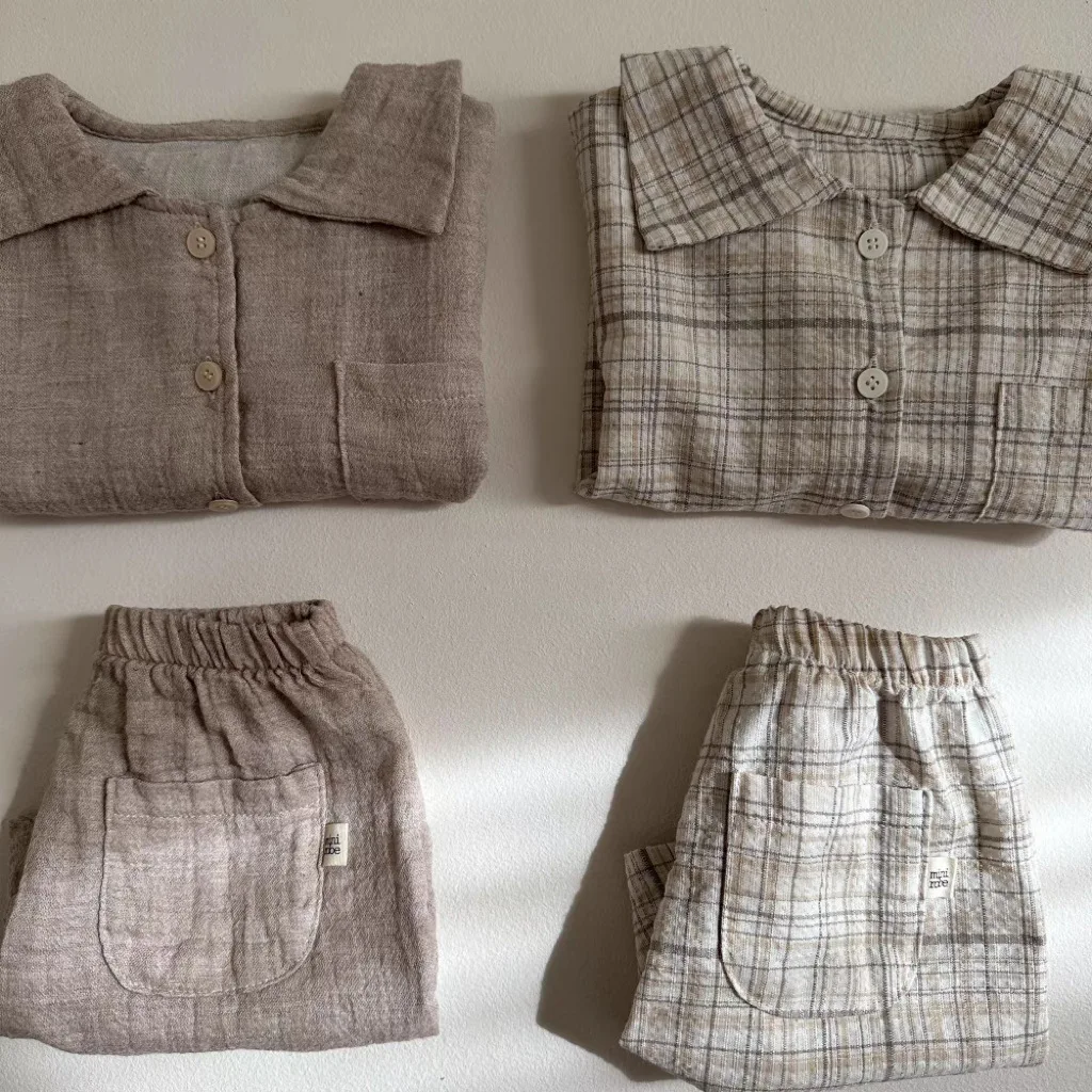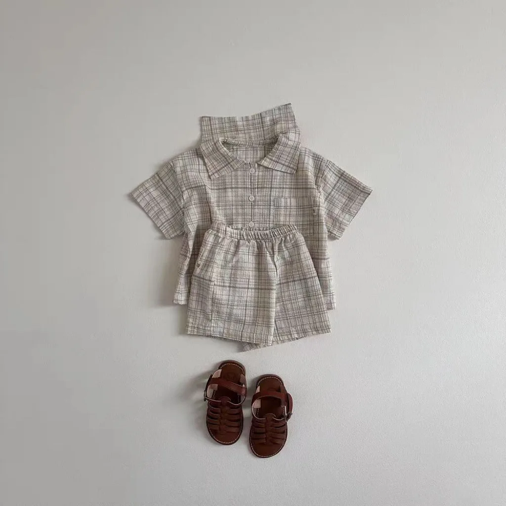 キッズセットアップ 2点セット 半袖シャツ+ショートパンツ レトロ 無地/チェック 2カラー【mh0005461】
