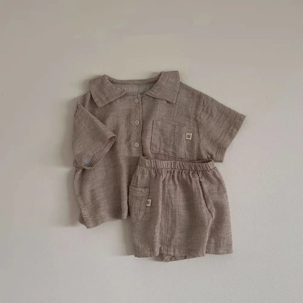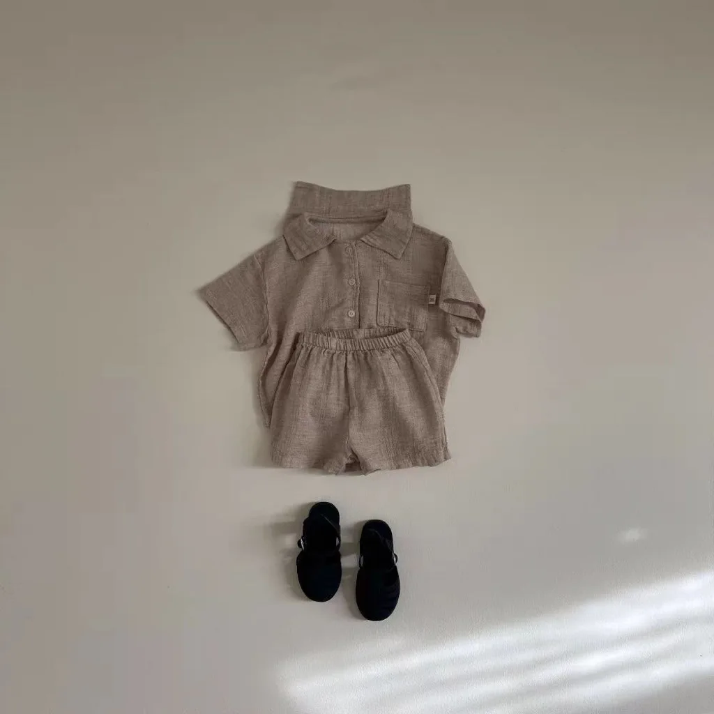夏らしいレトロな雰囲気漂うキッズセットアップ。半袖のシャツとショートパンツの2点セットで、お子様にぴったりの涼しい着こなしを提供します。無地とチェックの2カラーからお選びいただけます。子どもたちに快適さを保証する、やさしい肌触りのコットン素材を使用しています。お子様のカジュアルなブラウススタイルを演出する、ポロカラーのショートスリーブトップスとショートパンツをセットにしました。