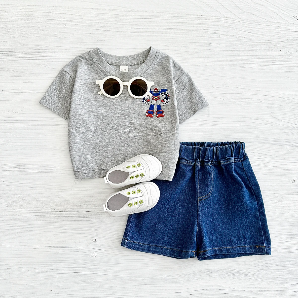 カッコいいロボットの刺繍が入った、半袖Tシャツとデニムショートパンツの2点セットです。夏にぴったりの上着とボトムスがセットになっていて、0-3歳のお子様におすすめです。お洒落なベビー服で、子育てを楽しんでください。