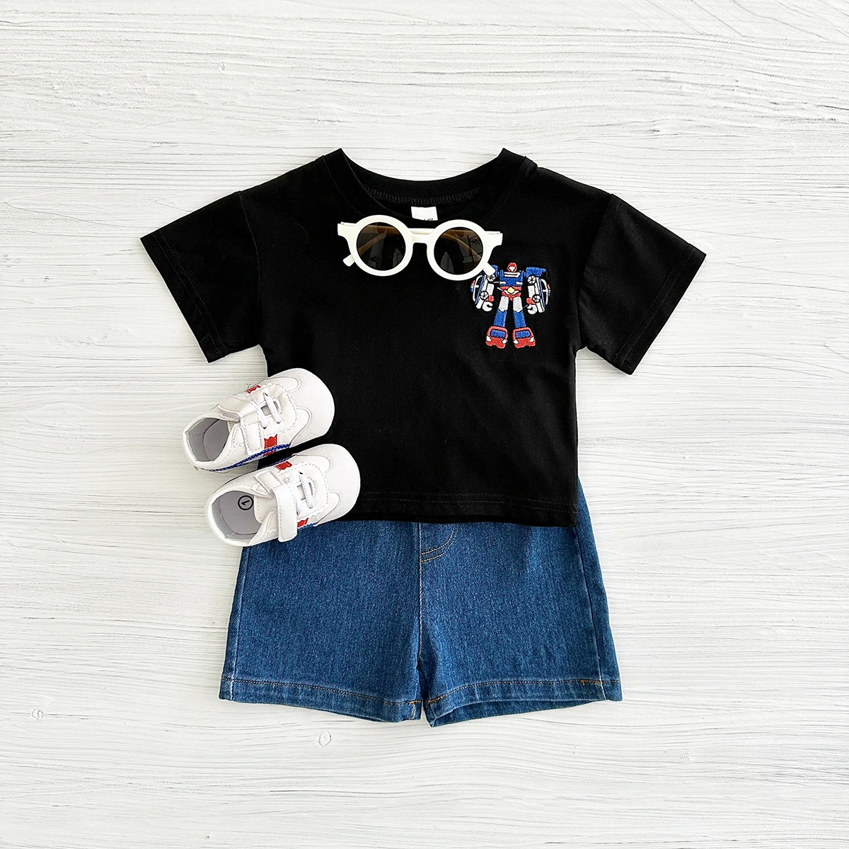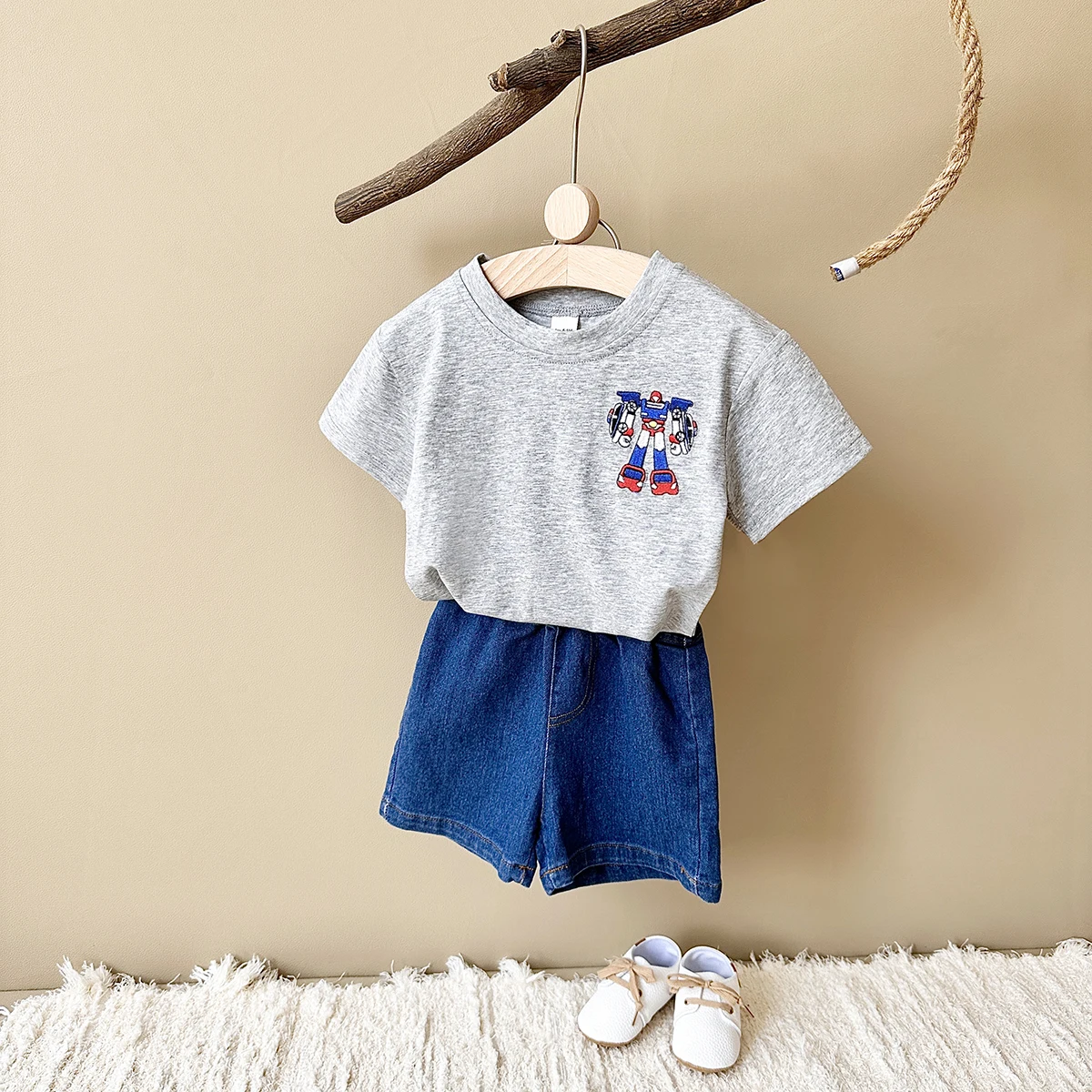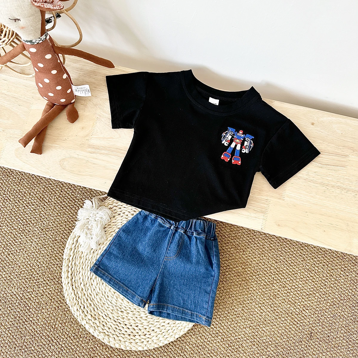 ベビーセットアップ 2点セット 半袖Tシャツ+デニムショートパンツ ロボット刺繍【mh0005632】