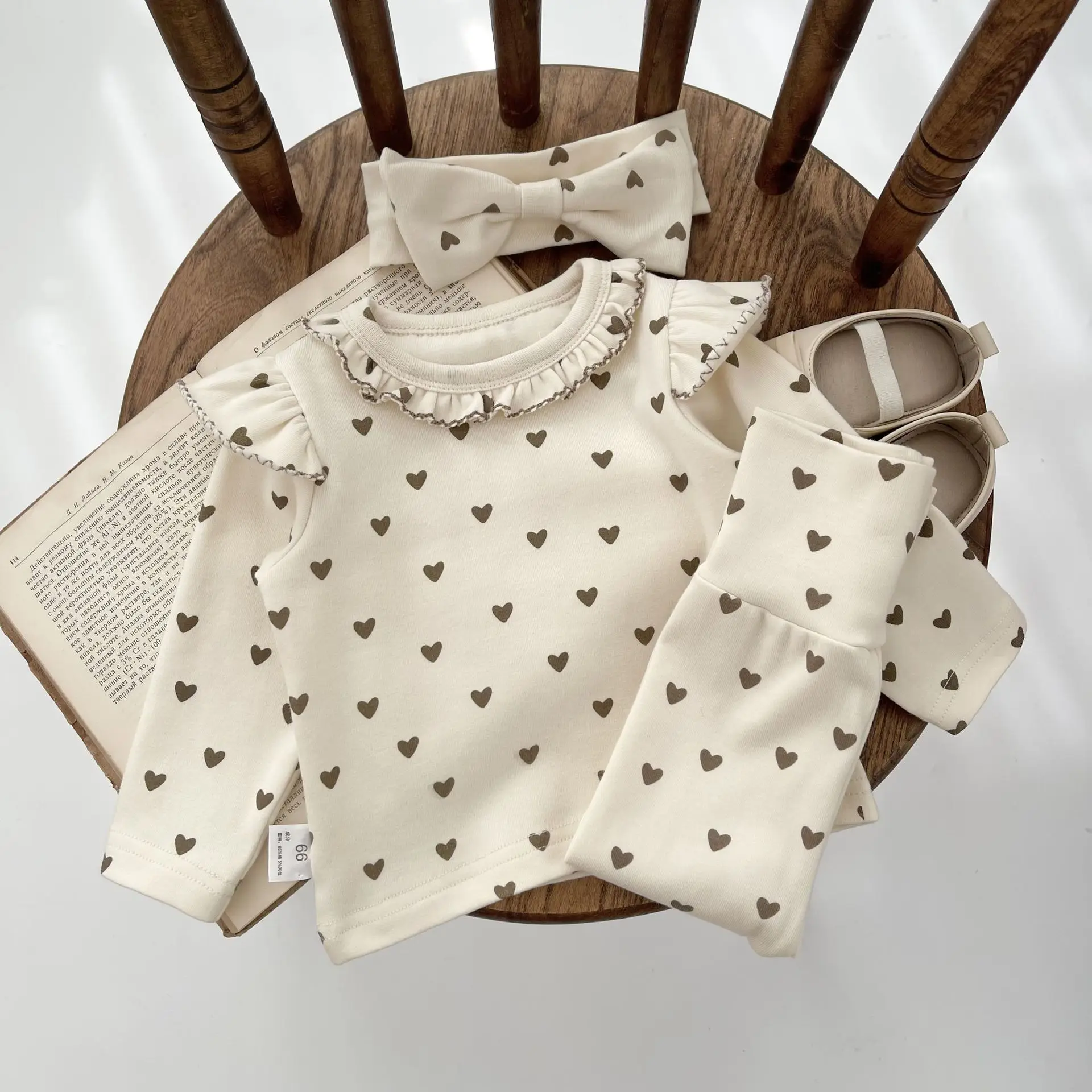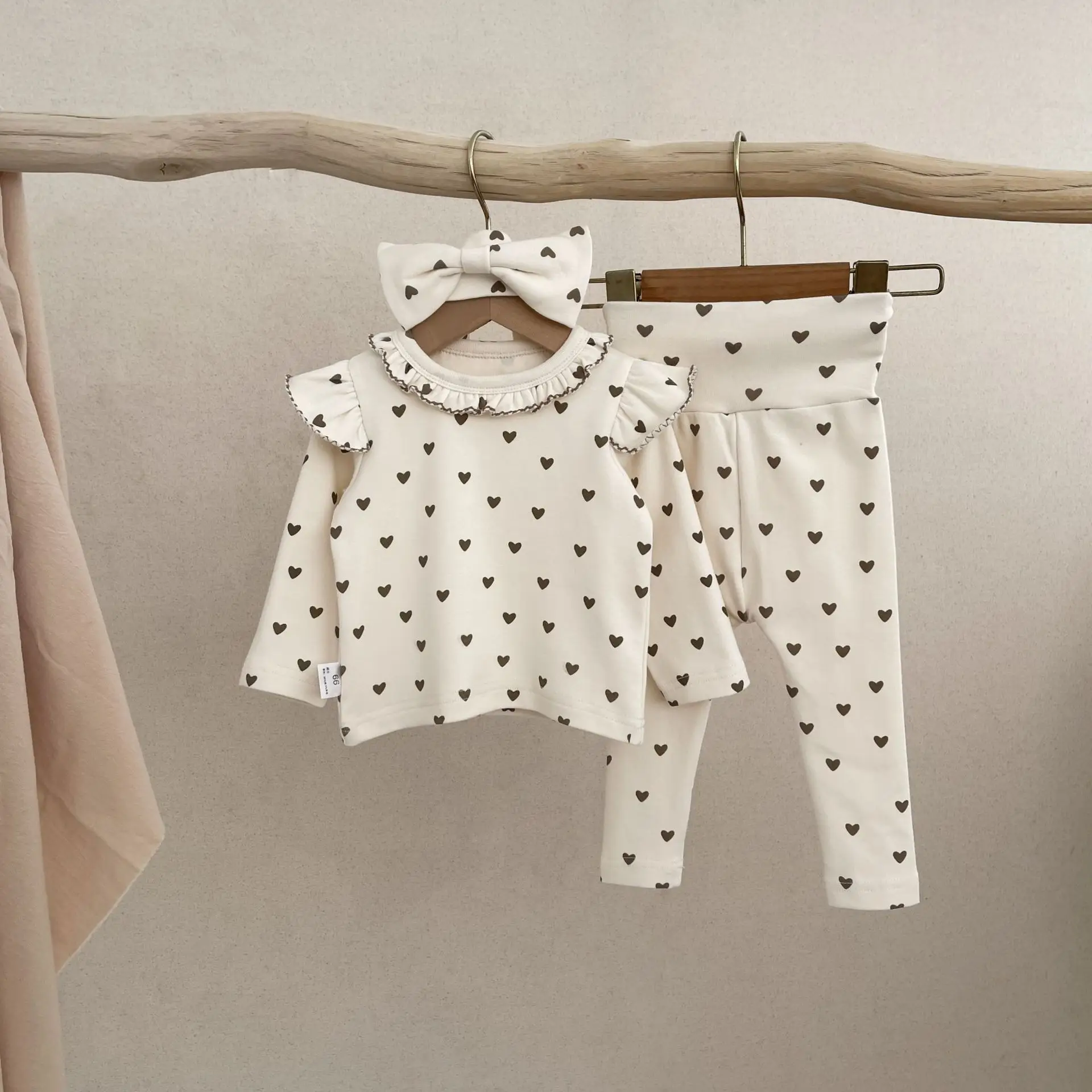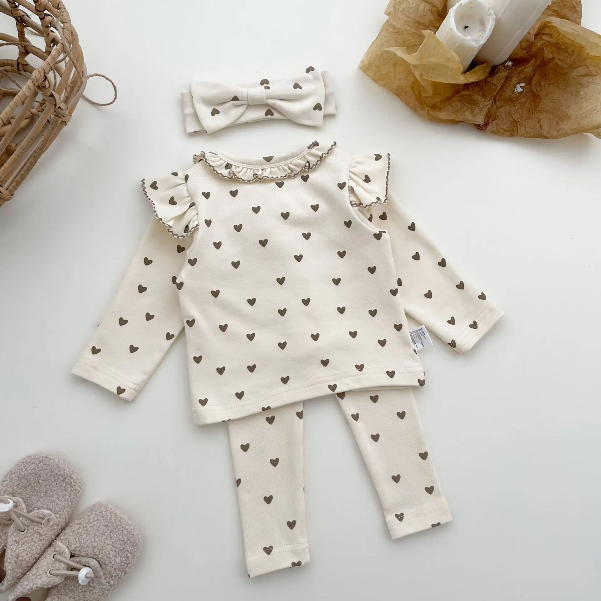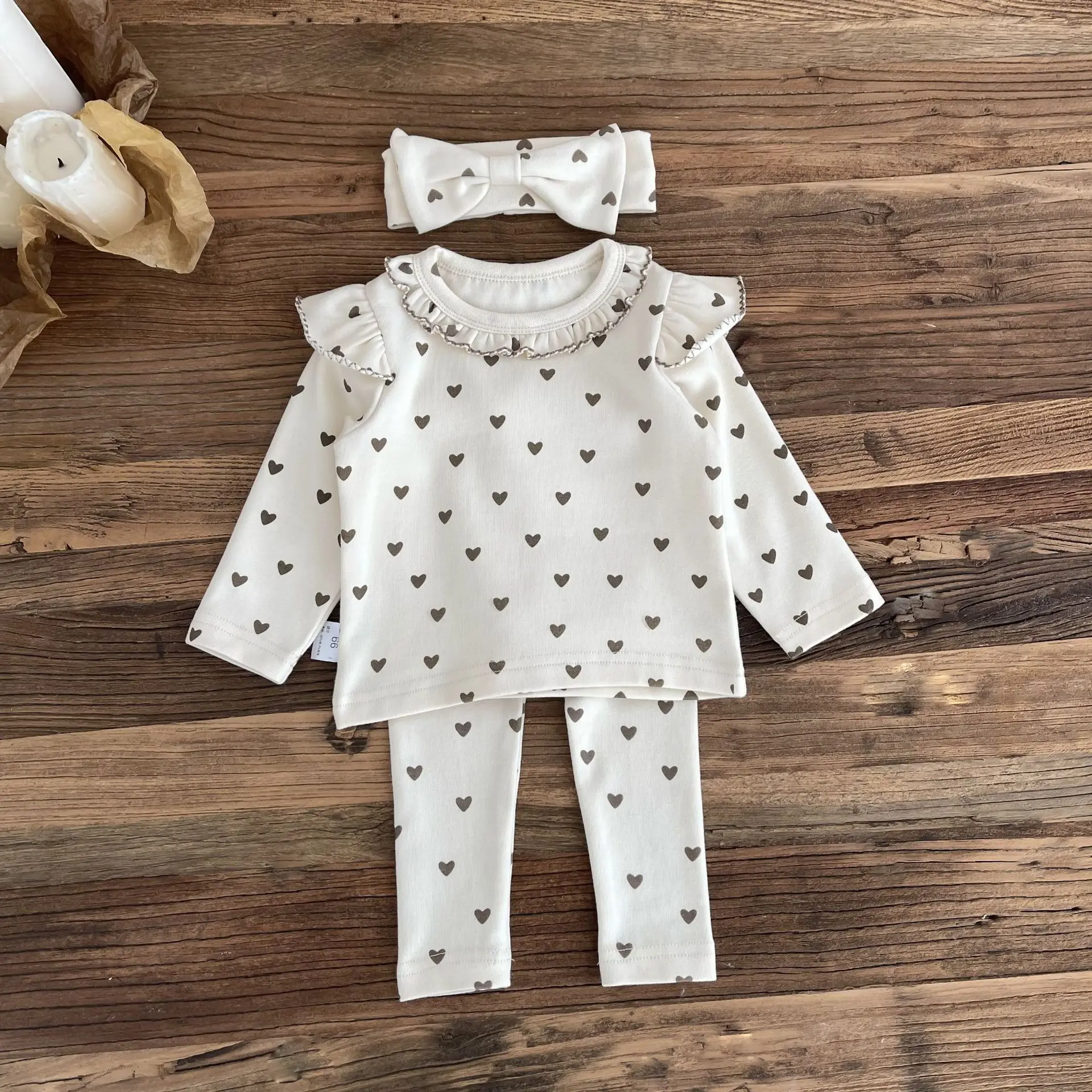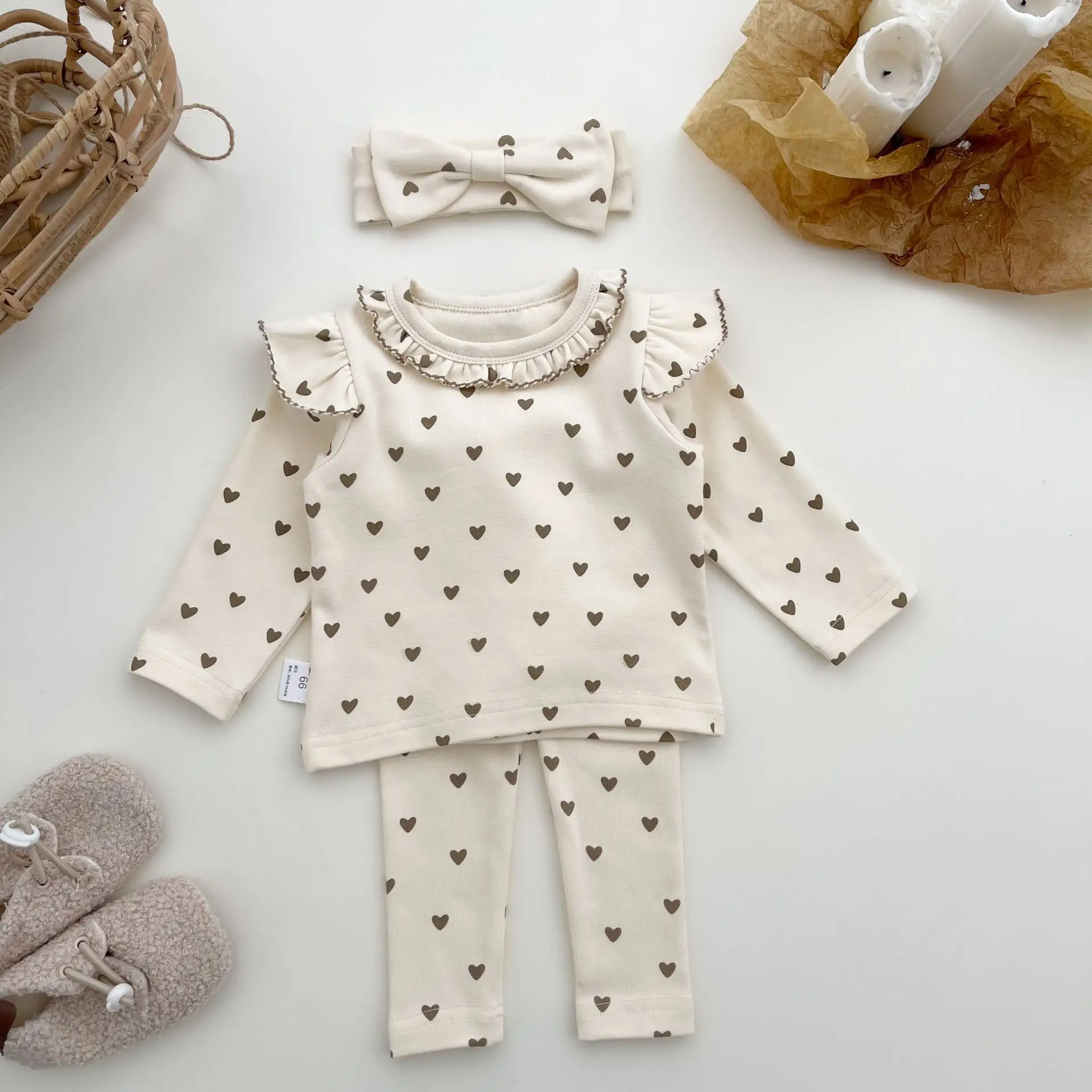 ベビーパジャマセット 長袖ショルダーフリルTシャツ+ロングパンツ+ヘアバンド ハートプリント【mh0006354】