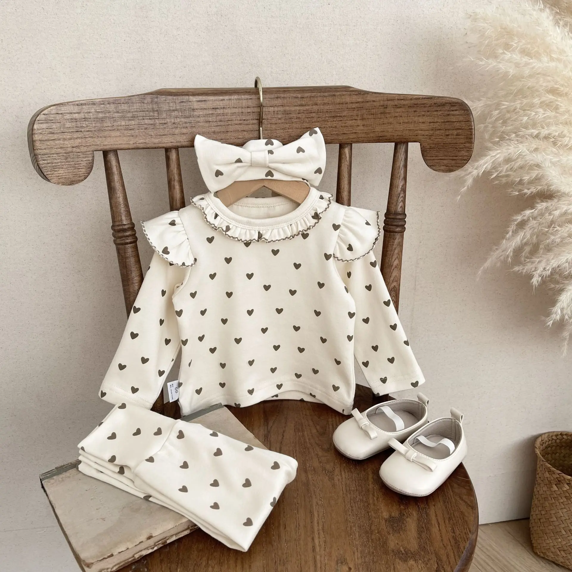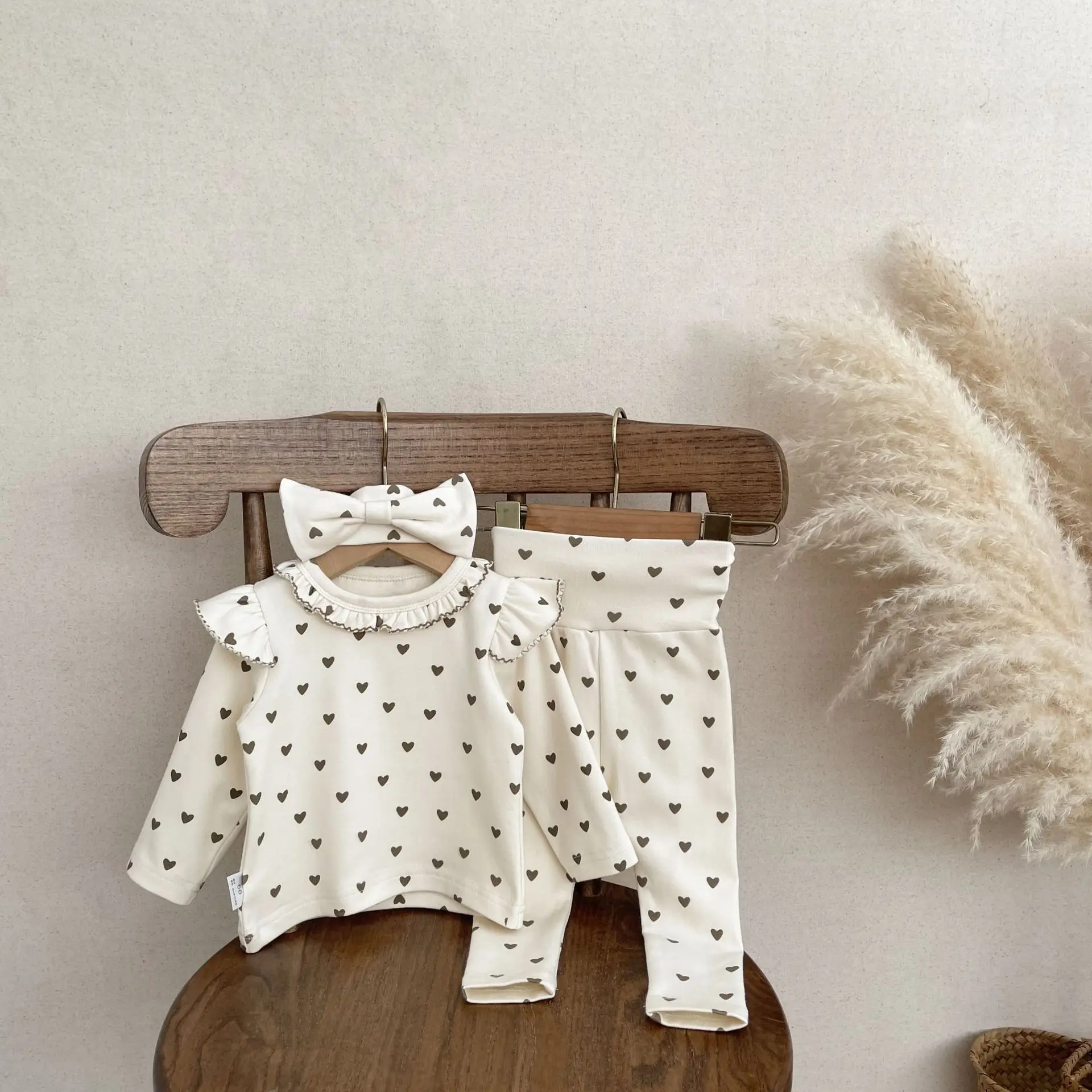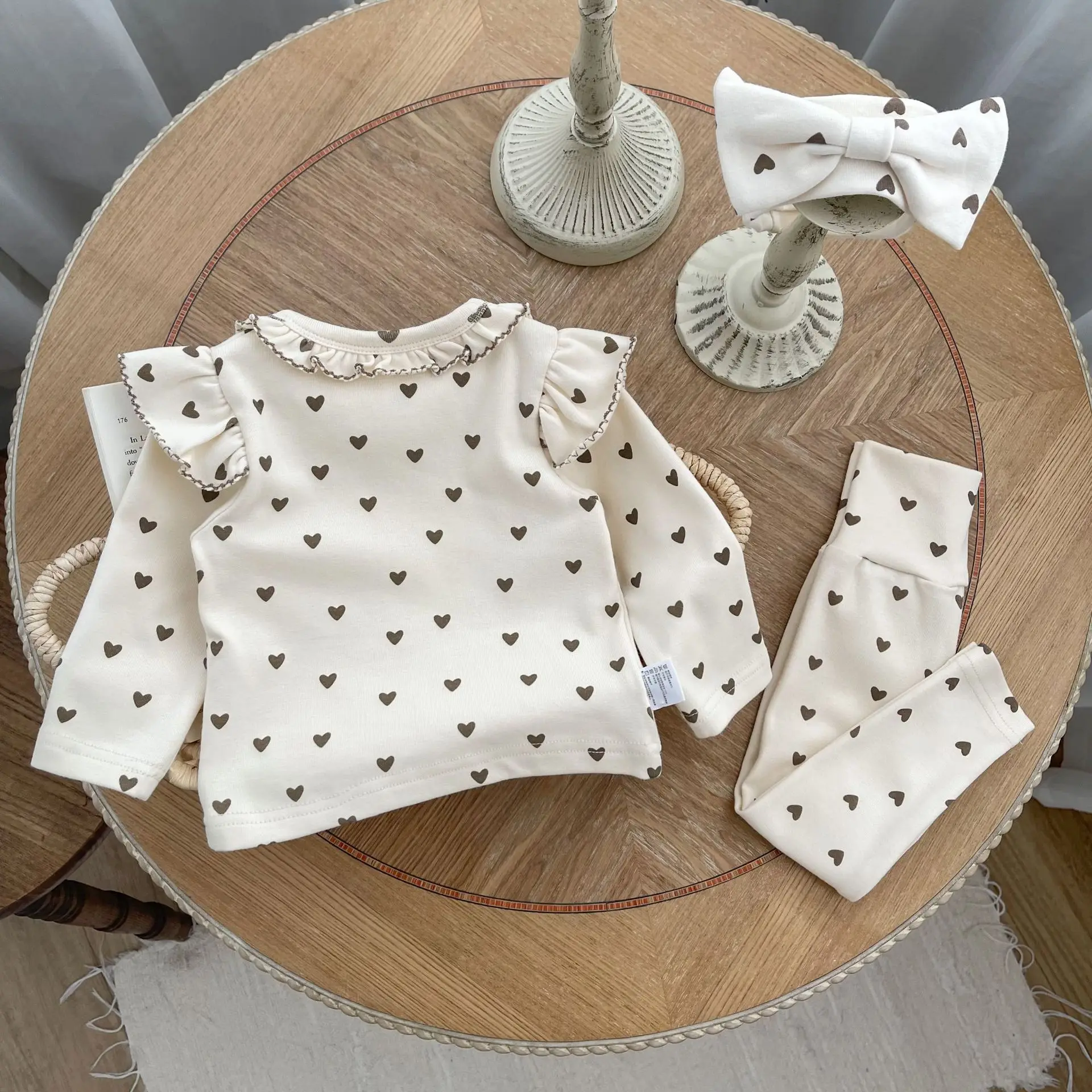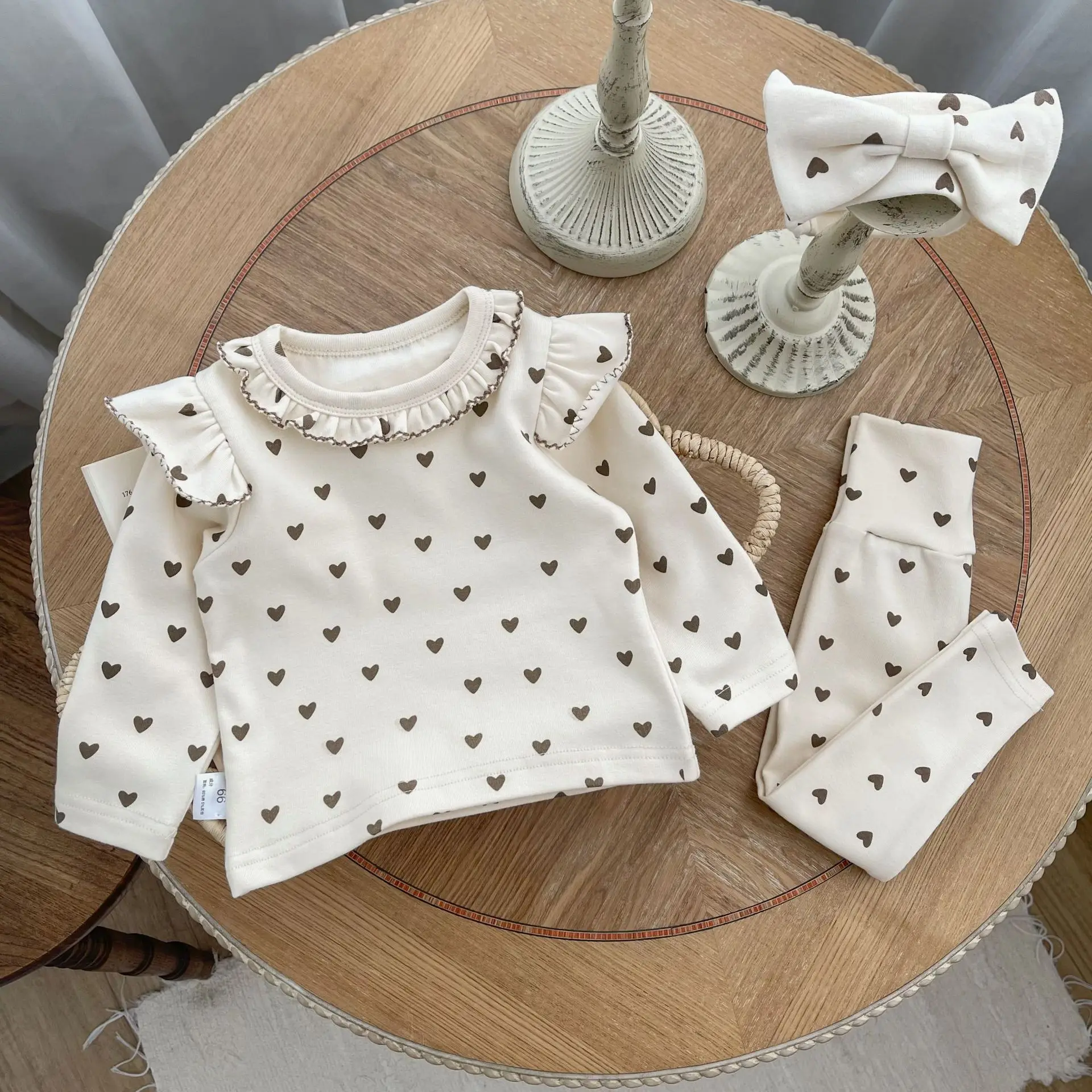 この秋は、赤ちゃんのおうち着にもぴったりなベビーパジャマセットです。長袖のフリル付きTシャツ、ロングパンツ、ヘアバンドの3点セットで、かわいいハートプリントが特徴です。赤ちゃんの繊細な肌にやさしいコットン素材で、快適にお過ごしいただけます。おしゃれで機能的なベビー服をお探しの方におすすめです。