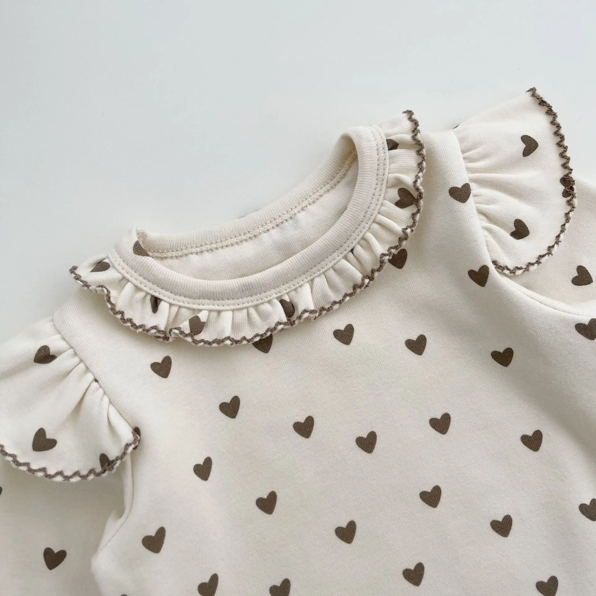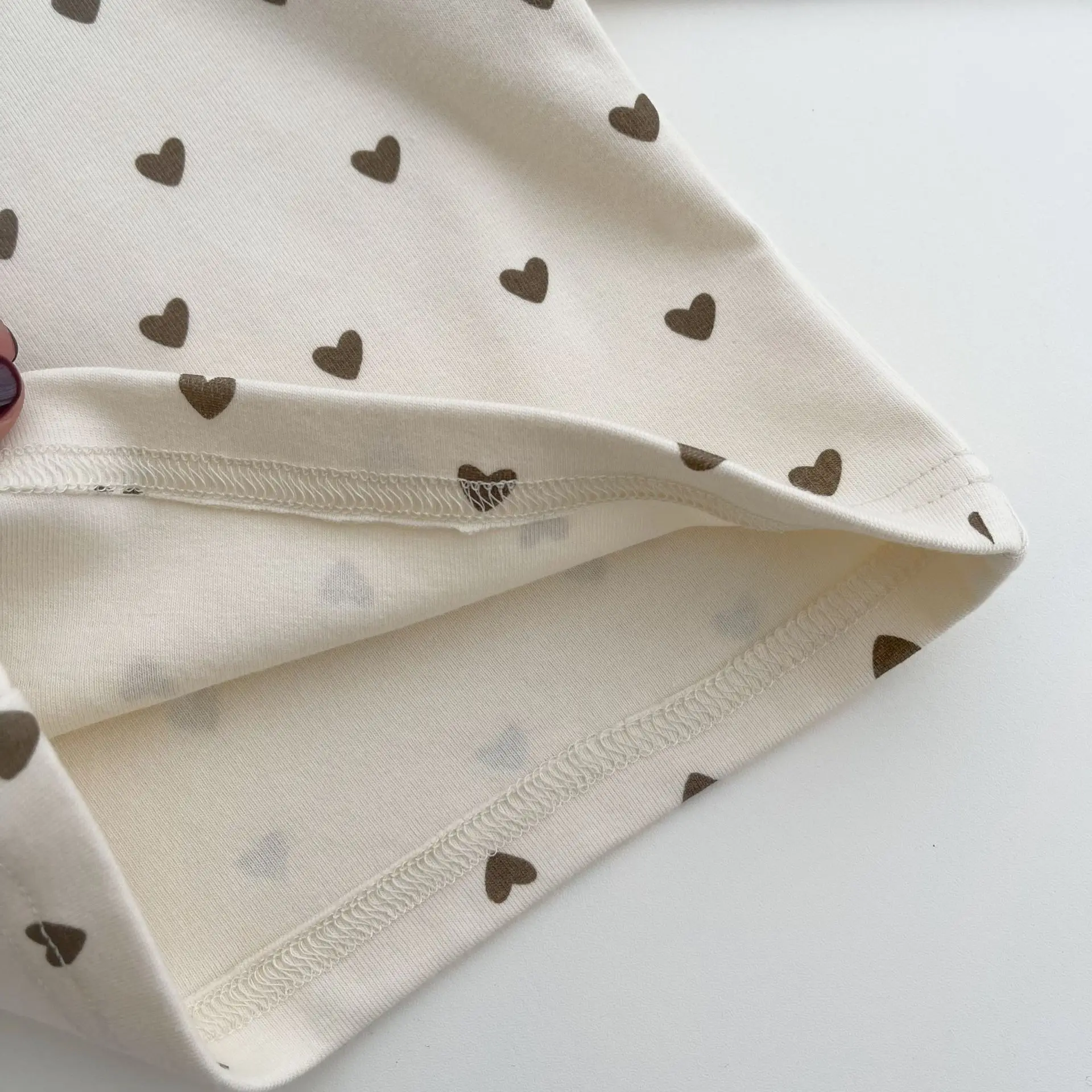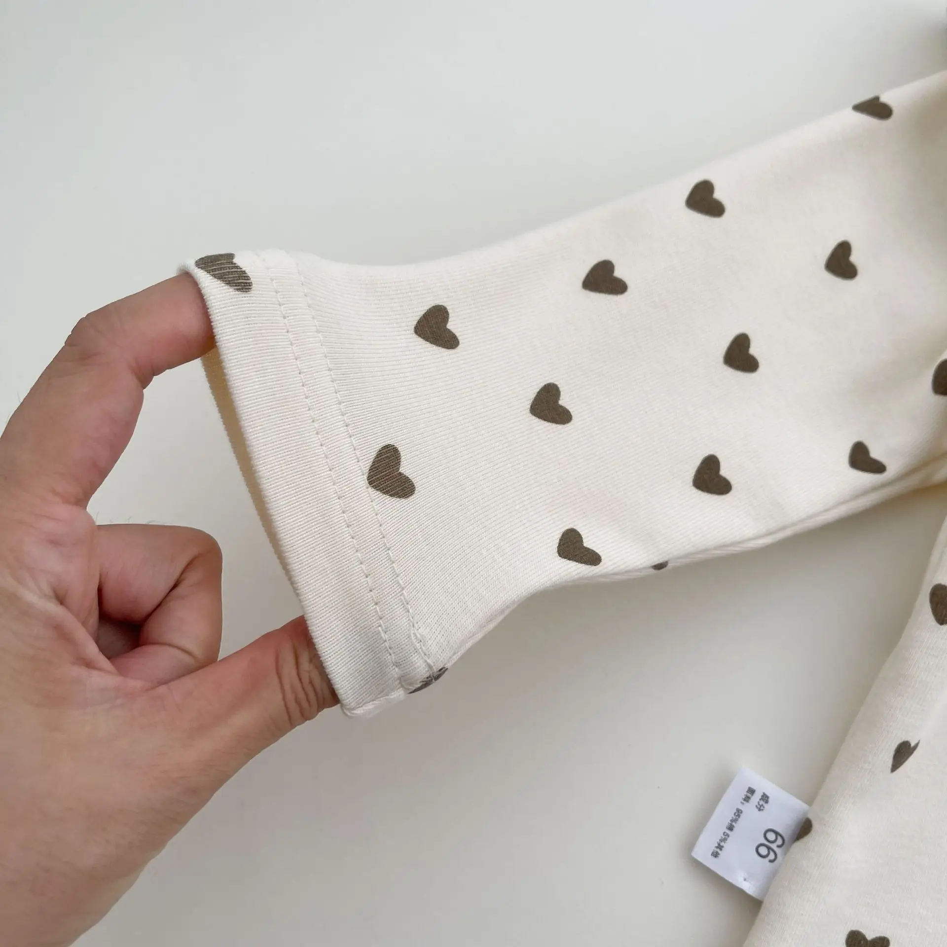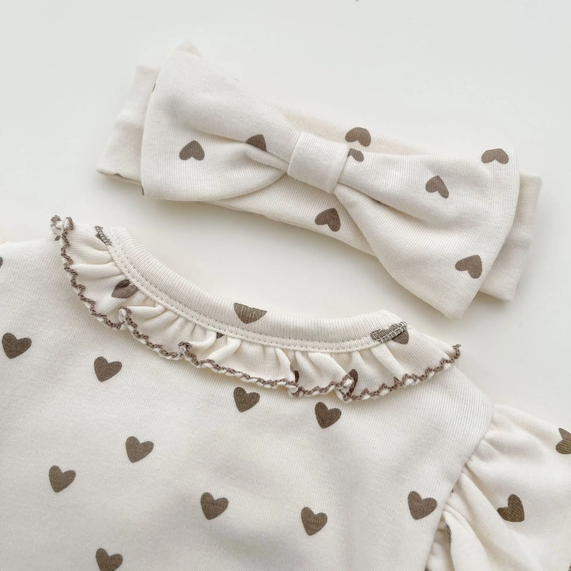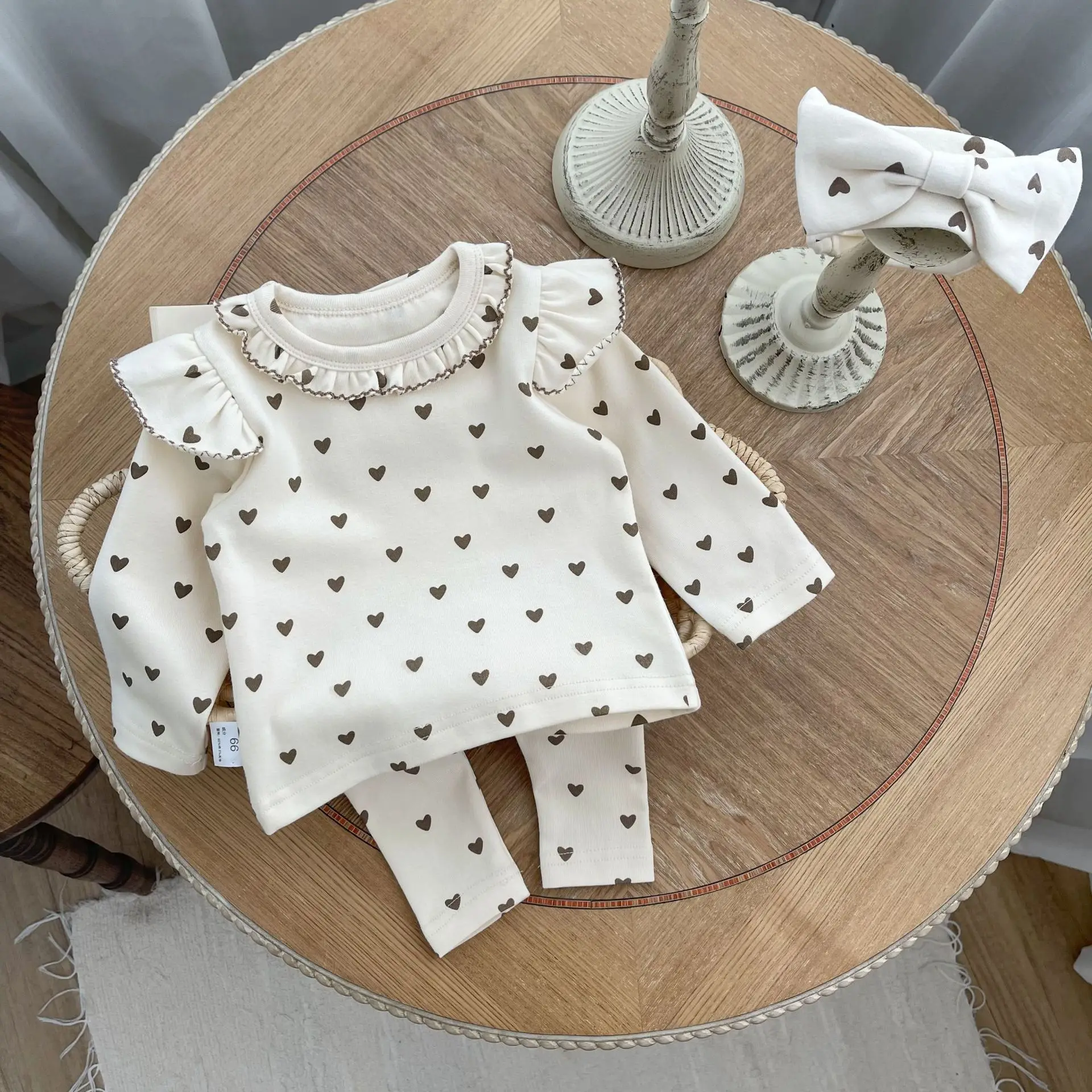 この秋は、赤ちゃんのおうち着にもぴったりなベビーパジャマセットです。長袖のフリル付きTシャツ、ロングパンツ、ヘアバンドの3点セットで、かわいいハートプリントが特徴です。赤ちゃんの繊細な肌にやさしいコットン素材で、快適にお過ごしいただけます。おしゃれで機能的なベビー服をお探しの方におすすめです。