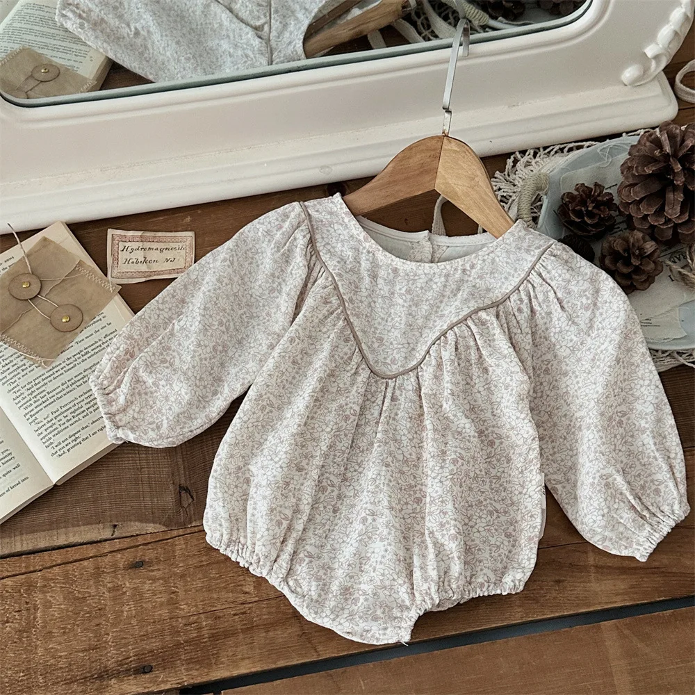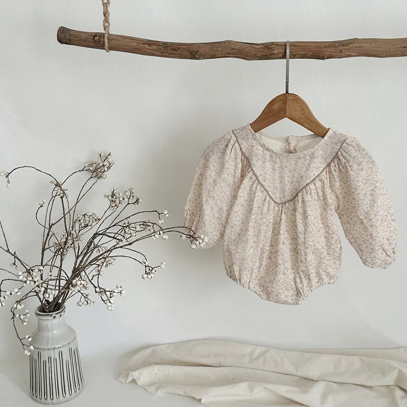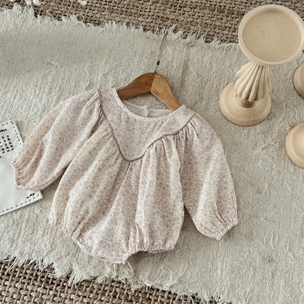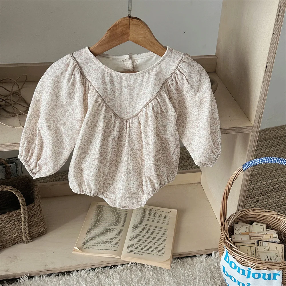 花柄プリントが施された、高級感漂うベビーロンパース。柔らかなコットン素材で、赤ちゃんの肌に優しくフィットします。この秋からの新しいベビー用長袖ボディスーツは、可愛らしさと快適さを兼ね備えた、赤ちゃんにぴったりのアイテムです。