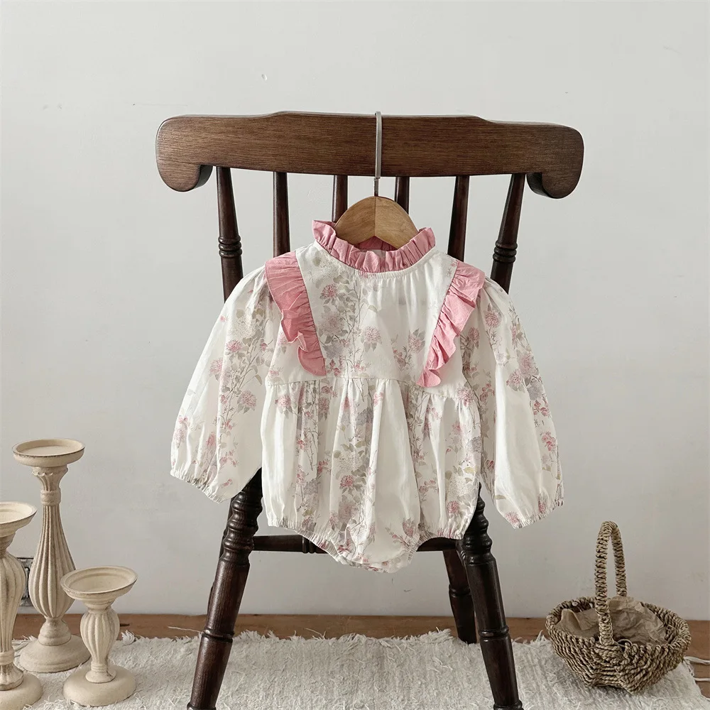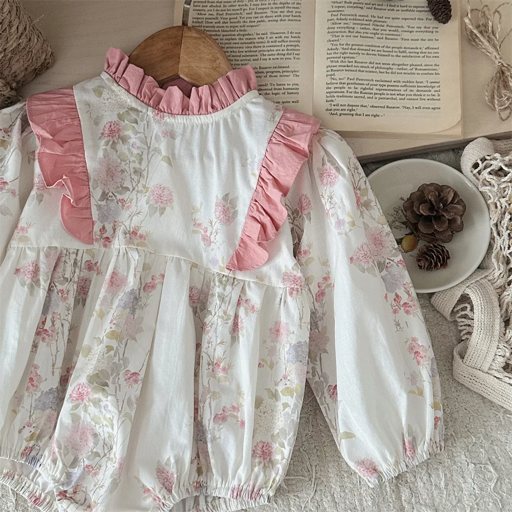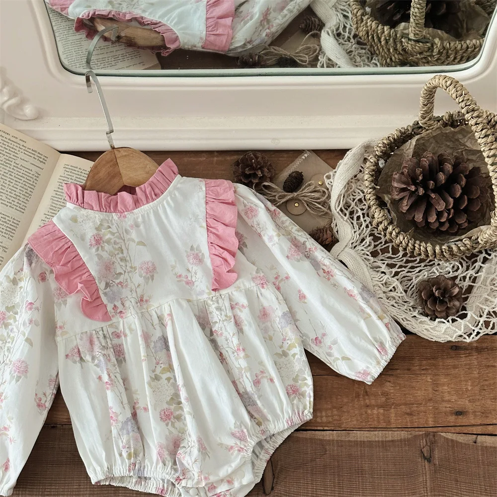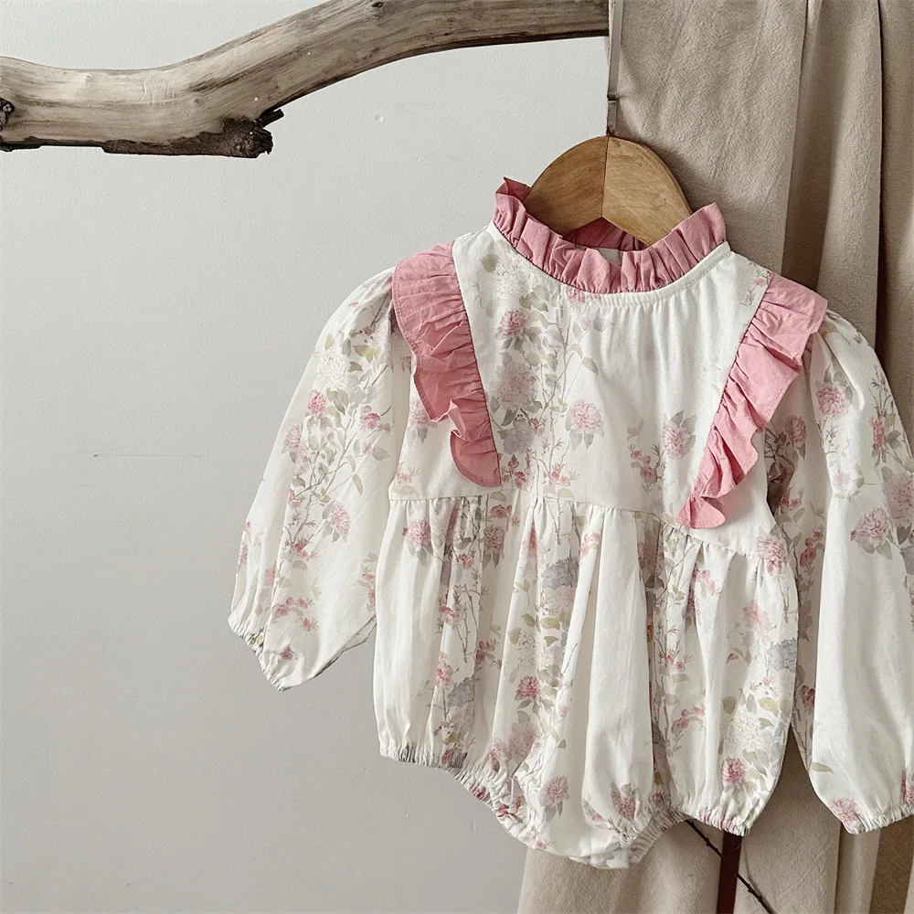 この秋新作の赤ちゃんのための可愛らしいロンパース。長袖で暖かく、お花の柄がとても華やかです。肌に優しいコットン製で、女の子らしいフリルやレースが可愛らしさを引き立たせます。甘いプリンセスのように着飾ることができる、贅沢な一着です。