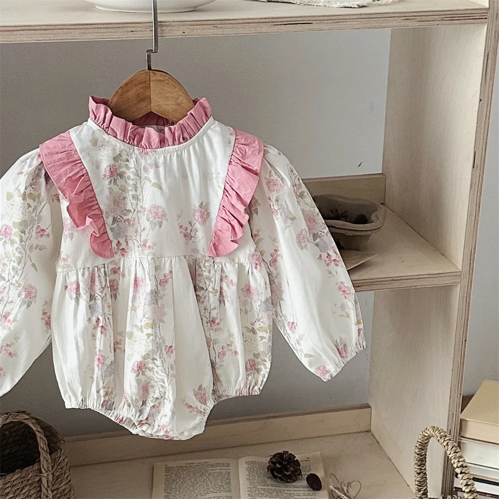ベビーロンパース 長袖ボディスーツ ショルダーフリル フリルスタンドカラー フラワー花柄プリント【mh0006388】
