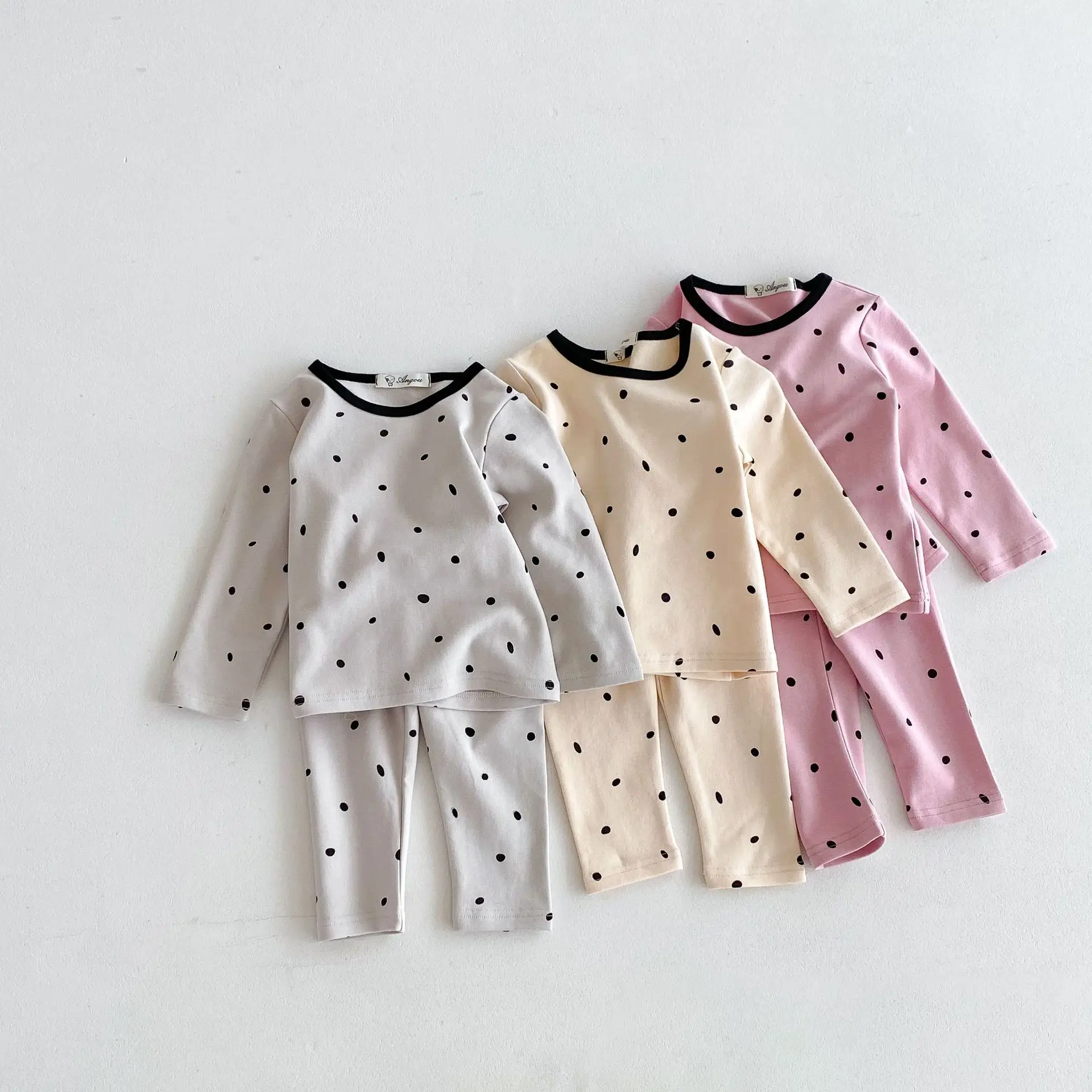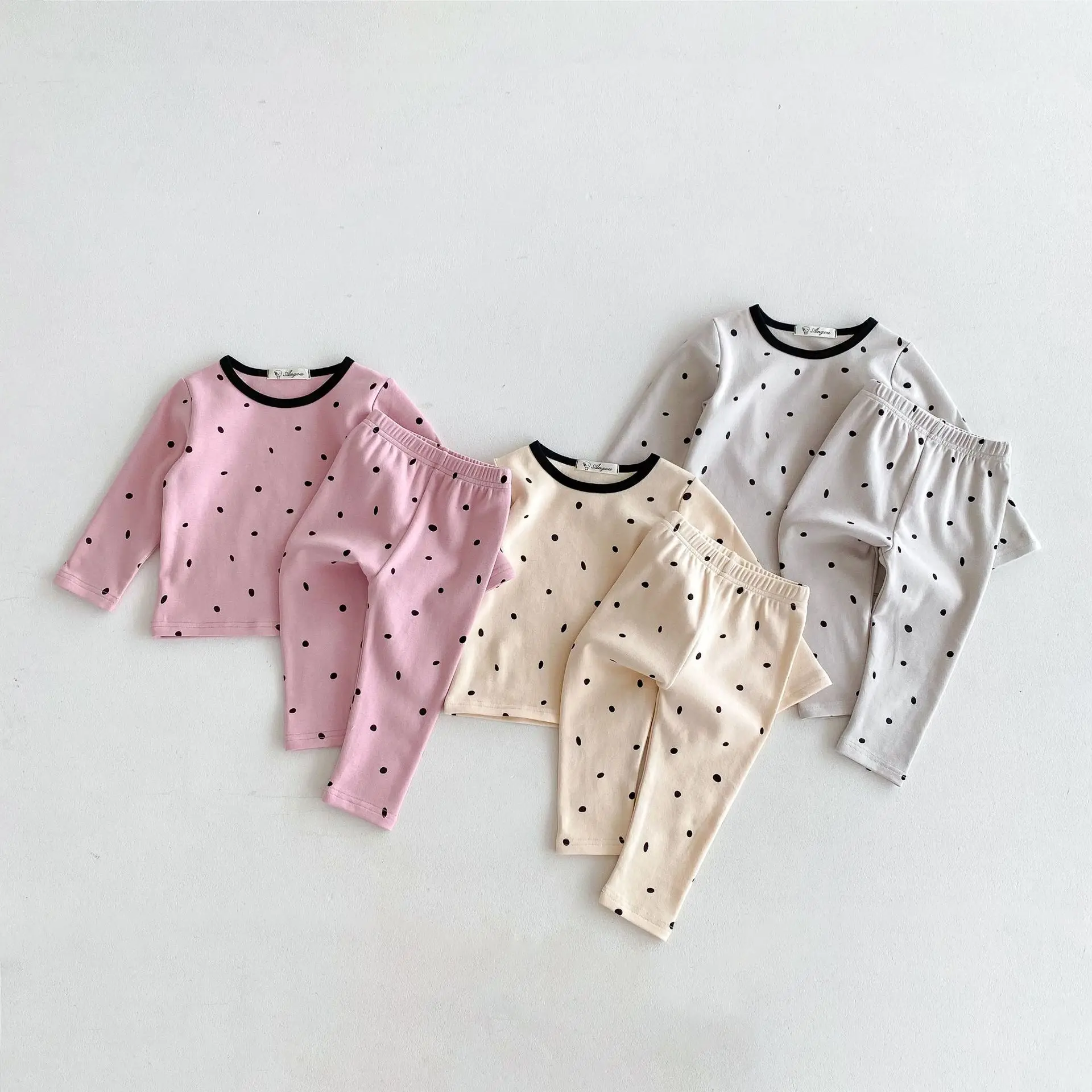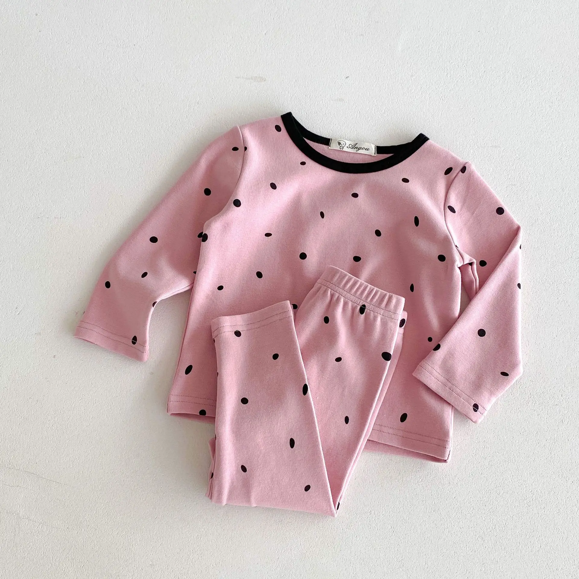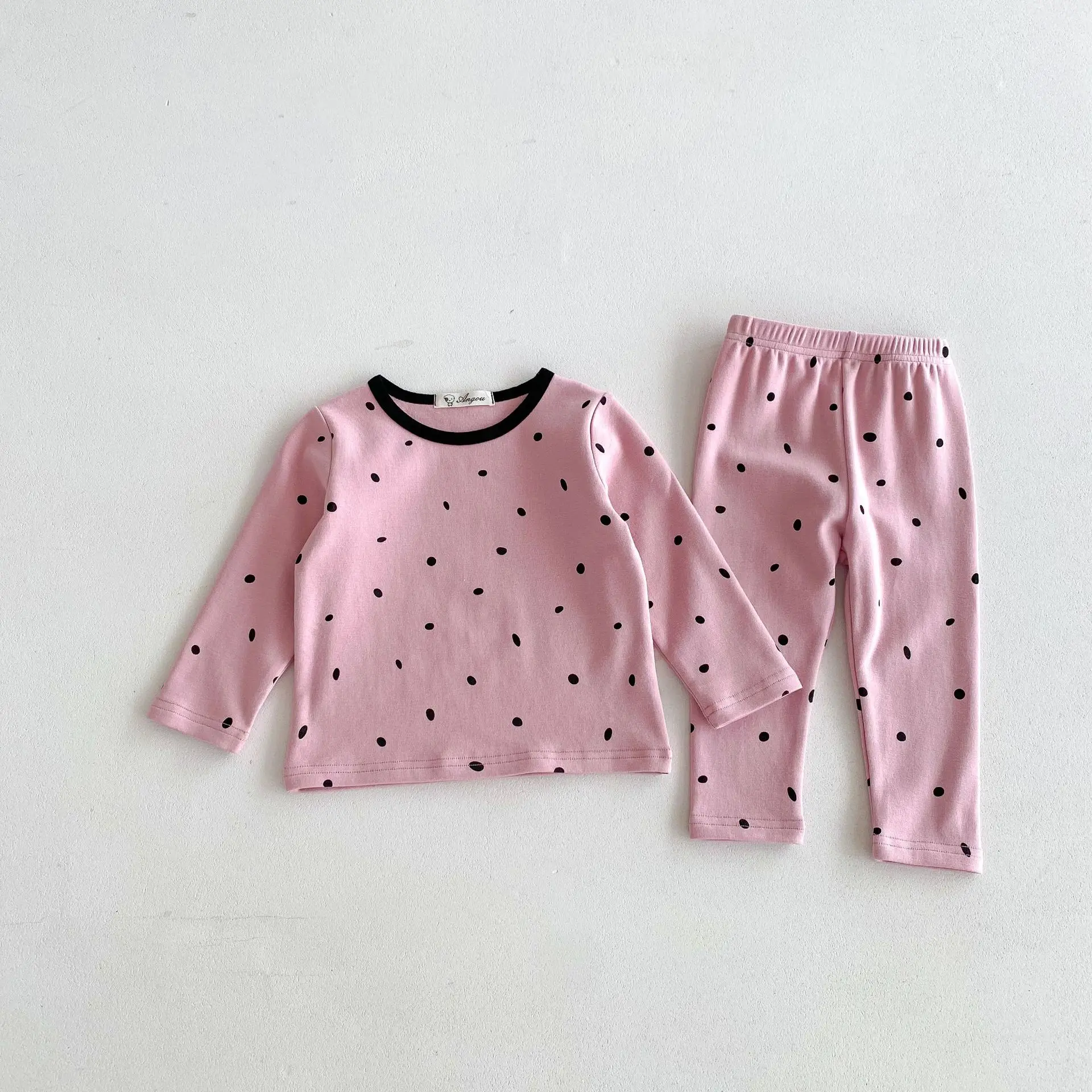 キッズパジャマセット 長袖Tシャツ+ロングパンツ 水玉ドットプリント ルームウェア 3カラー【mh0006647】